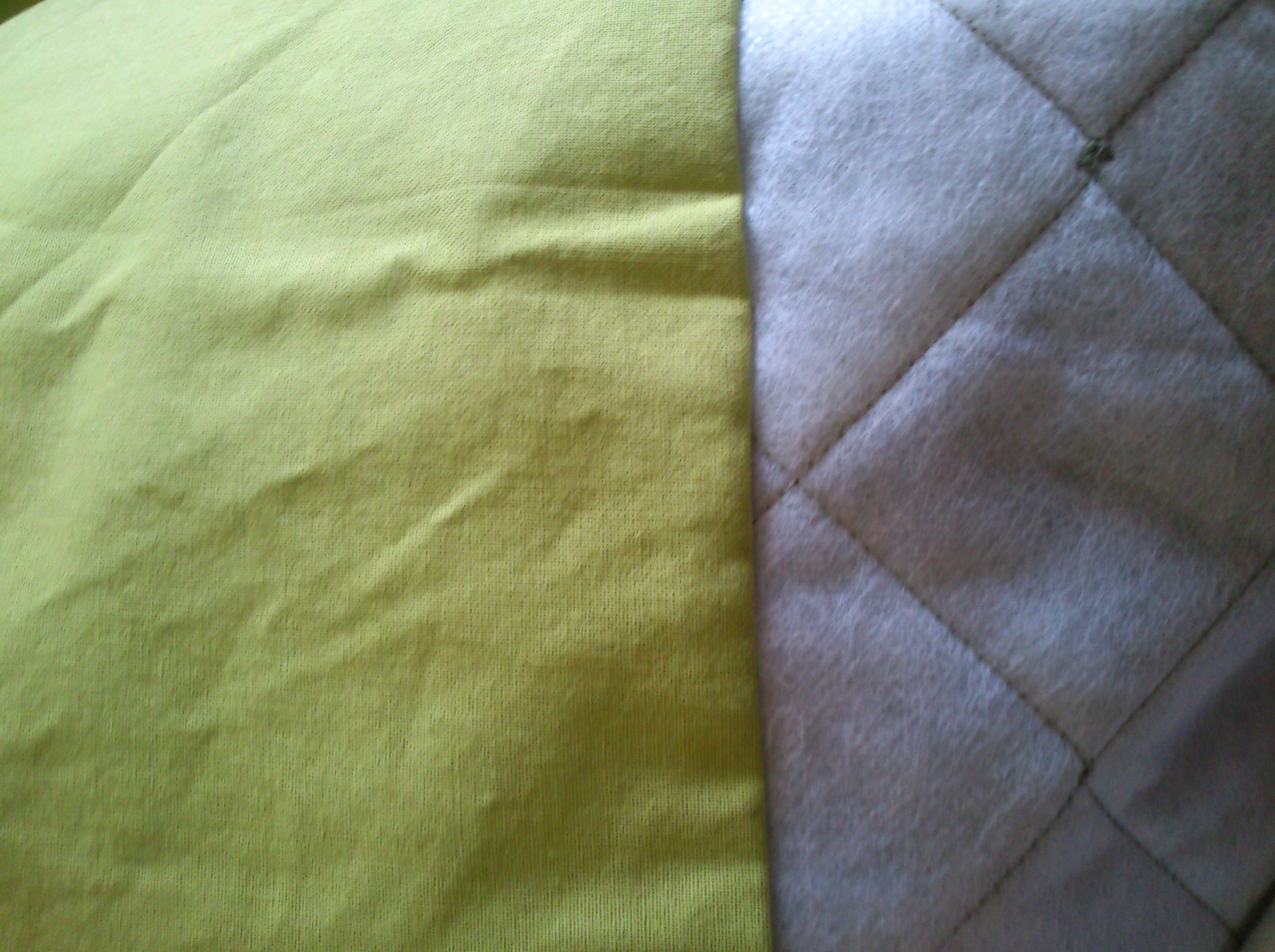 Fabric: 2 m of green pre-quilted polyester taffeta, I also used about 0,5 m of plain green cotton weave for the hem facing.