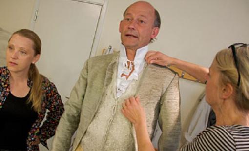 Costume fittings with tailor and costume designer squeesed in to the fitting room.