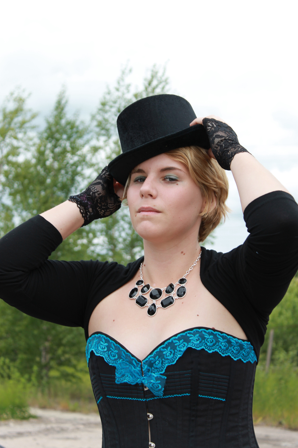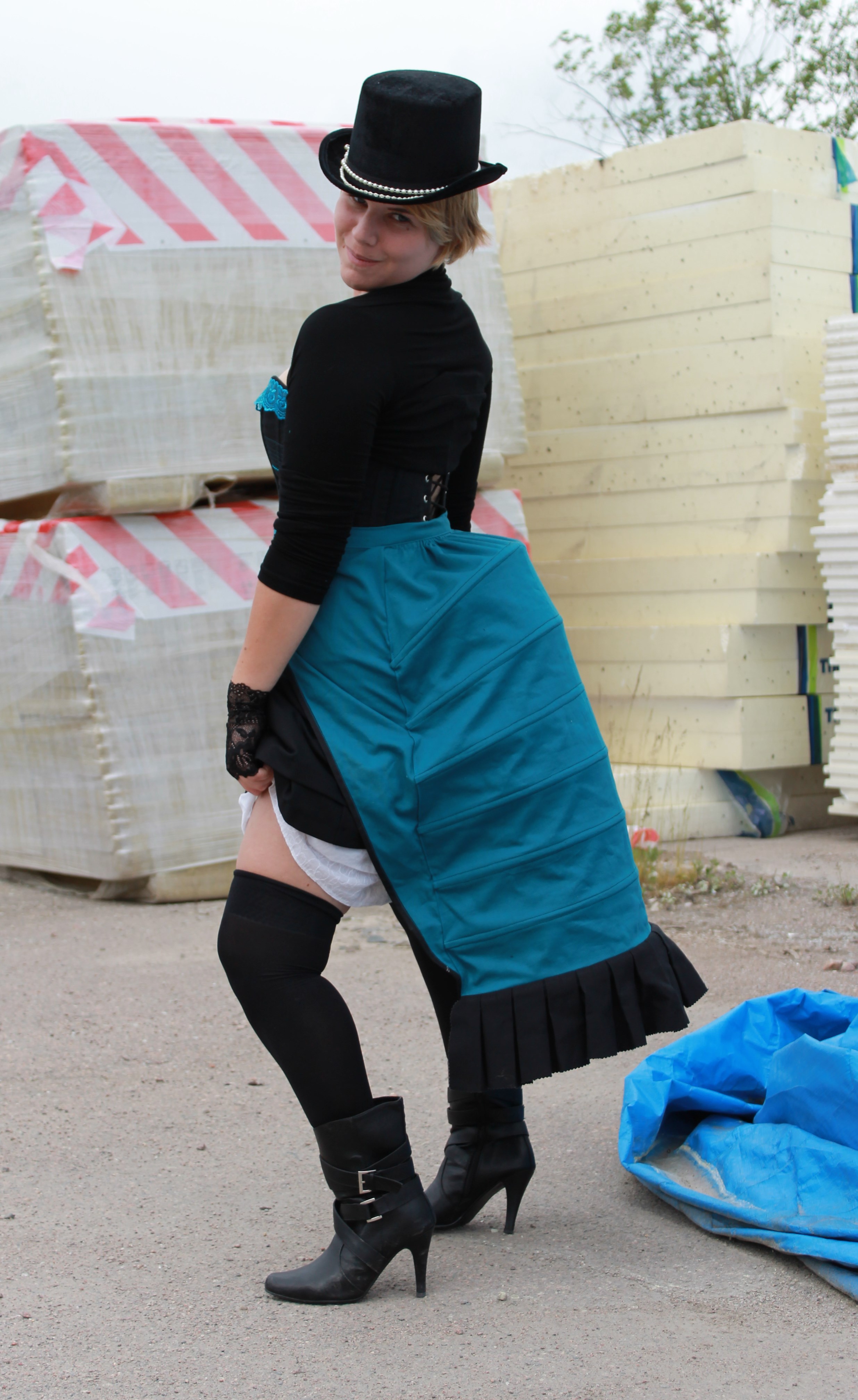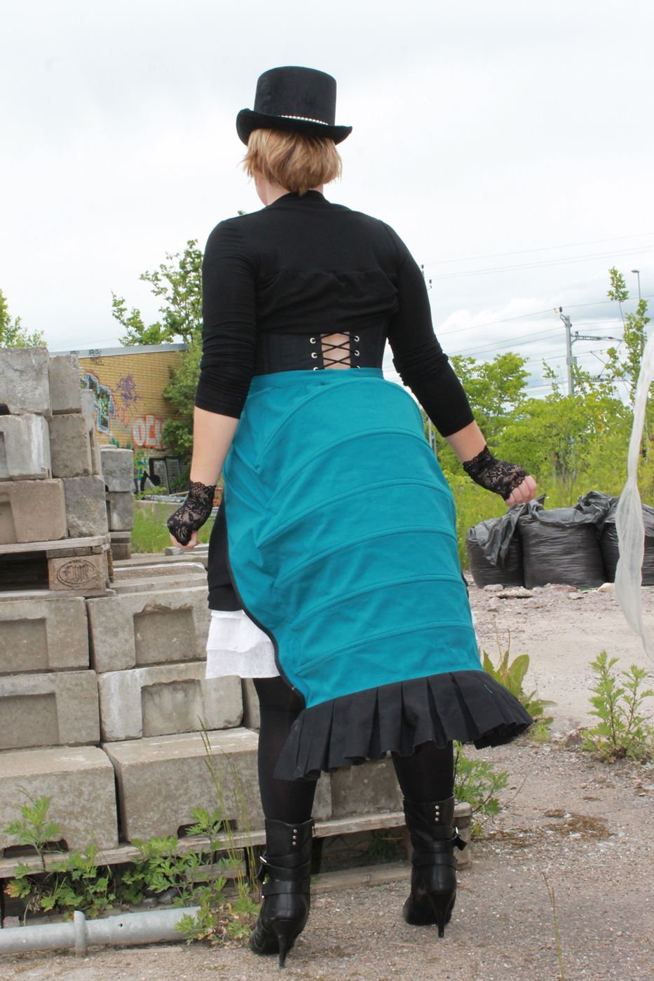 She is wearing: blommers, petticoat, skirt, stockings, corset, bustle, high heeled boots, bolero-shrug, lace mittens, necklace and a hat. All of the accesories and stylings came from our closets (except for the mits which I bought for the shoot).