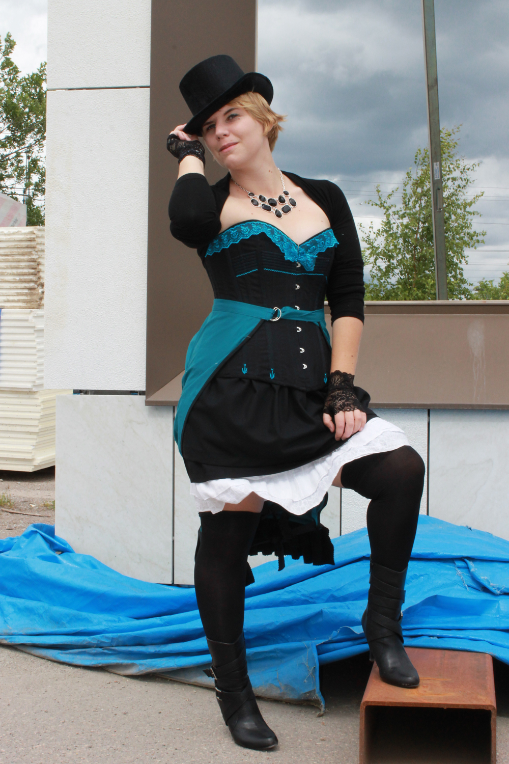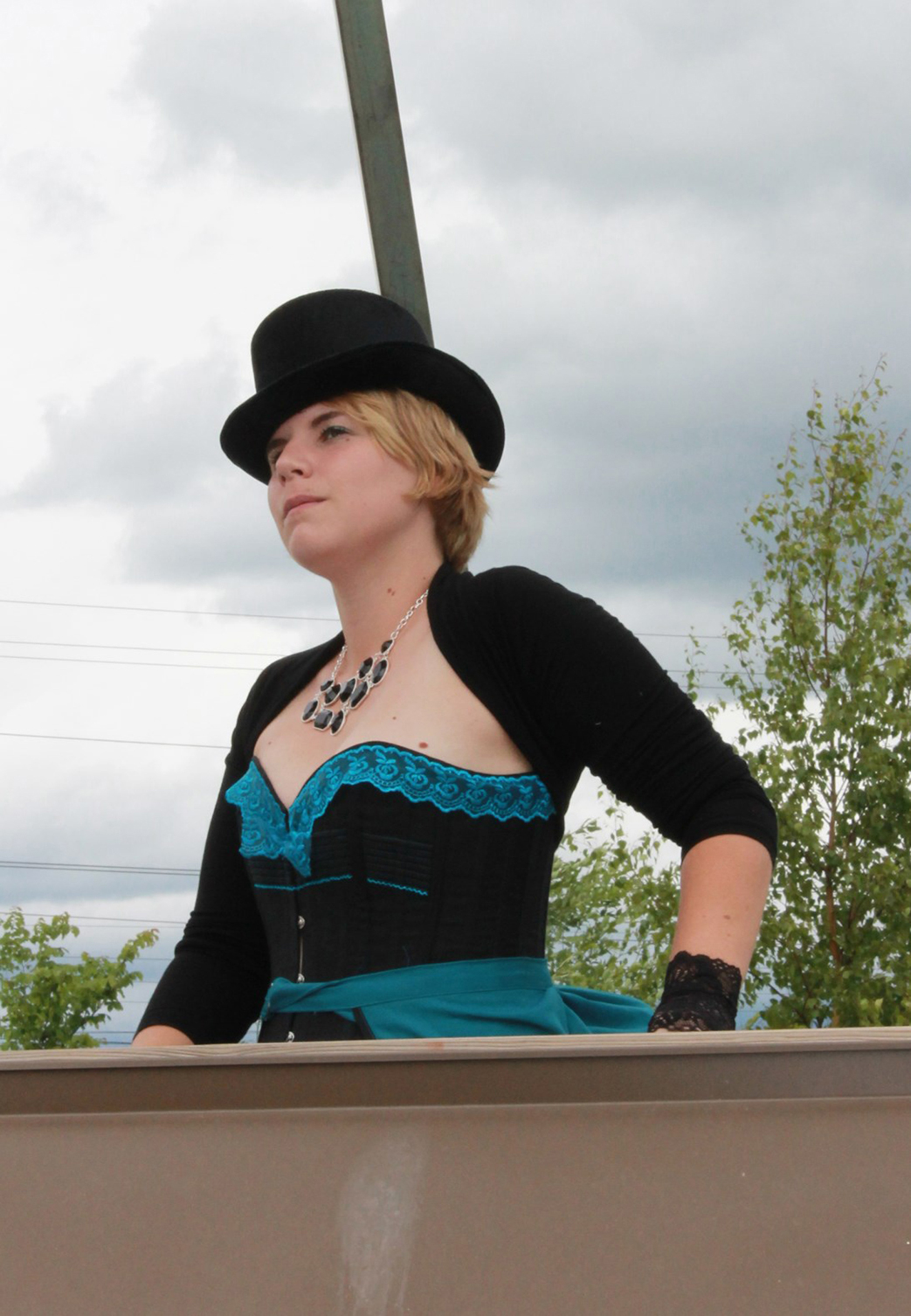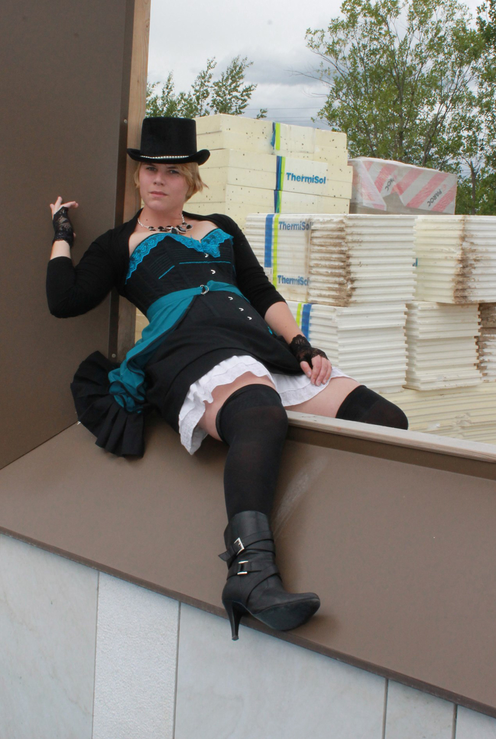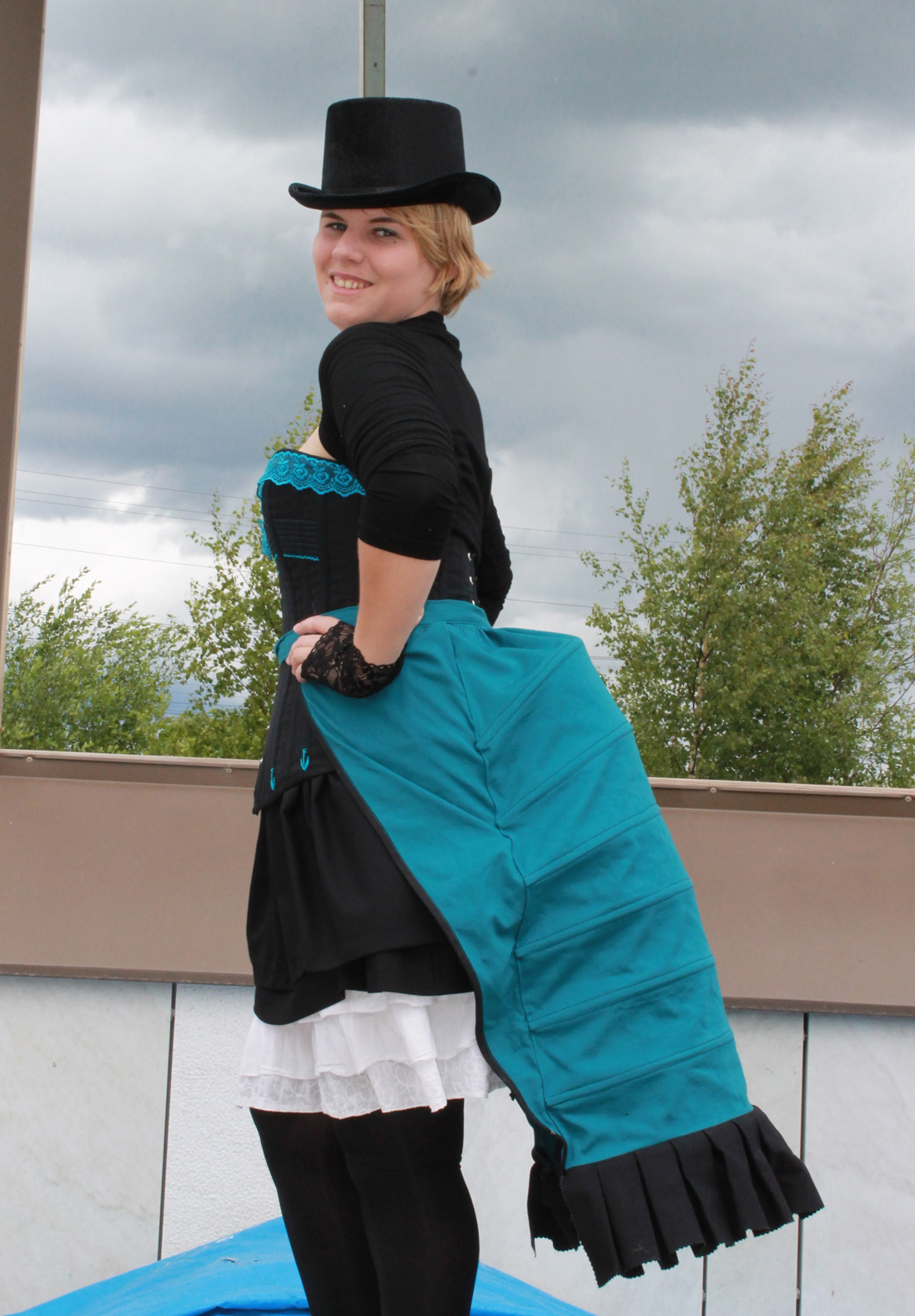 She is wearing: blommers, petticoat, skirt, stockings, corset, bustle, high heeled boots, bolero-shrug, lace mittens, necklace and a hat. All of the accesories and stylings came from our closets (except for the mits which I bought for the shoot).