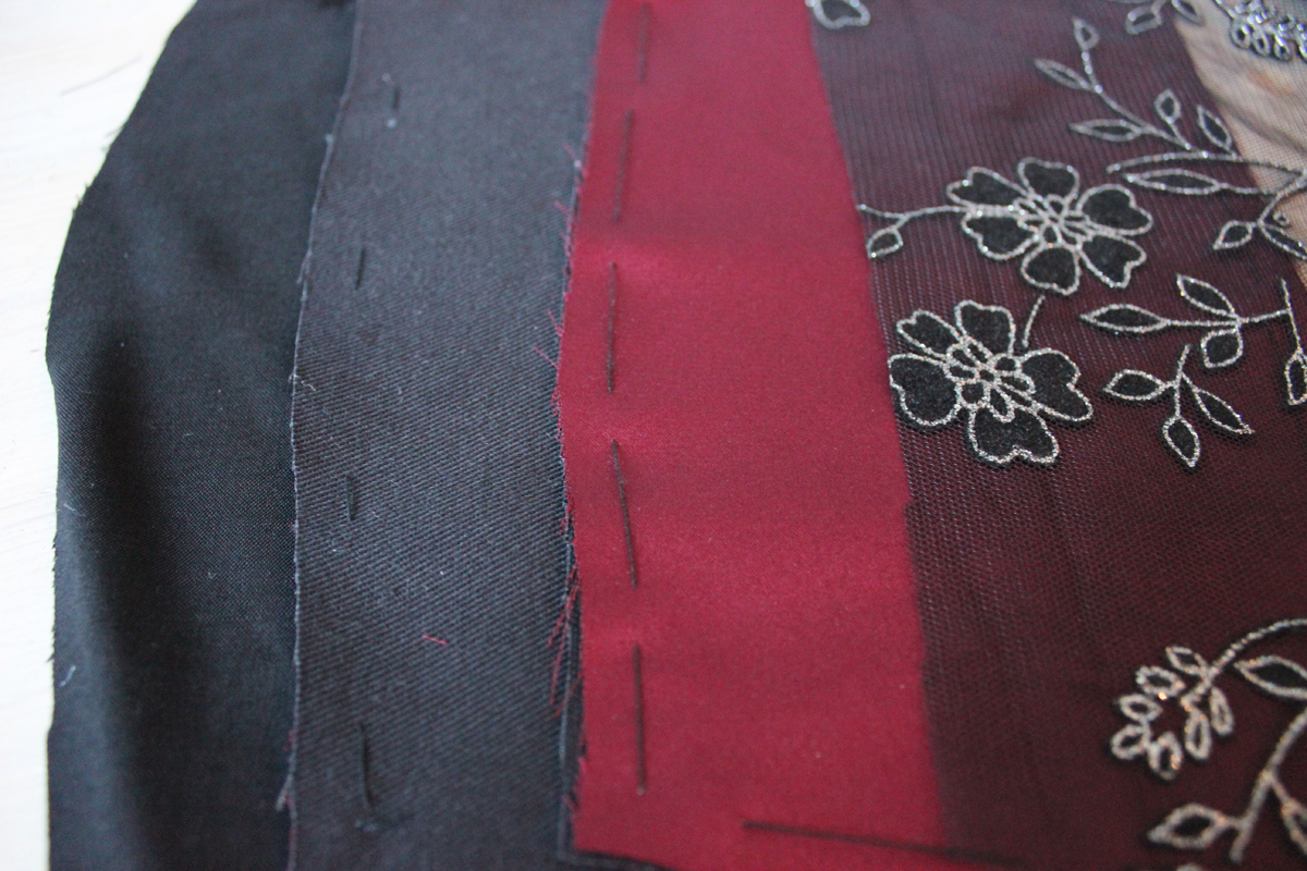 I cut the fabric for the skirts (black and red) and the bodice (just red). I then searched my stash and found a piece of black twill, leftover from the Laced corset, to interline the bodice. I also found a very small amount of soft black viscose for the bodice lining. Then I stroke luck a third time and found a piece of lightweight black chiffong for the little sleevecap. Sometimes it is good to be a maniac and save all the little pieces of leftovers.