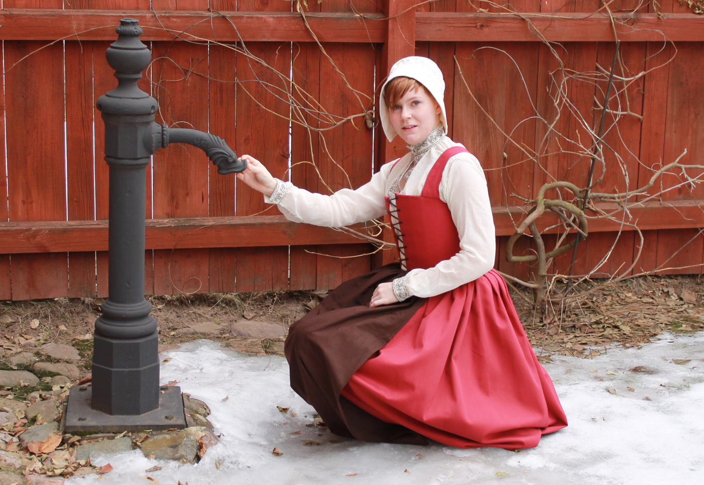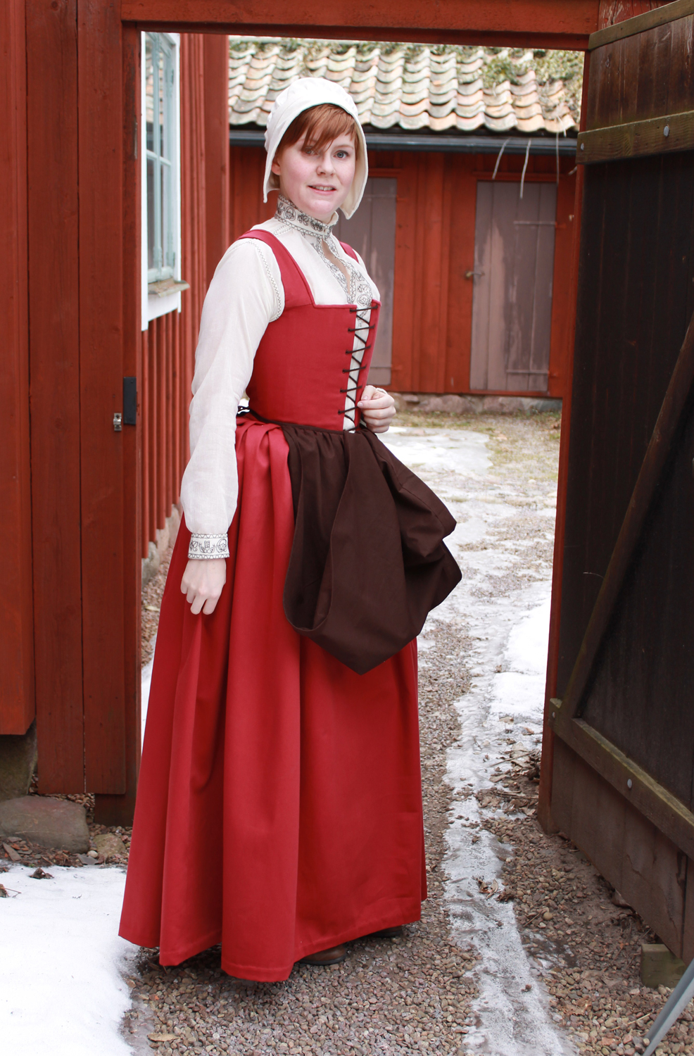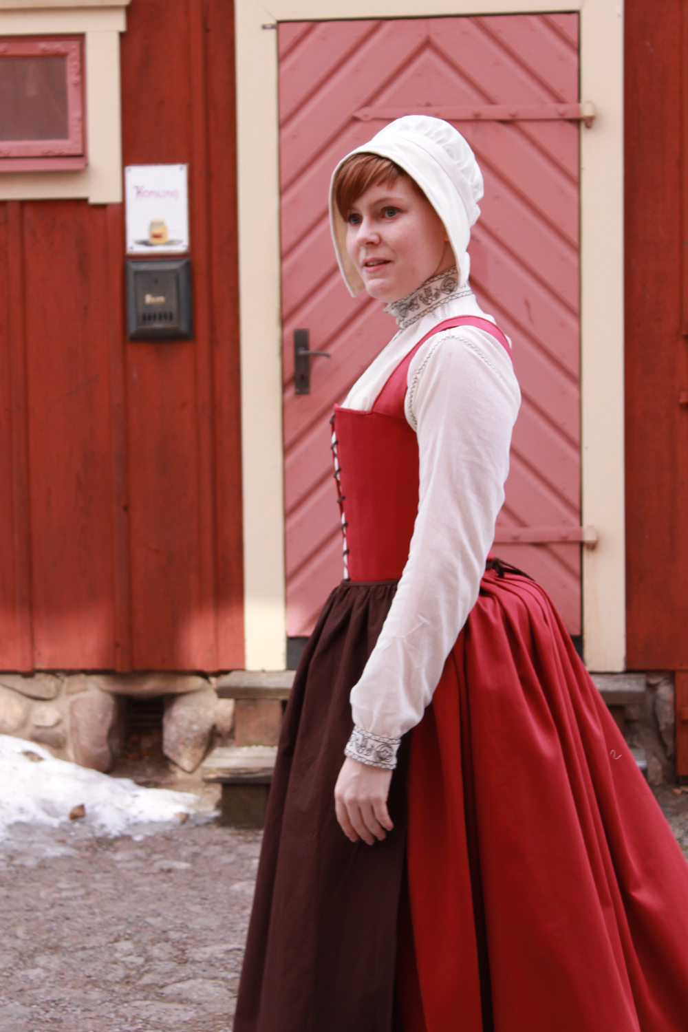 Historical accurate: Pretty good (exept for the cotton fabrics, which should have been wool and linnen). Lots of handsewing and historical methodes where used. The Apron and Coif are totaly handmade, and so are all the visual seams on the Kirtle.