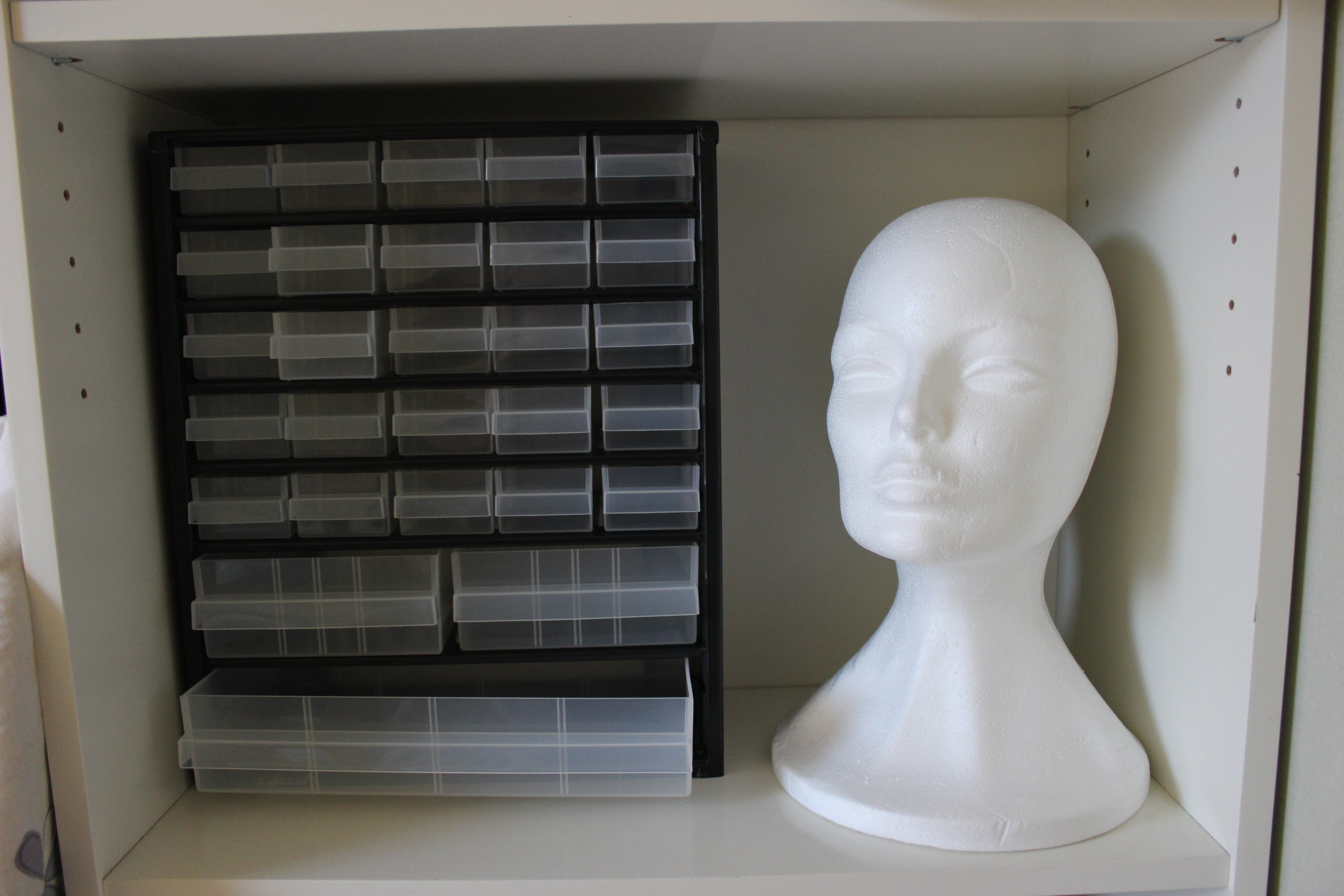 A cheap bookshell for varyous sewing tings, and boxes of tooles and fabric. All within close reach.