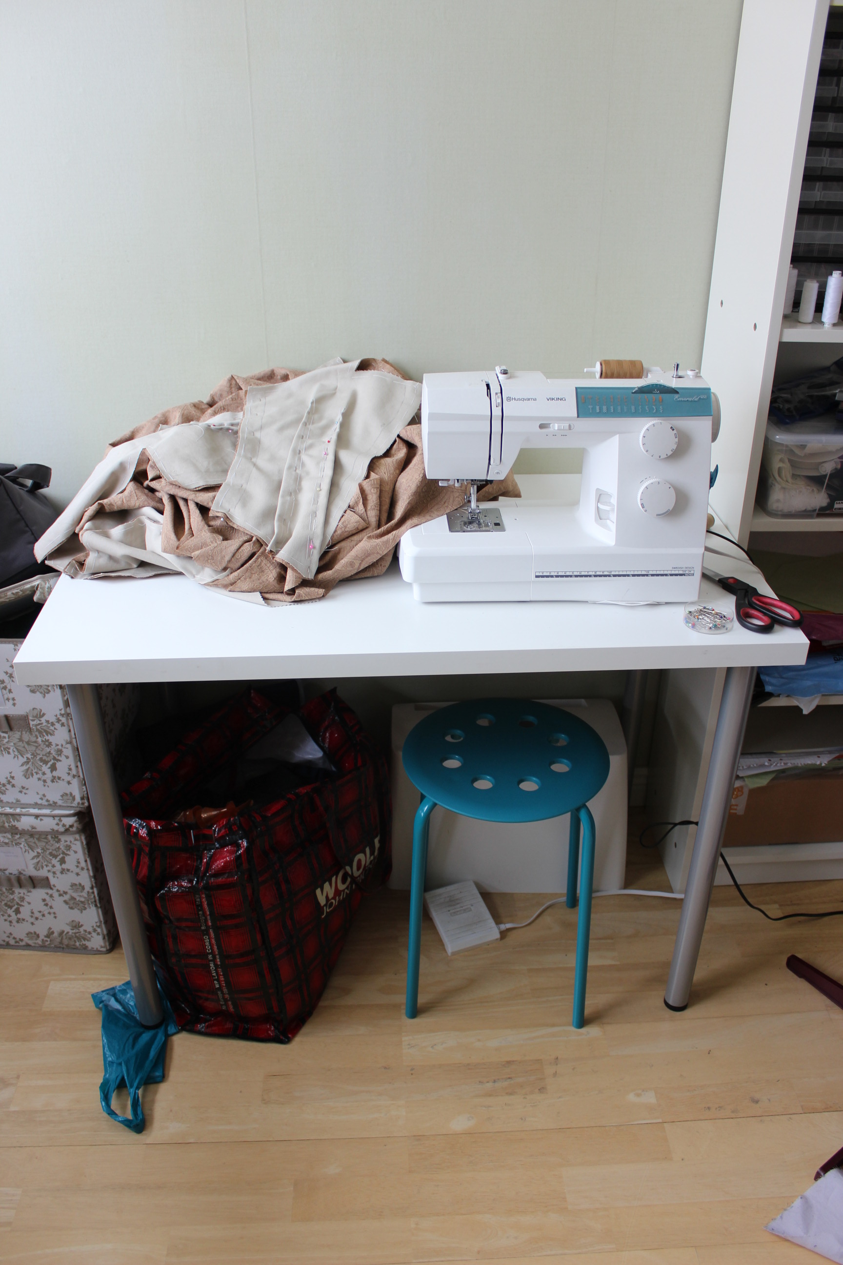 I also got a sewing table (were both my machine and overlook will live), only to be used for that purpose. (Ignor the bags under it and sthe plastic bag keeping it somewhat stale.)