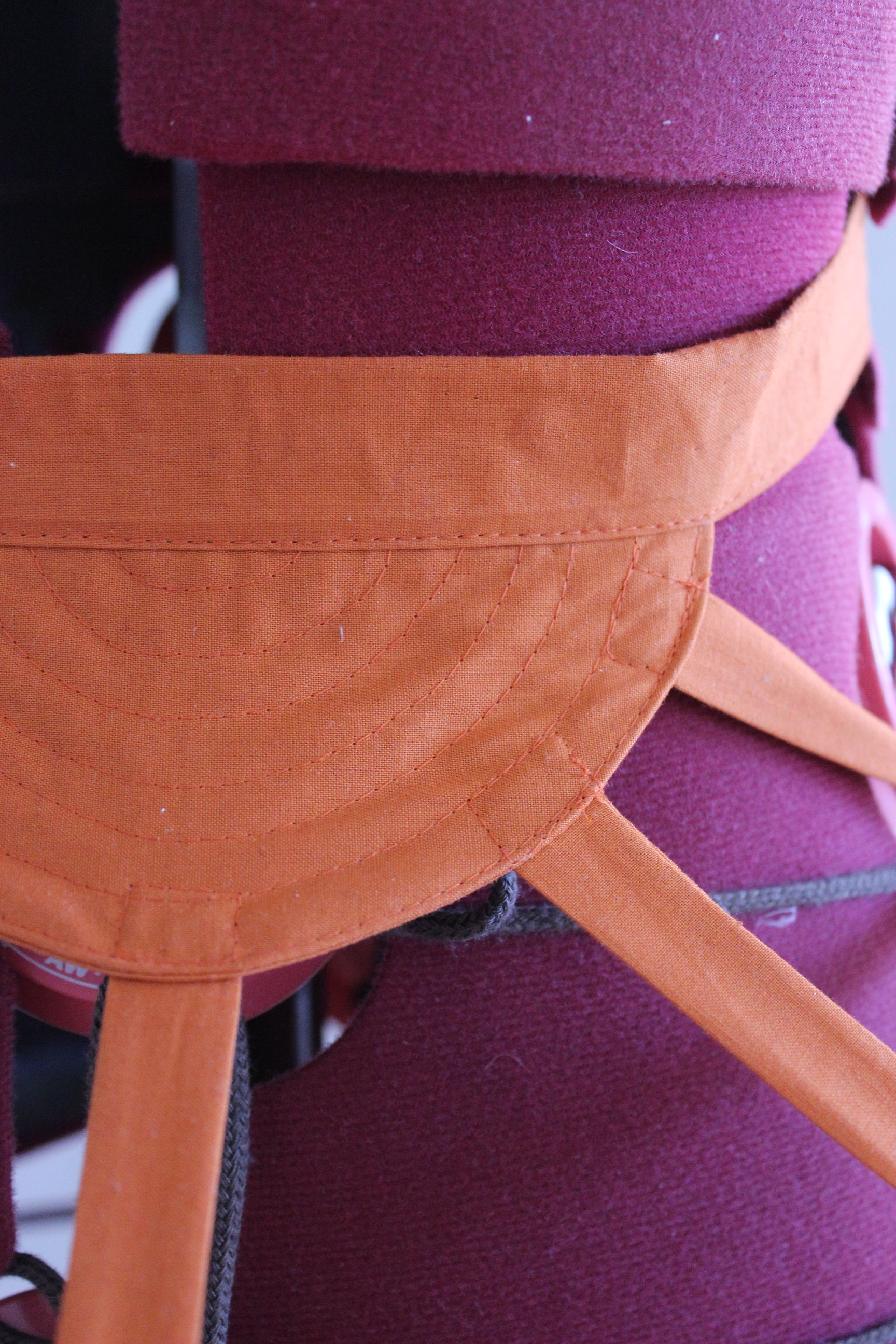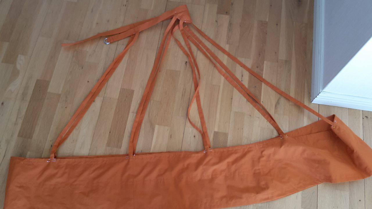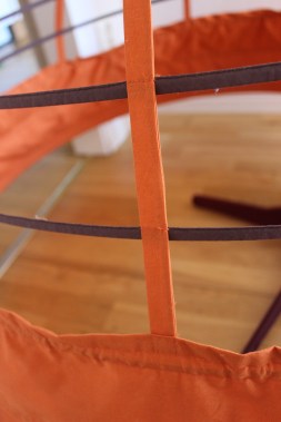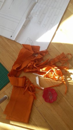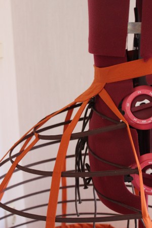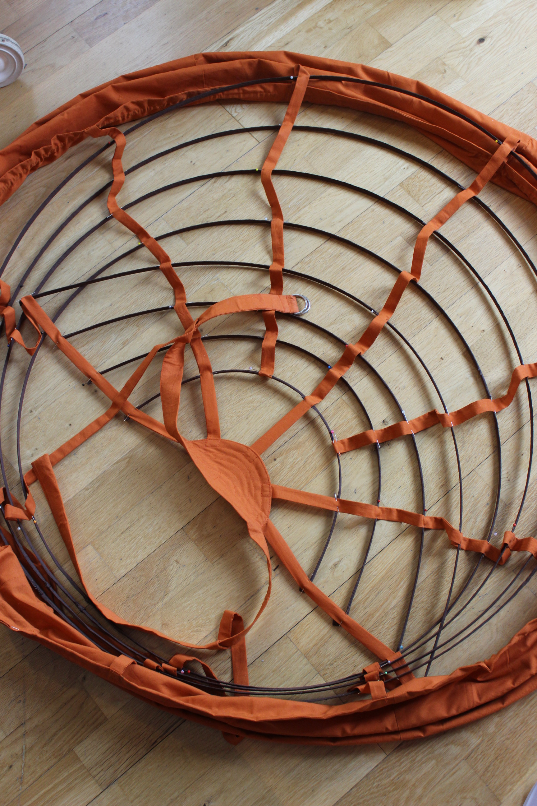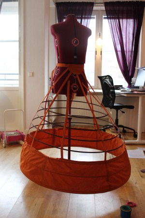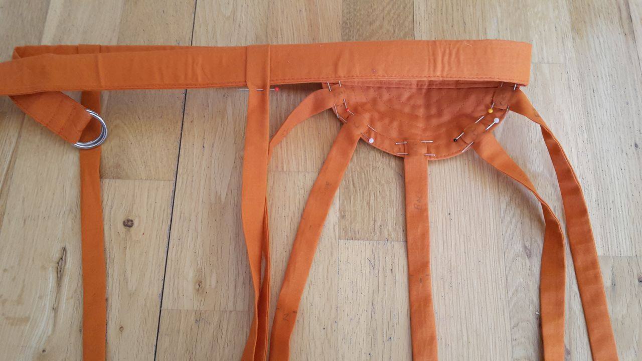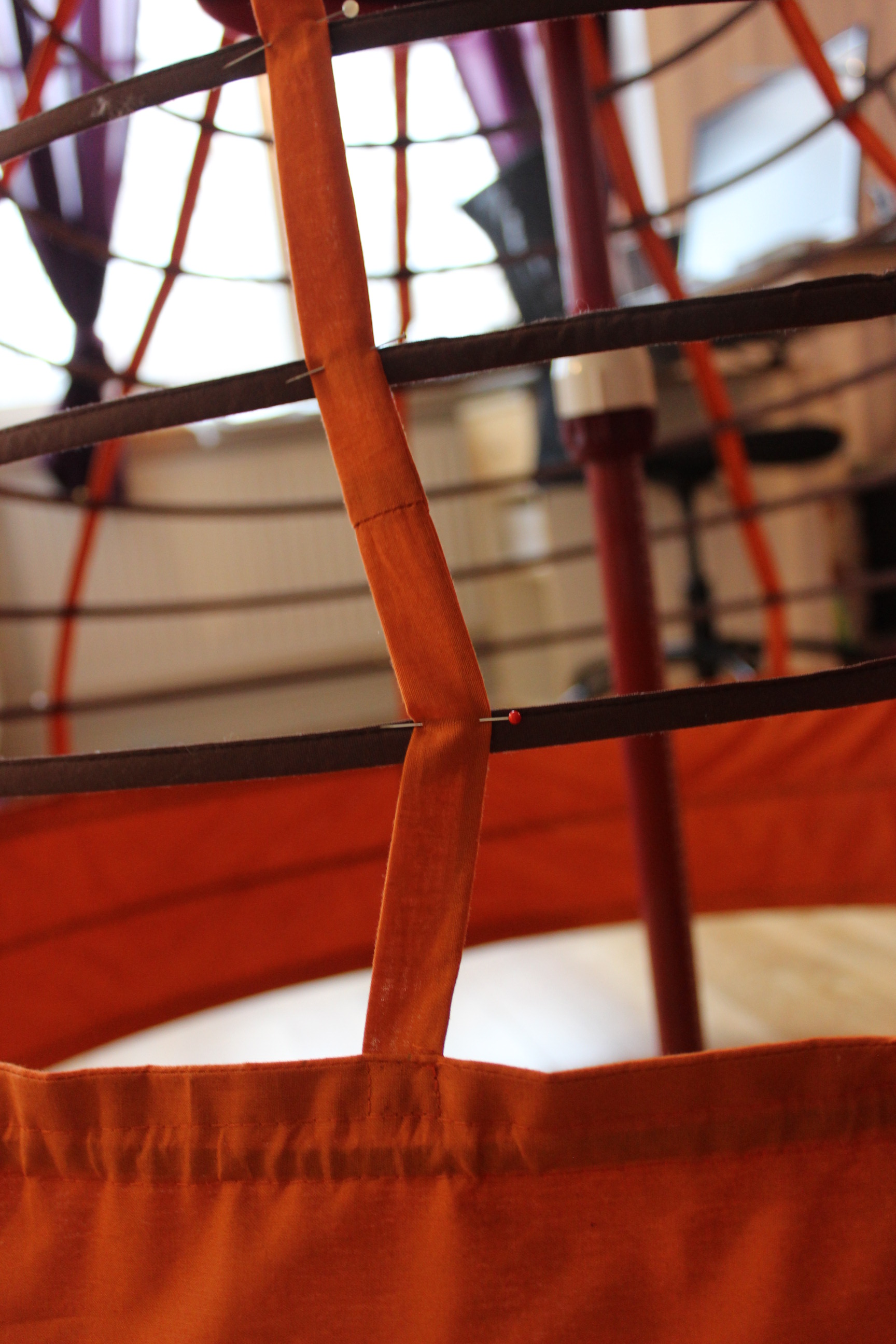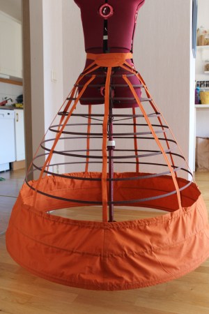 Fabric & Notions: 1 orange cotton sheet (about 2,5 m fabric), about 15 m of brown bias tape, tread, 1 belt buckle, 1 m of interfacing for the belt, about 21 m of hoop wire, duck-tape, 4 m of cotton sting. I also needed heavy pliers, strong fingers and lots of patients.