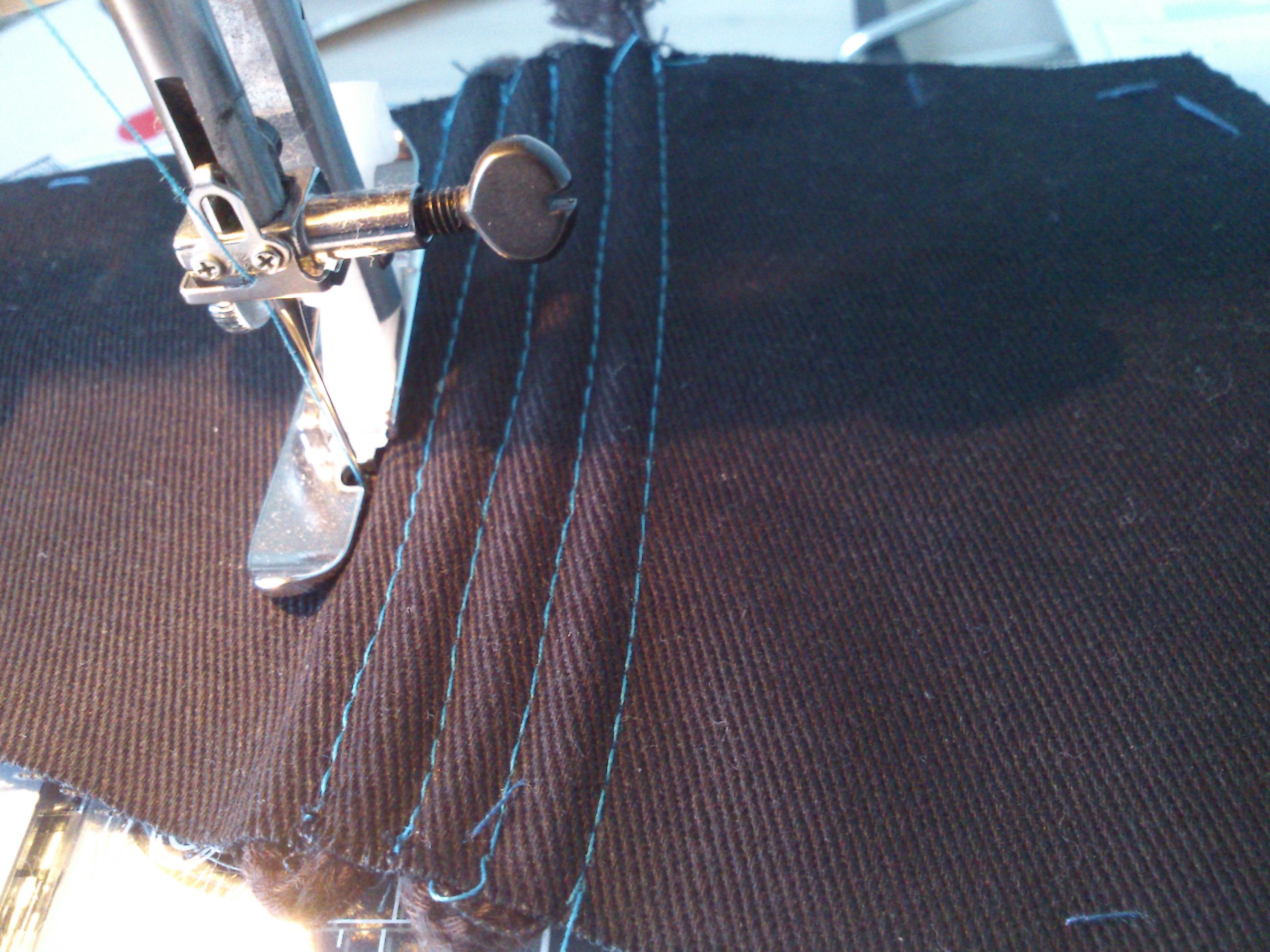 Then I cut the fabric, basted on the interlining and marked the space for the piping, and sewed them in.