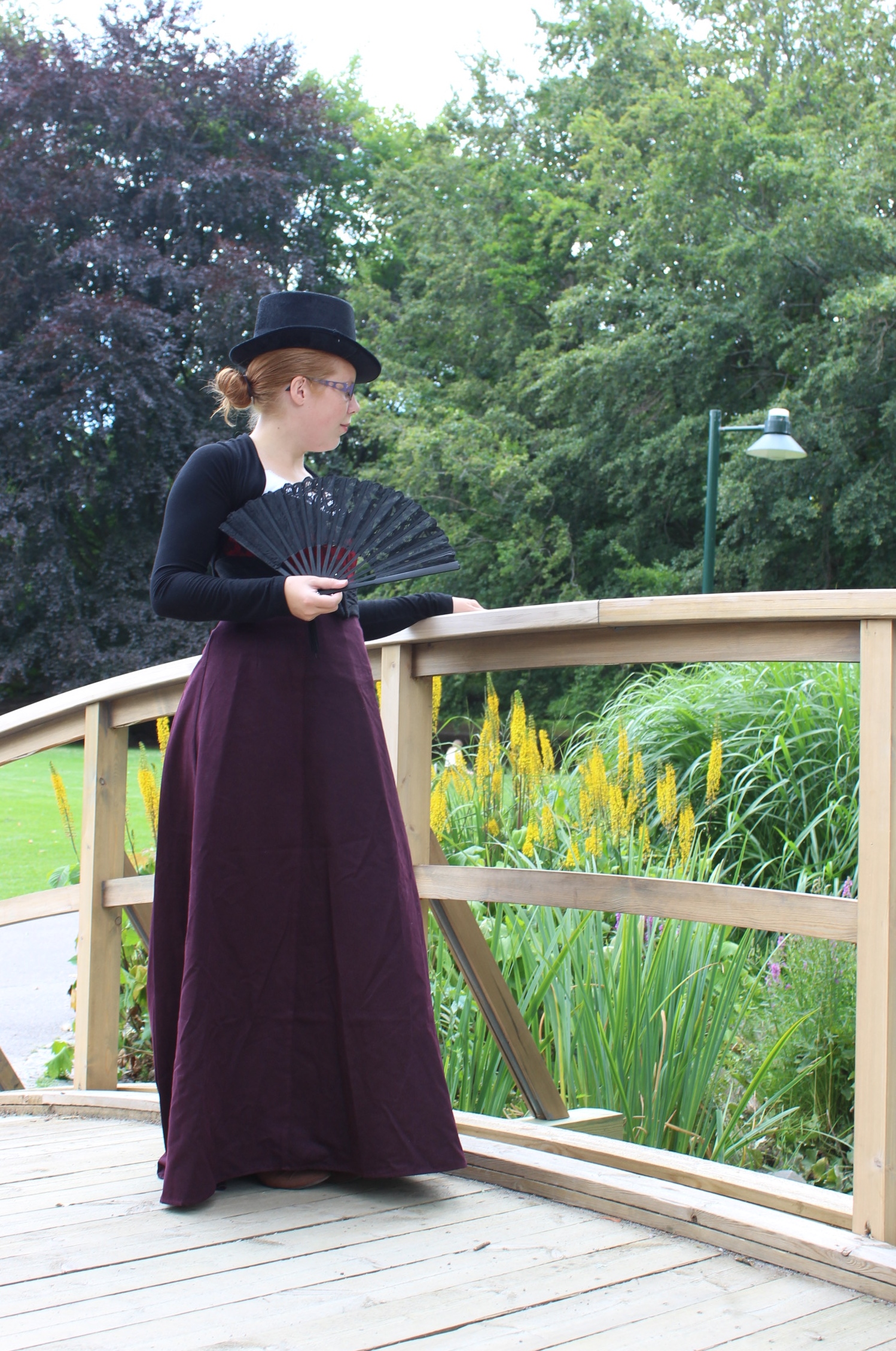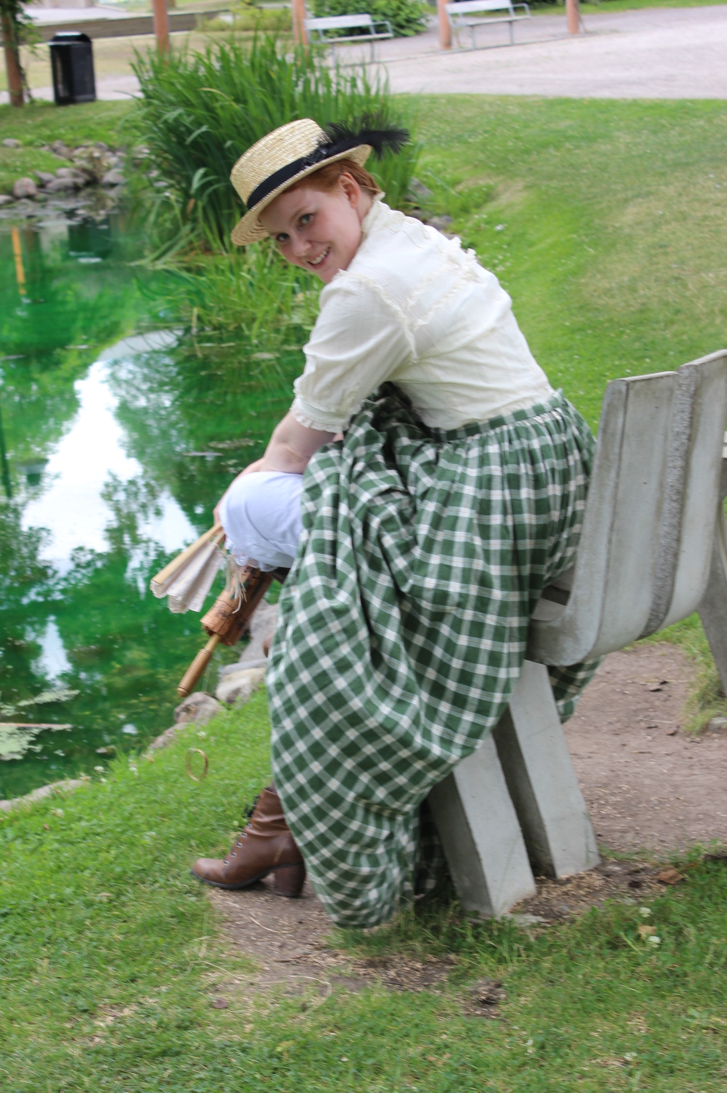 My sister is wearing her new 1860s ensemble including her blue Skirt, white Shirt, blue Hat and black Swiss-Waist, paired with a bridal petticoat, bloomers, stockings, lace up shoes, and black lace mitts.