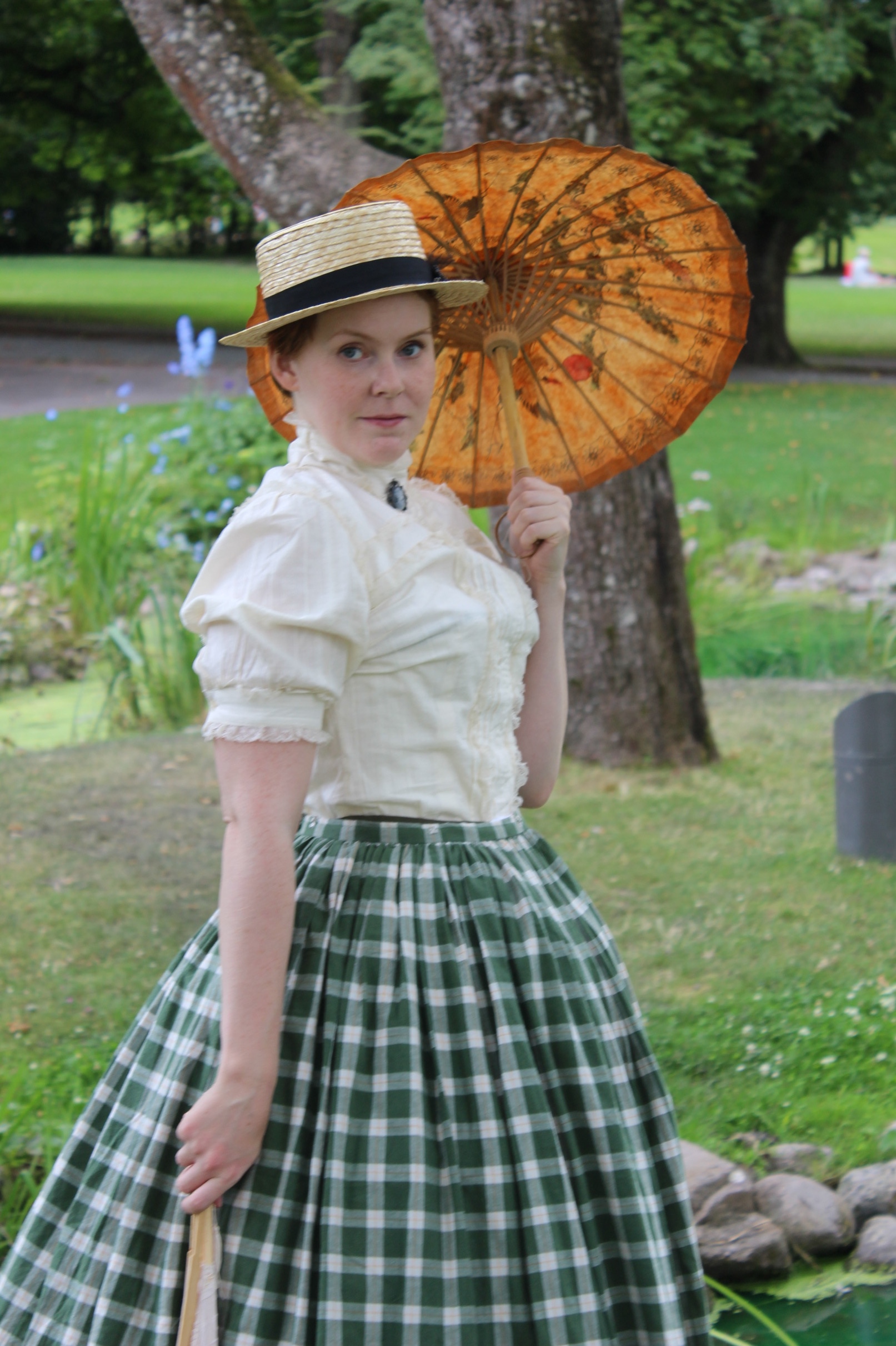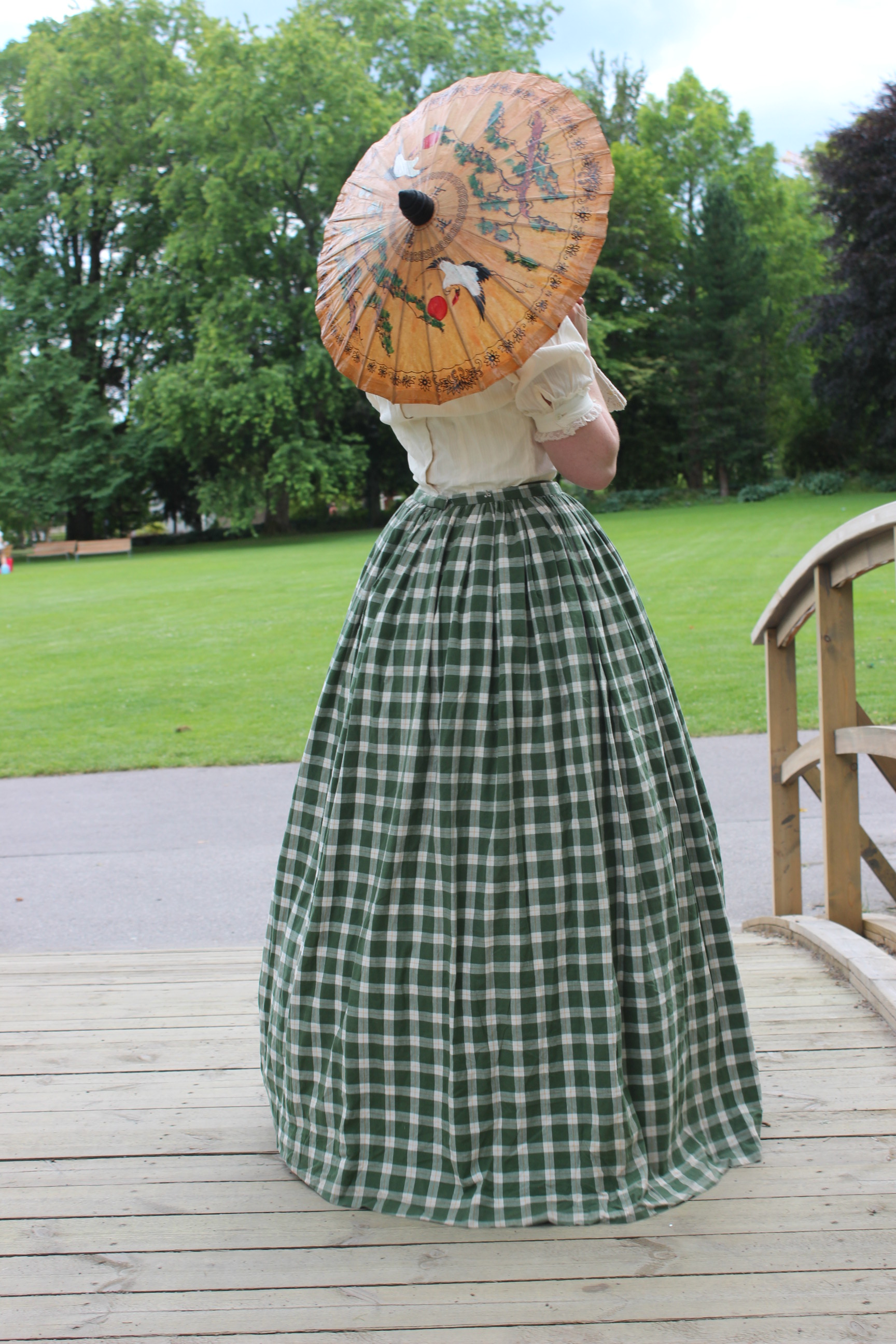 I’m wearing my new 1850s ensemble of plaid Dress, green silk bonnet, cage Crinoline, Corset, petticoats, bloomers, lace up boots and a clock in a chain at the waist.