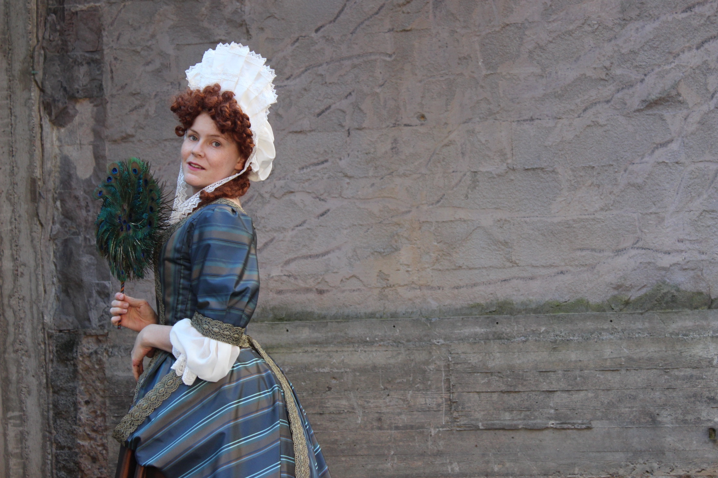 Not particularly I’m afraid. The fabric and construction techniques are all modern, even though the pattern and general shape is ok, and they did have a flair for stripes and fringes at the time. One thing I didn’t know until halfway done though, was the facts that this type of gowns usually closed center front omitting the stomacher of the later era completely.