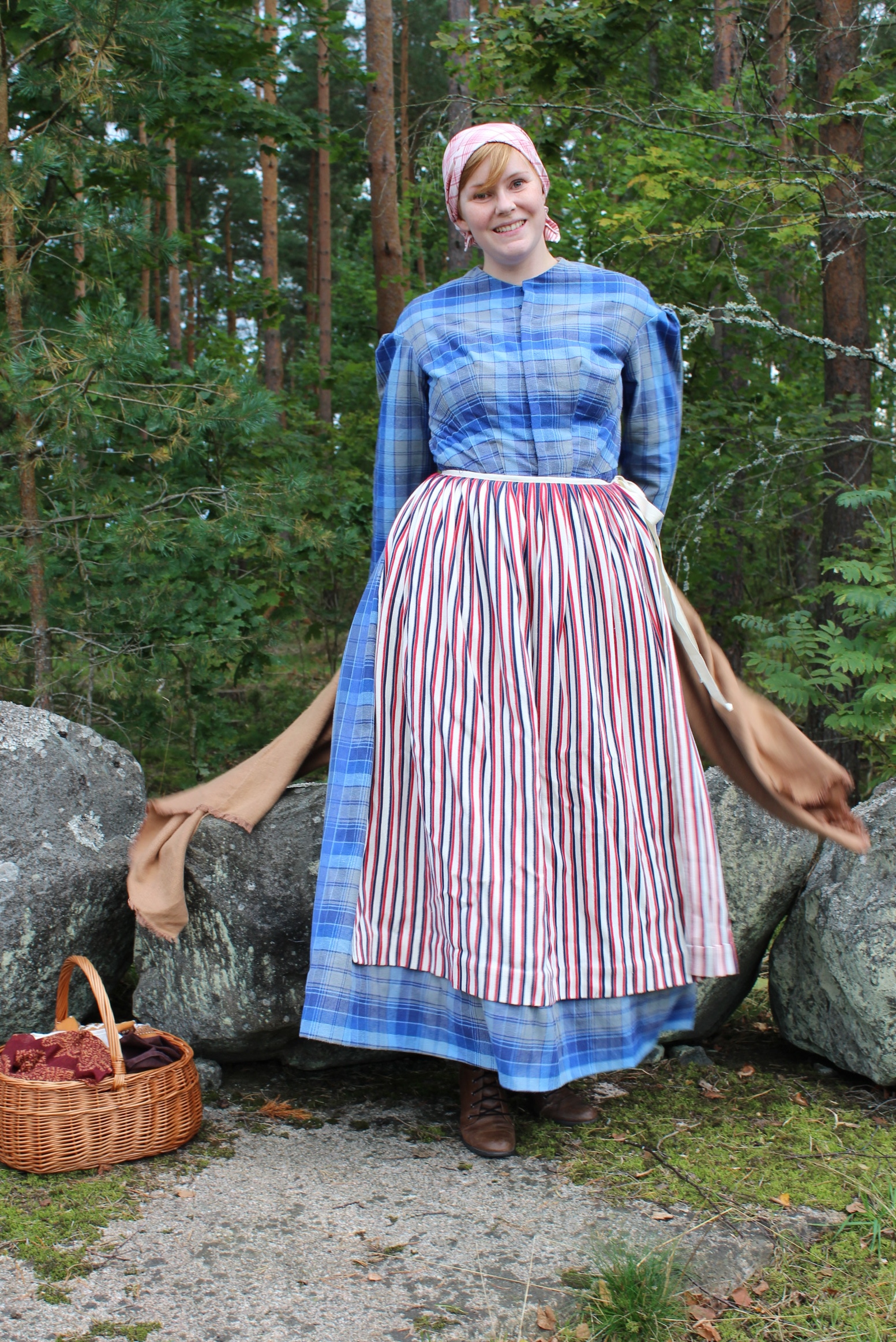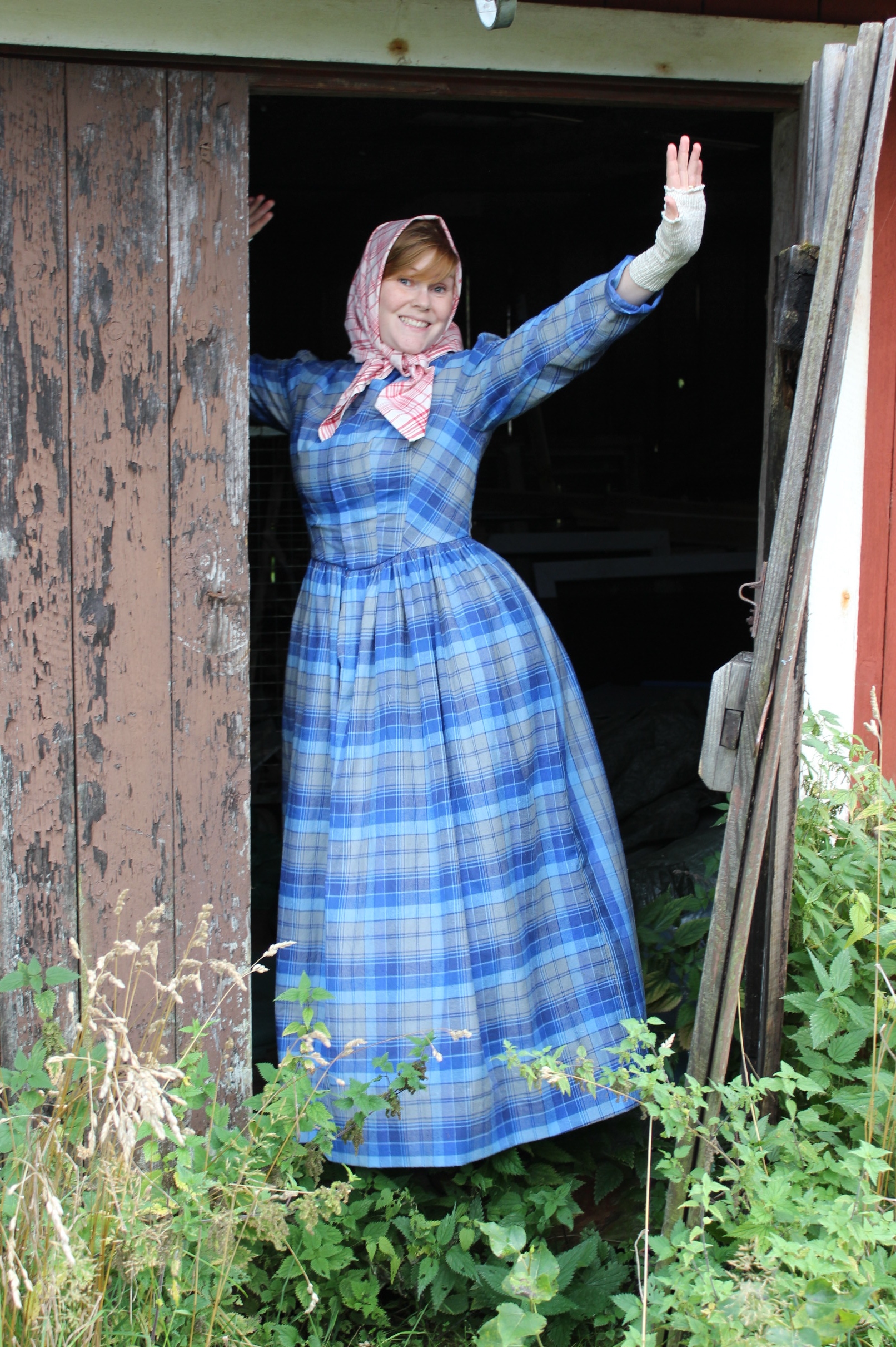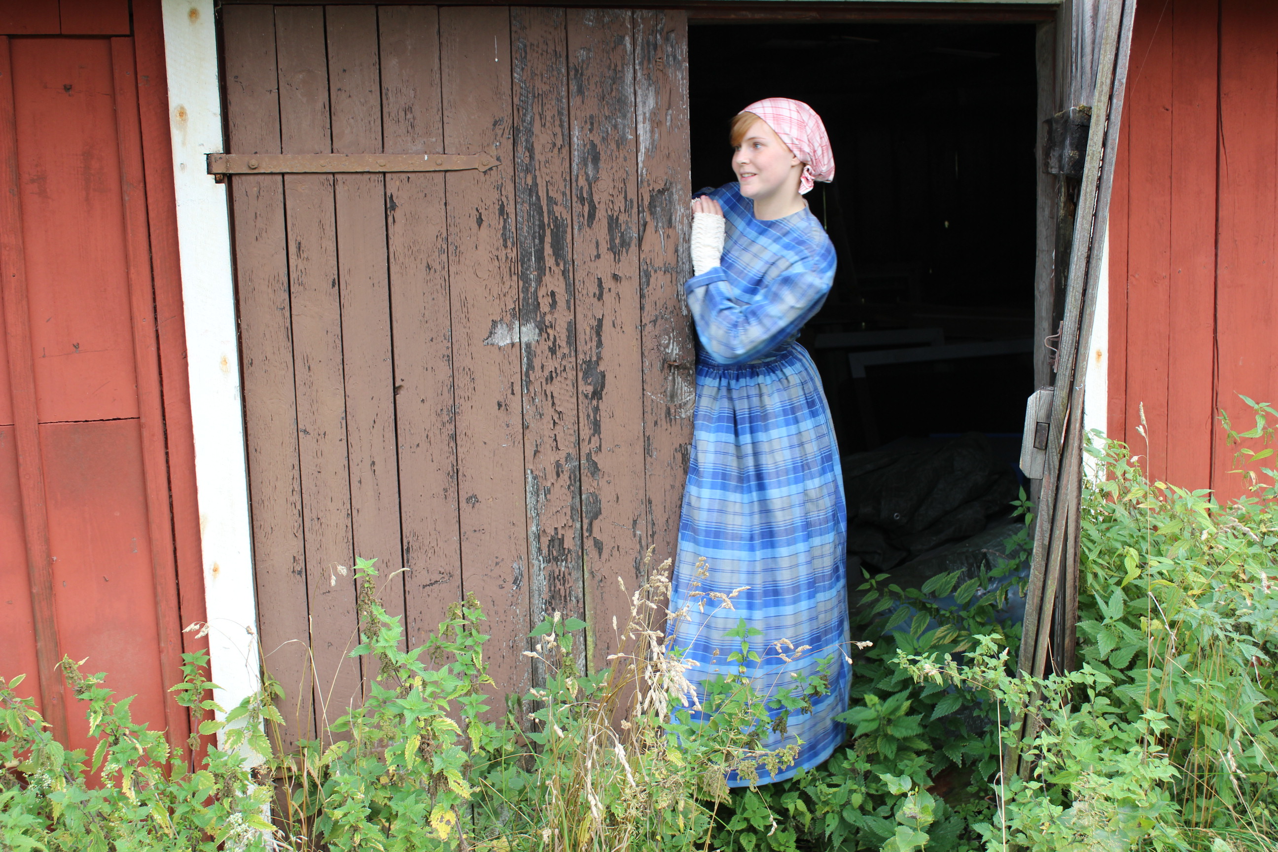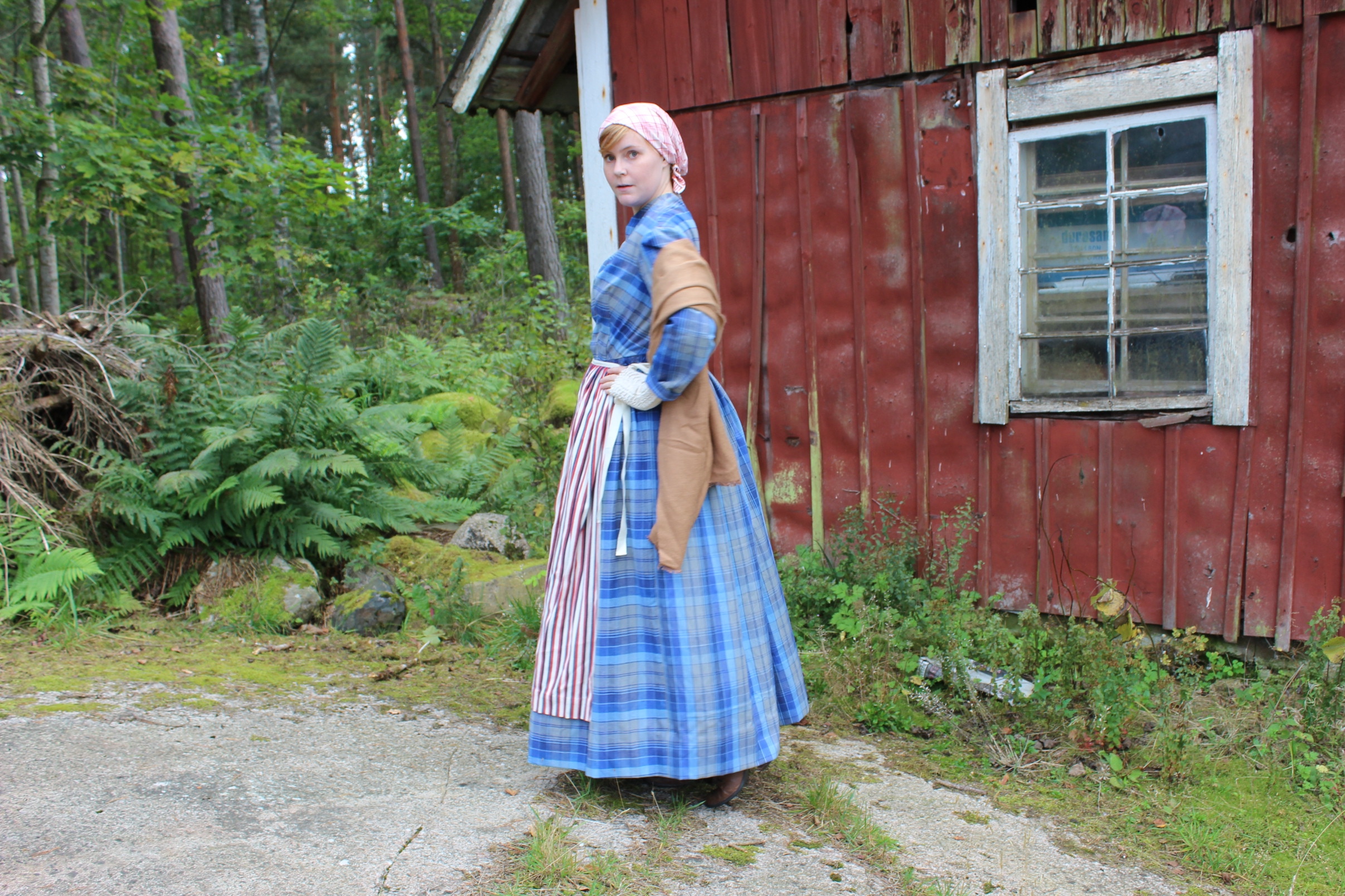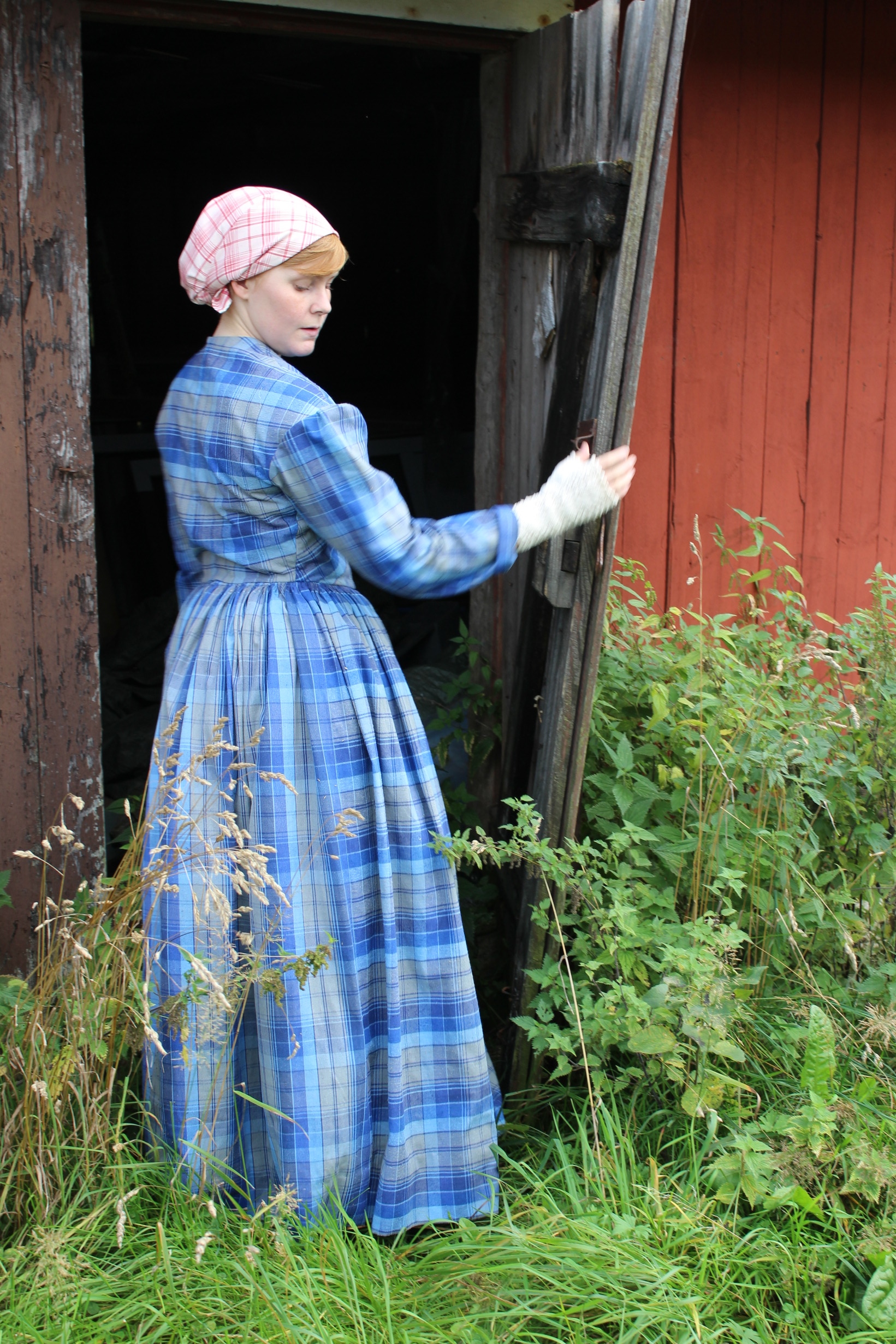 I’m wearing: My new Heirloom dress paired with apron and head-cloth/shawl from my National costume, beige woolen shawl, knitted mittens, chemise, petticoat, bloomers and lace up boots.