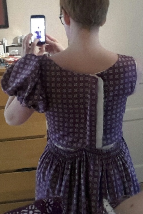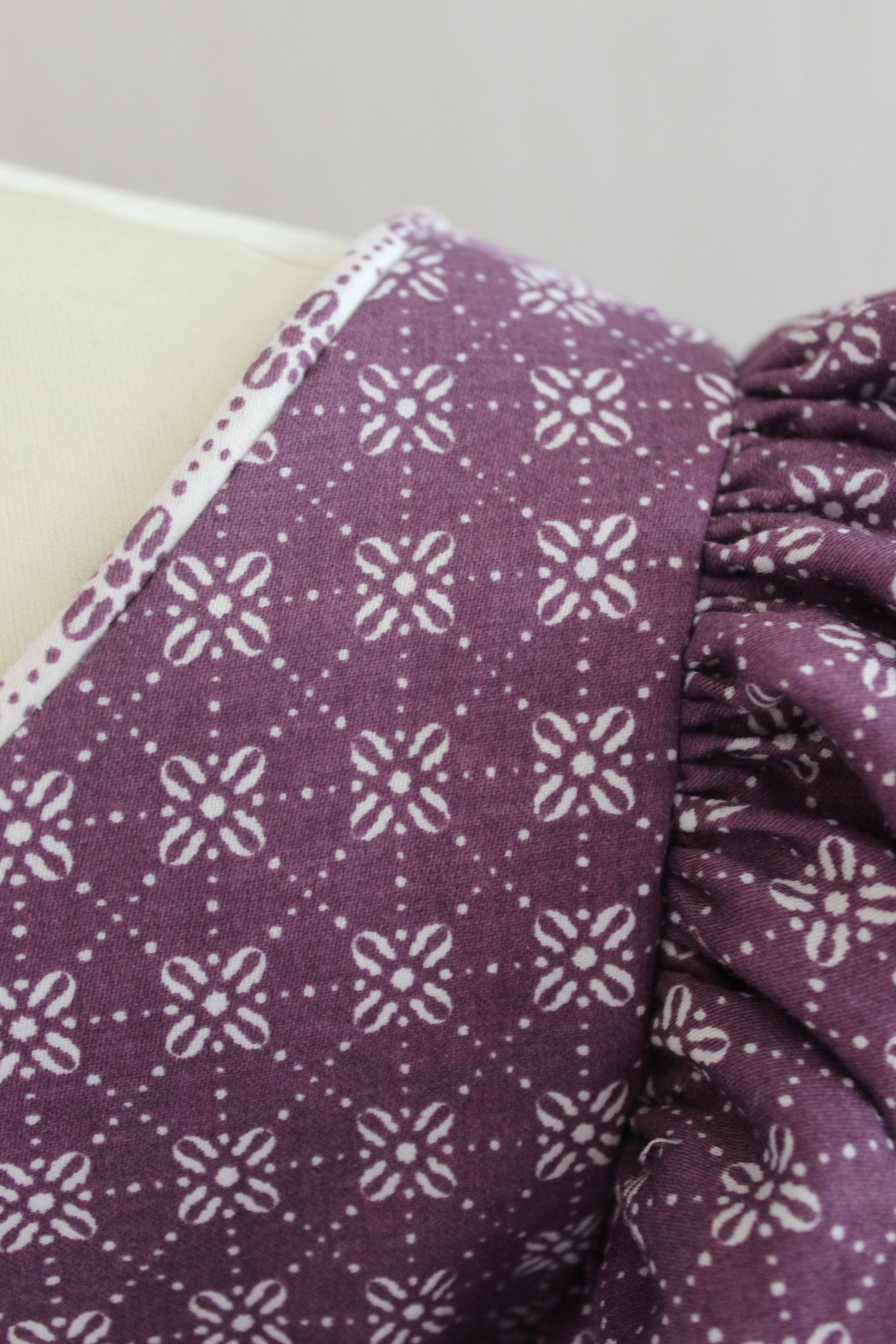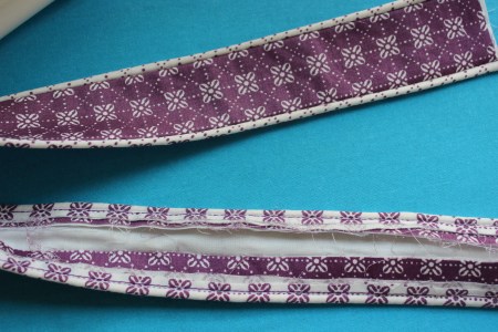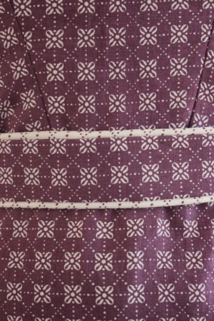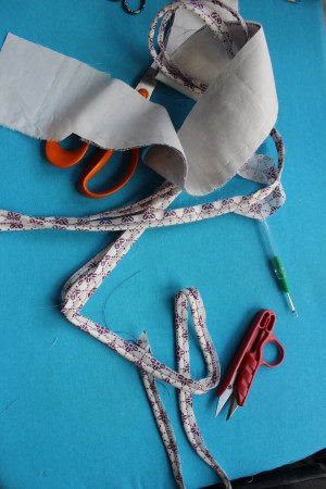 Using bias cut strips of the white/purple fabric combined with pieces of a cotton cord from my stash I soon had the 3 m or so I needed for the neckline (and belt).