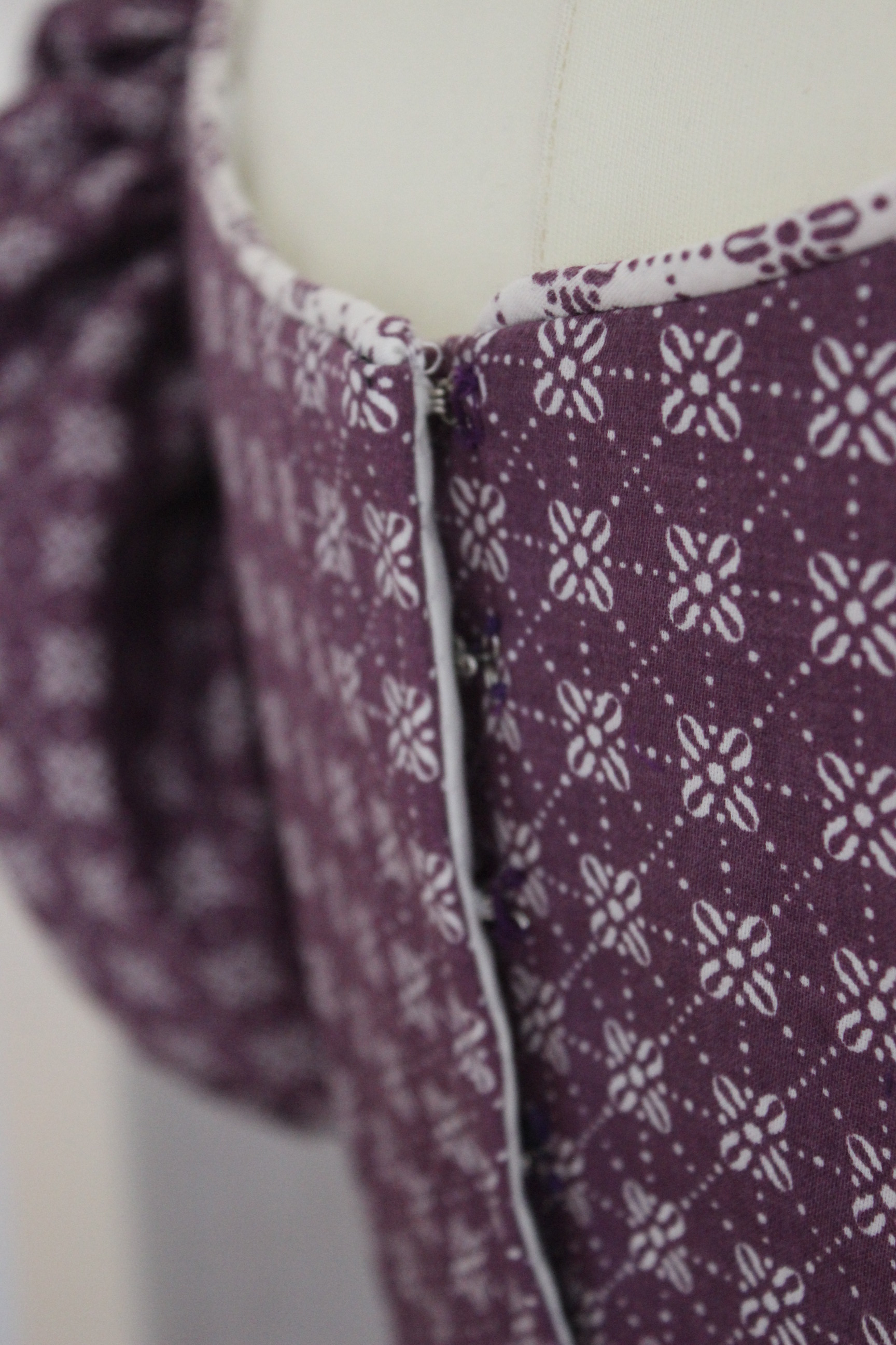 I stitched the piping to the bodice, and the pre-made skirt to the bodice, added lining, folded under the edges for closure and hemmed the skirt.