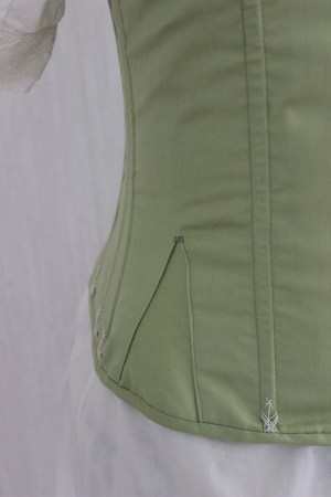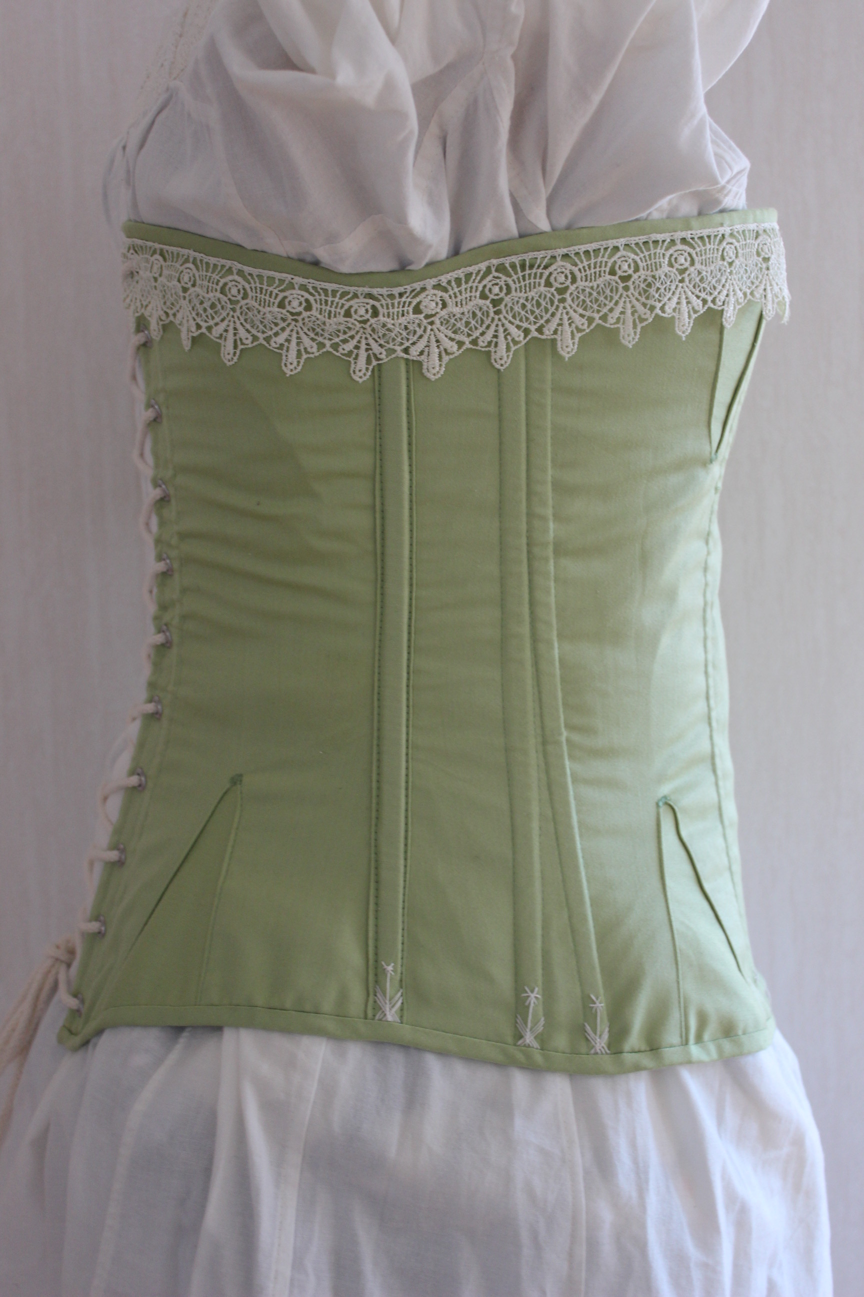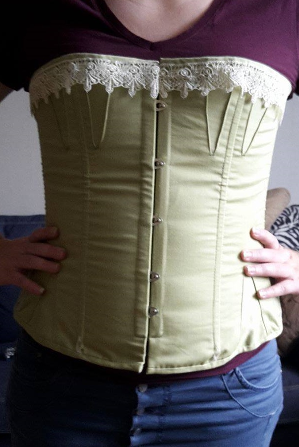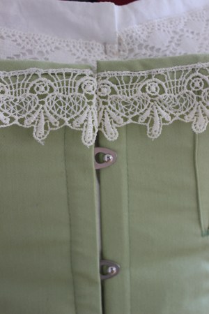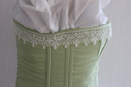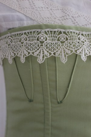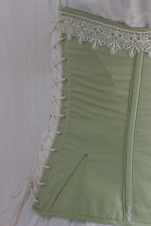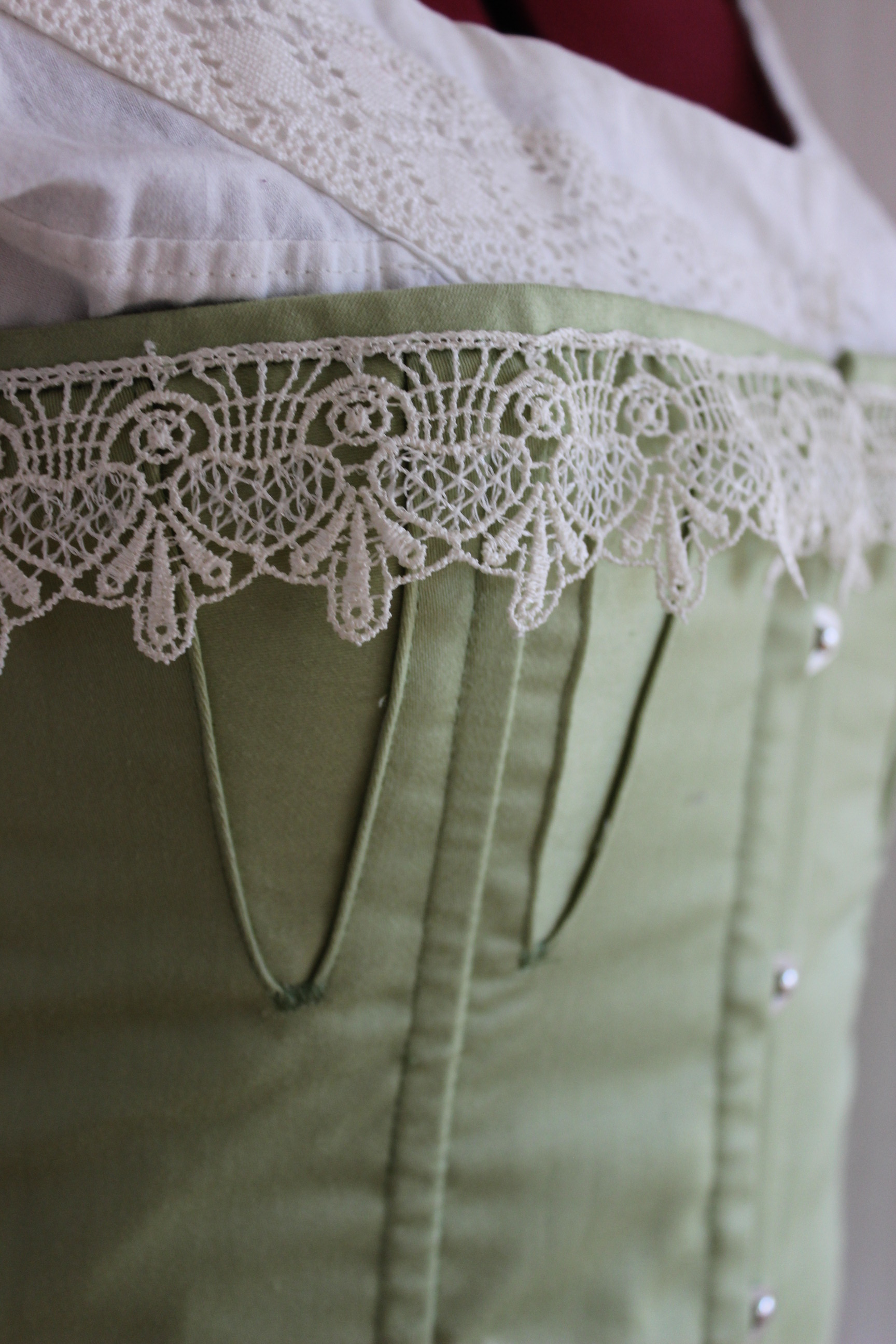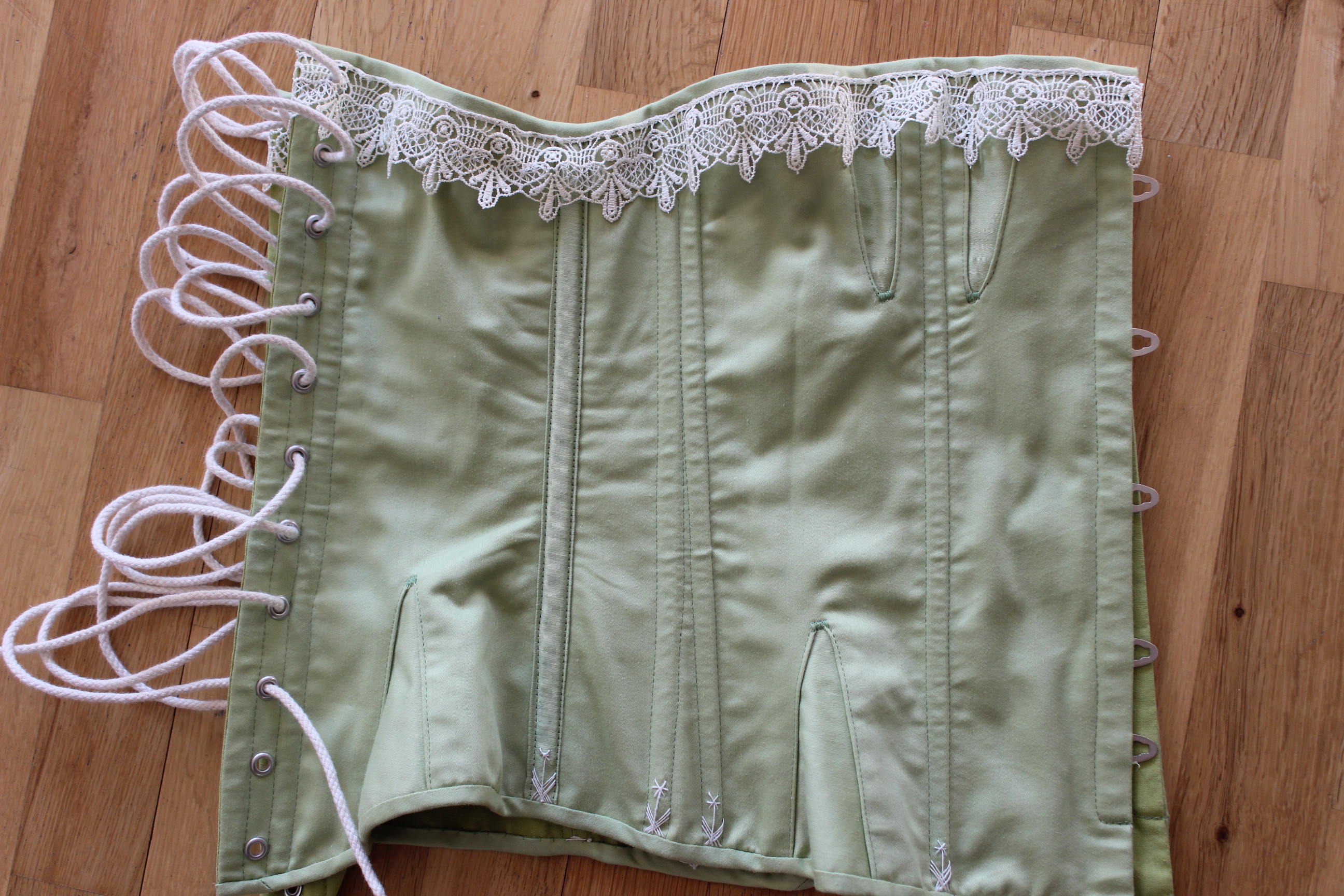 Notions: A 33 cm planchett, ivory thread, green buttonhole thread, 30 silver gromets, 4m cotton string for piping, 4 m ivory cotton laces, ca 10 m of boning (2,5 m steel, 8 heavy duty cable ties and 3 m syntetic whalebone), 2 m green biastape and 1 m ivory lace.