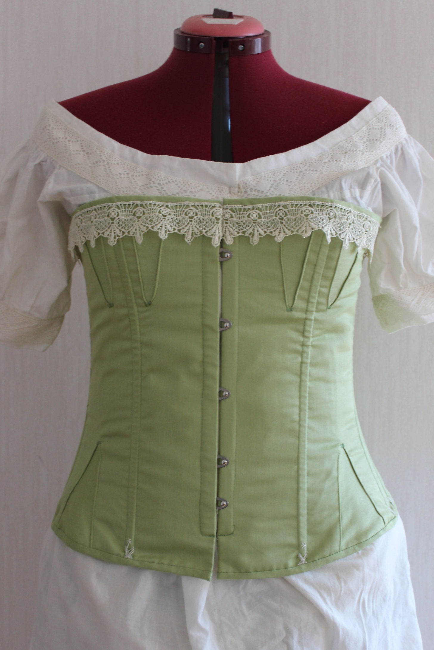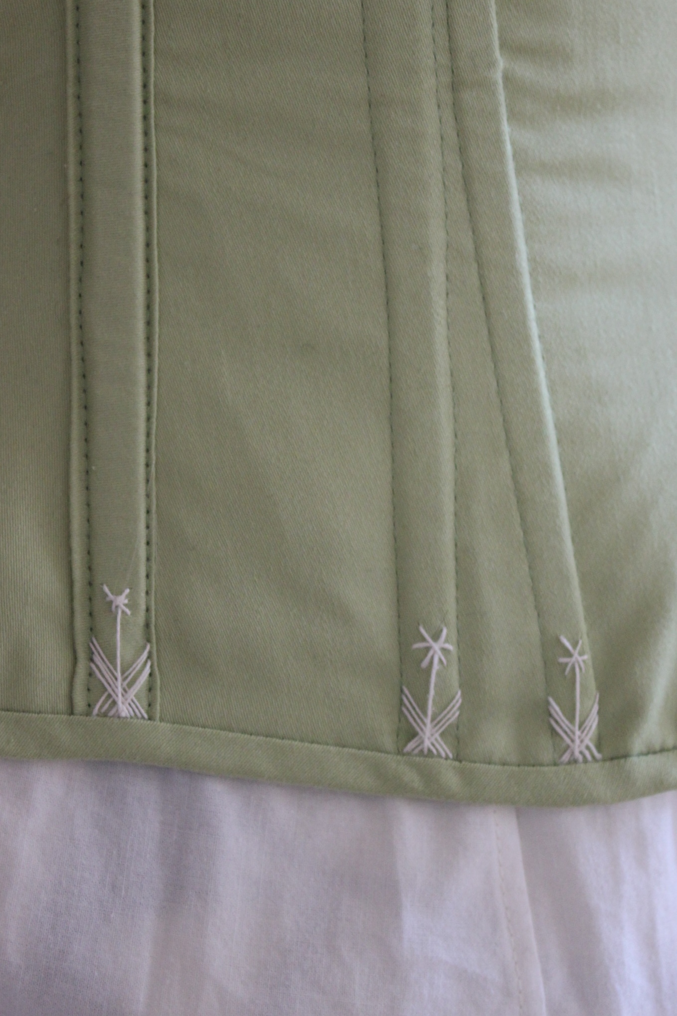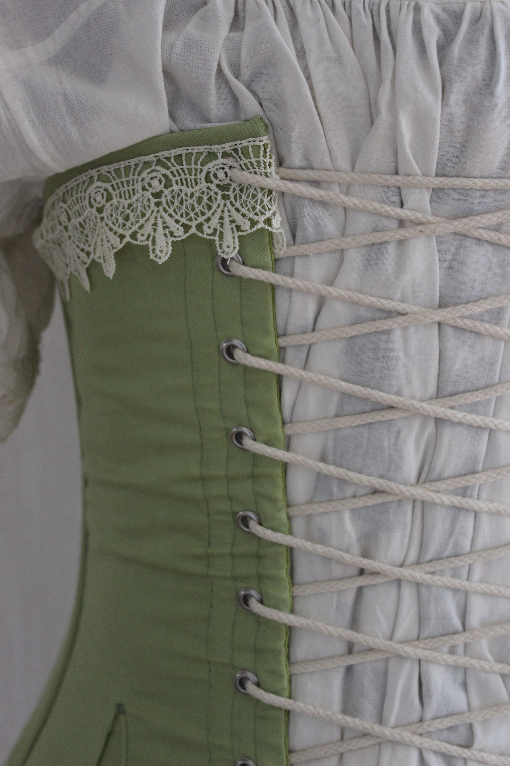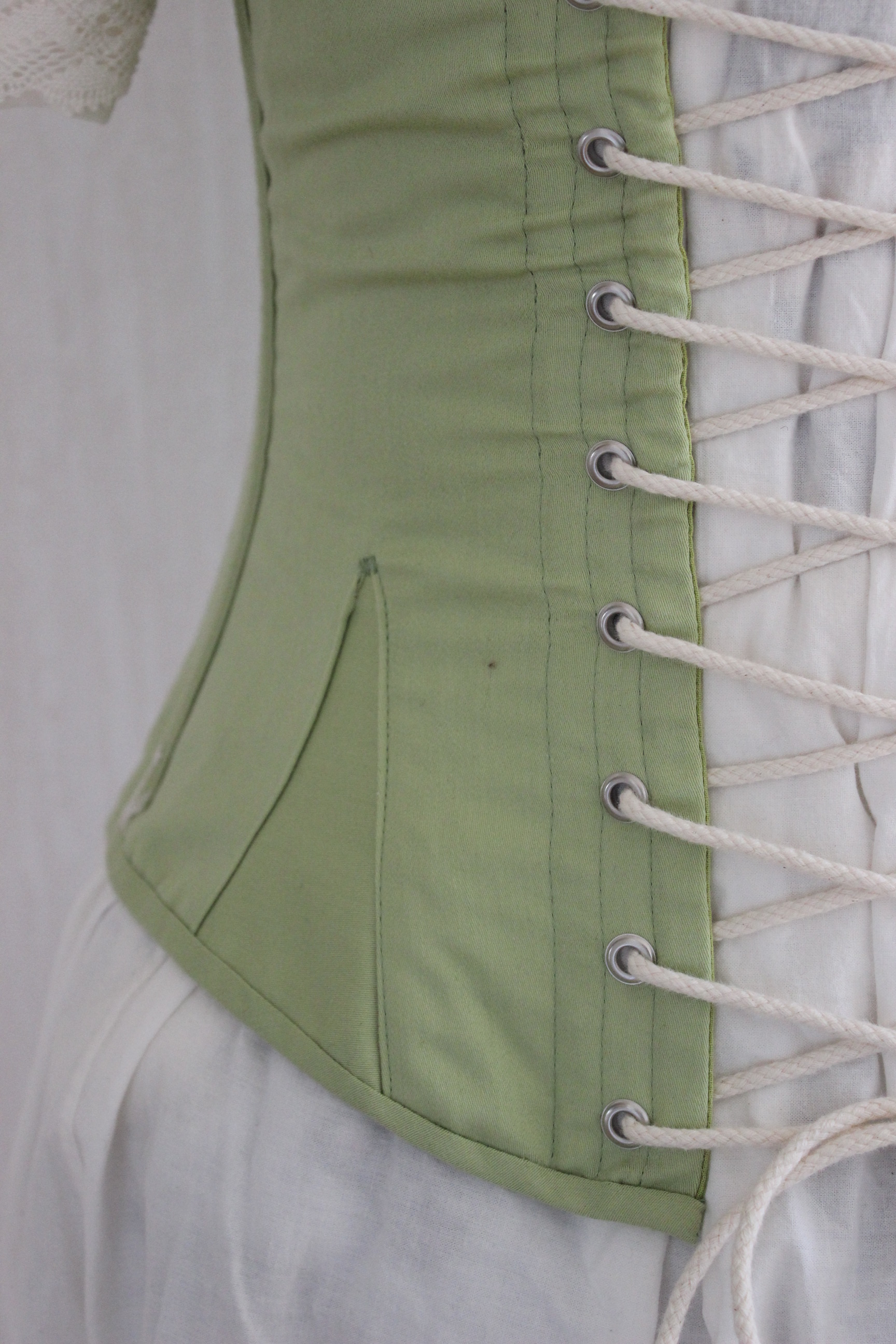 Notions: A 33 cm planchett, ivory thread, green buttonhole thread, 30 silver gromets, 4m cotton string for piping, 4 m ivory cotton laces, ca 10 m of boning (2,5 m steel, 8 heavy duty cable ties and 3 m syntetic whalebone), 2 m green biastape and 1 m ivory lace.