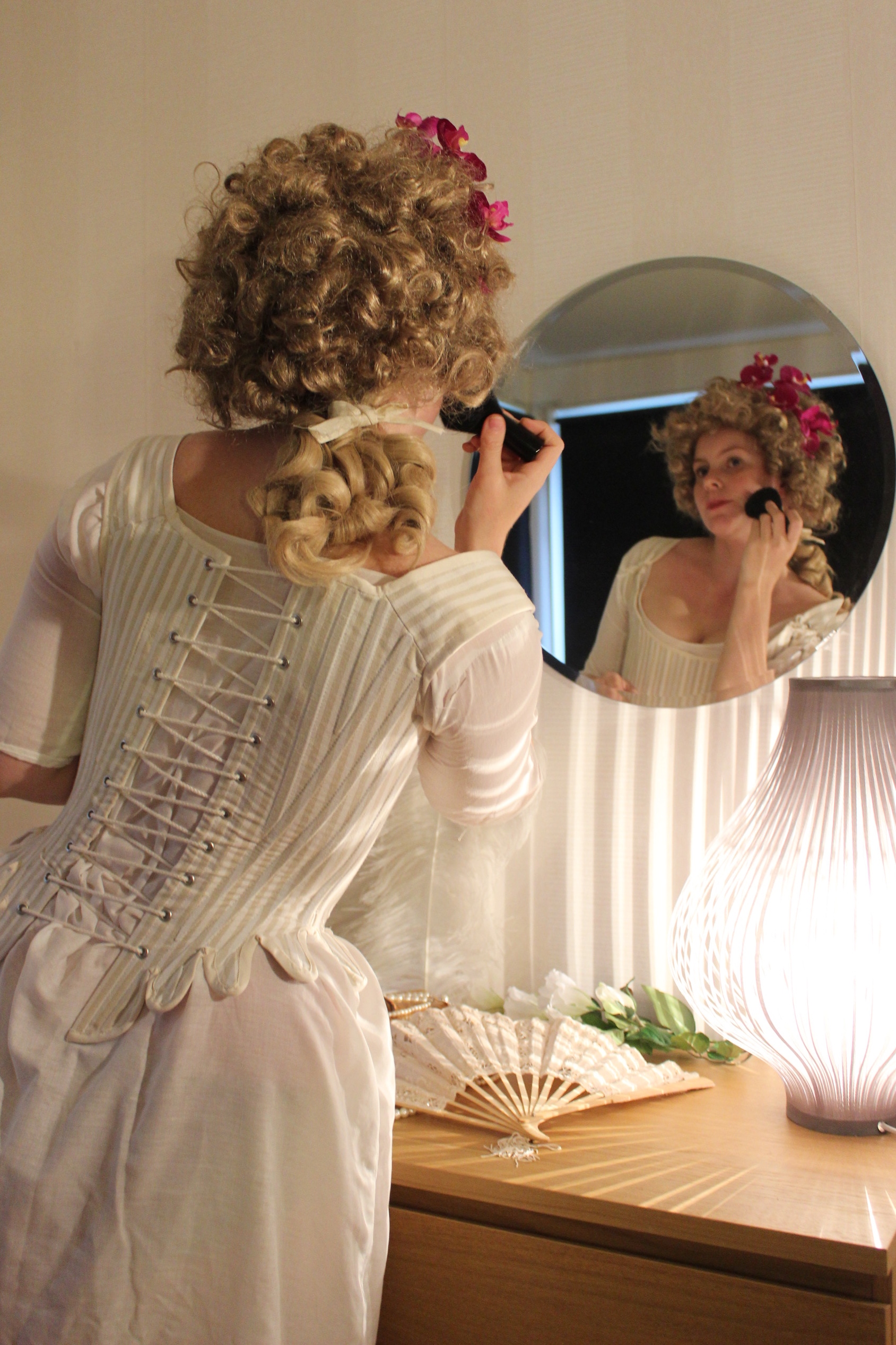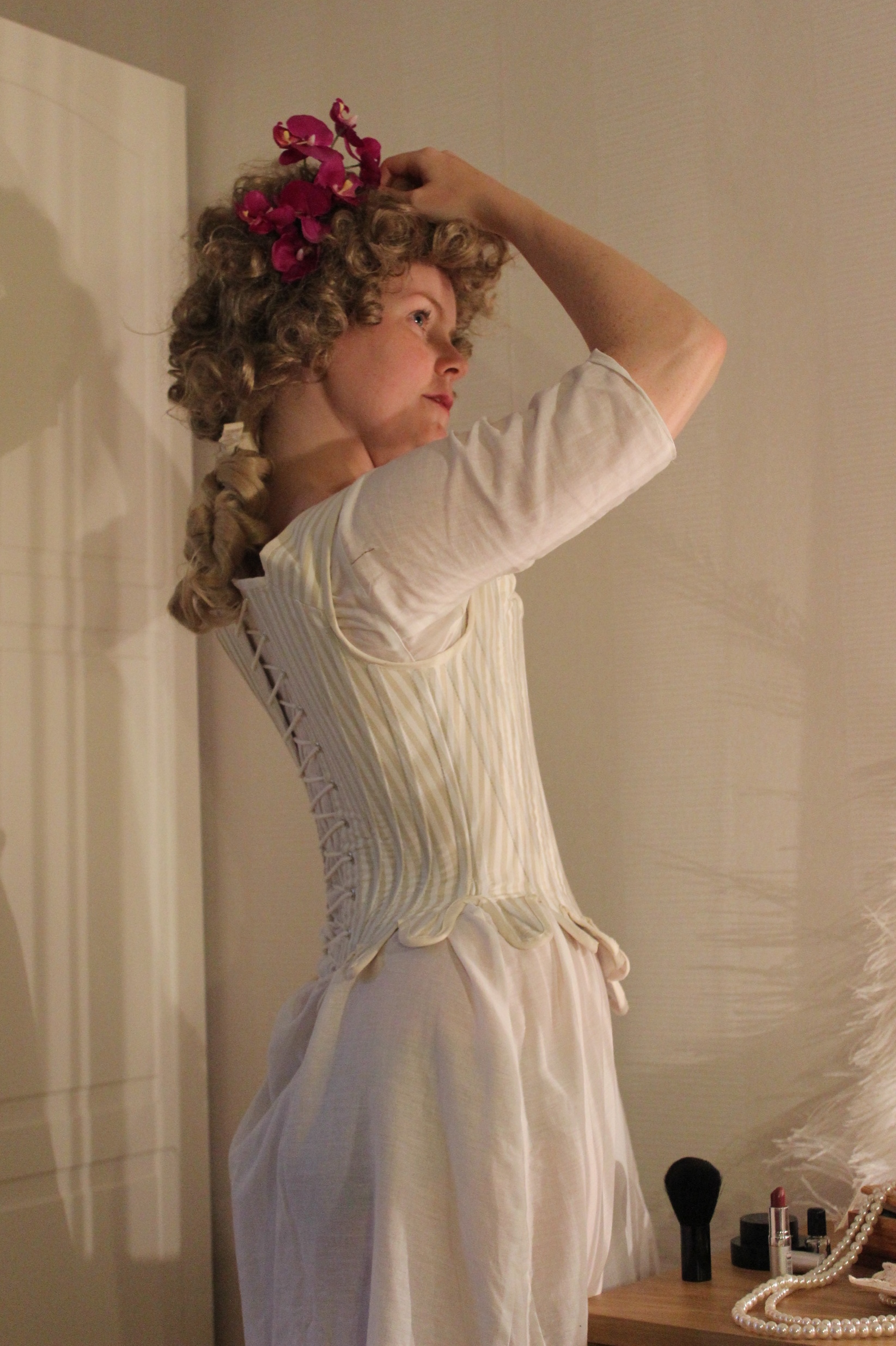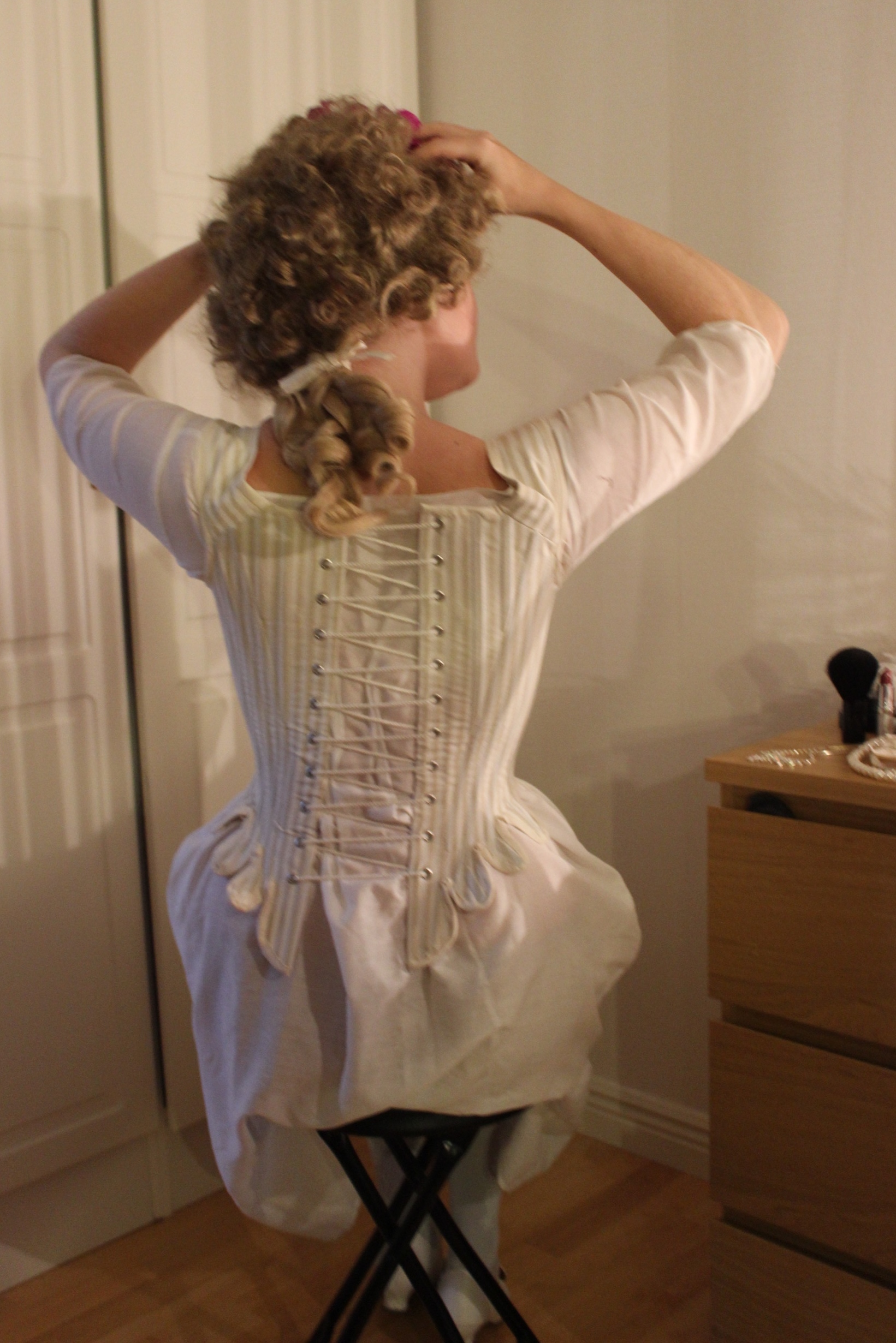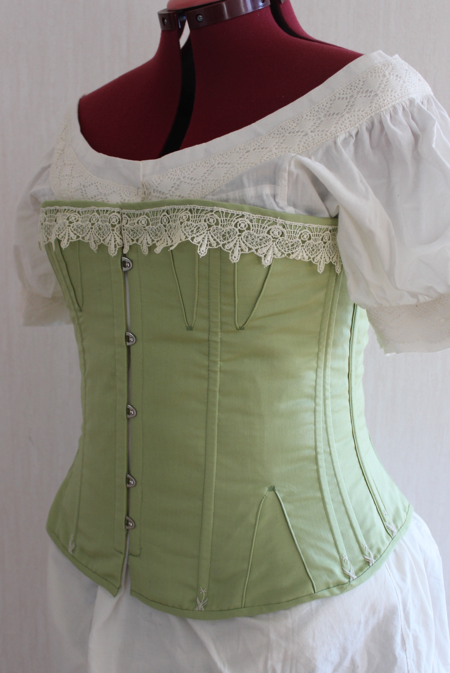 Notions: A 33 cm planchett, ivory thread, green buttonhole thread, 30 silver gromets, 4m cotton string for piping, 4 m ivory cotton laces, ca 10 m of boning (2,5 m steel, 8 heavy duty cable ties and 3 m syntetic whalebone), 2 m green biastape and 1 m ivory lace.