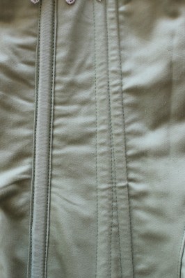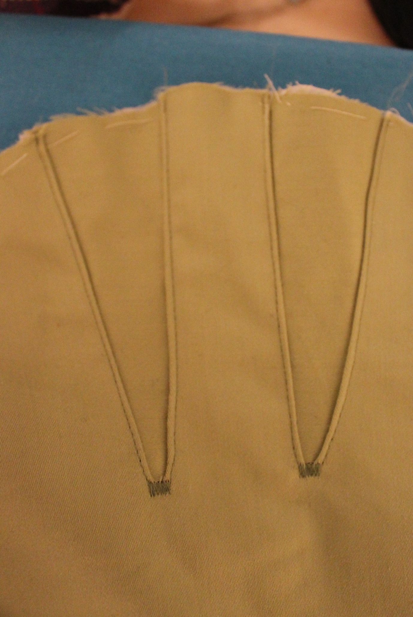 Then I cut the fabric, basted on the interlining and marked the space for the piping, and sewed them in.