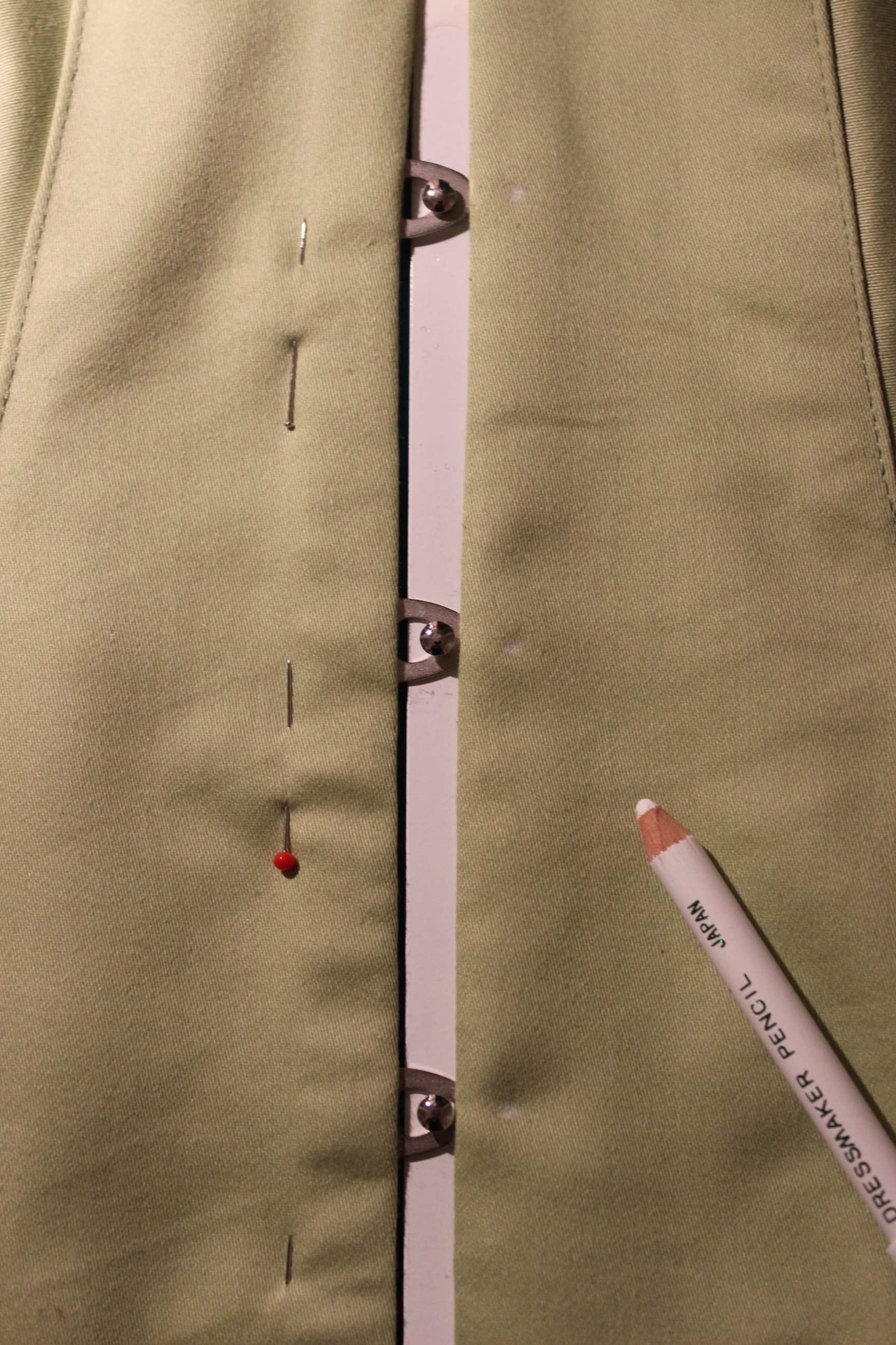 Setting the busk using awls to get the studds through the fabric without ripping it.