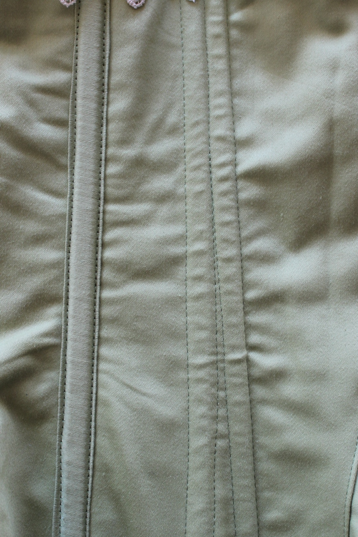 Then I grabbed my finishing/decoration kit (green cotton bias tape, white cotton lace, green button hole thread and cord for piping (which I did in my first few steps).
