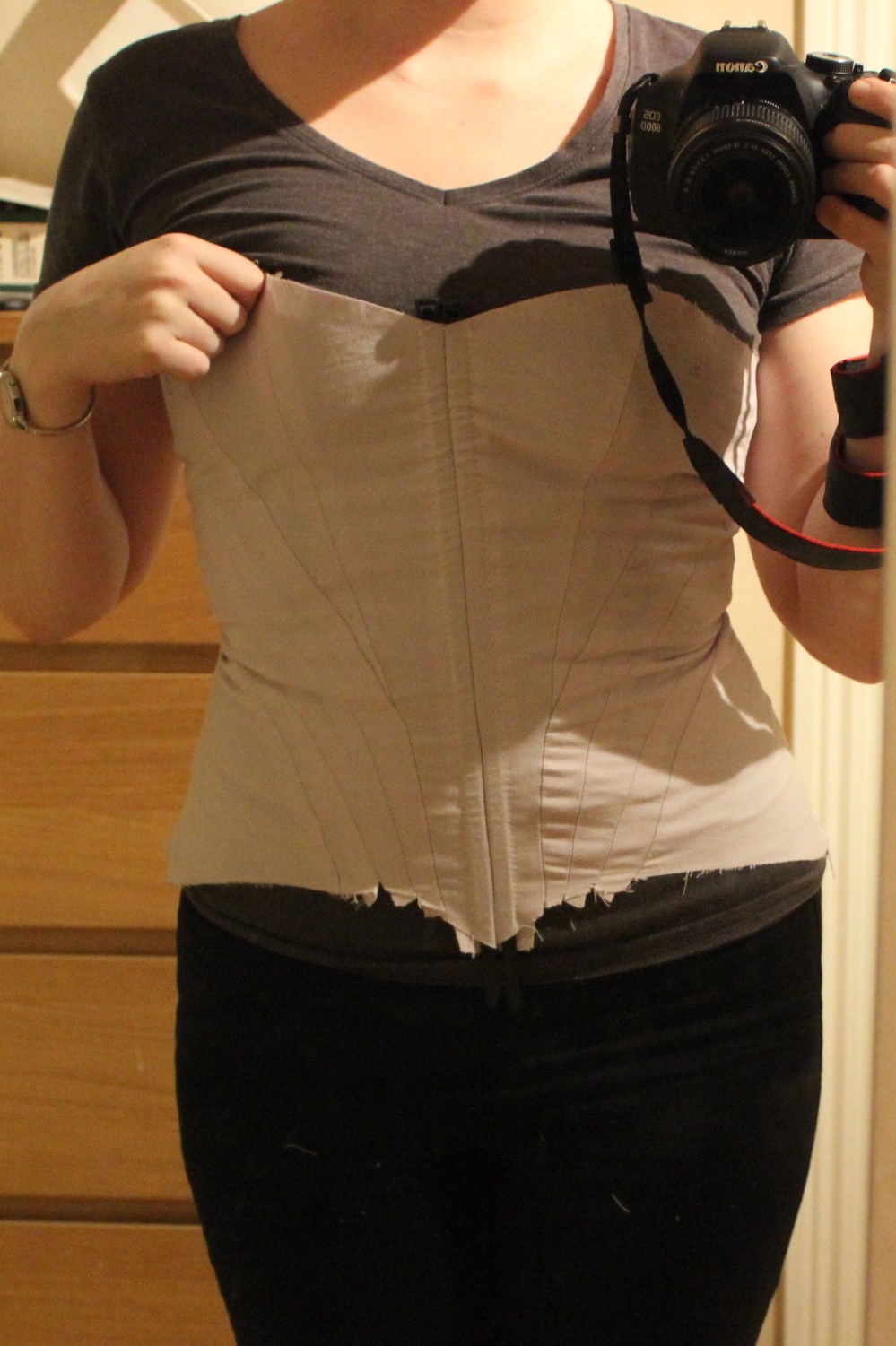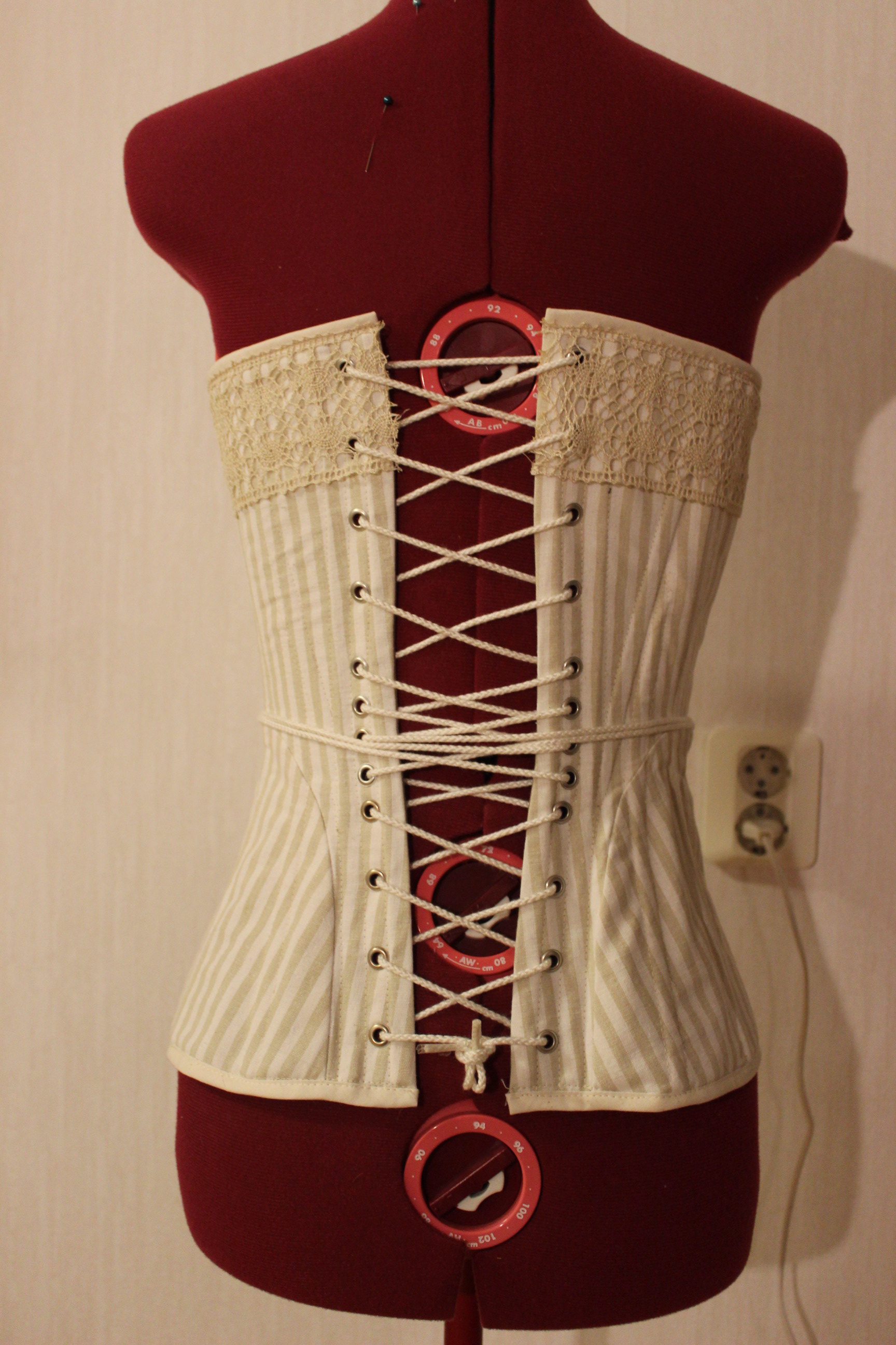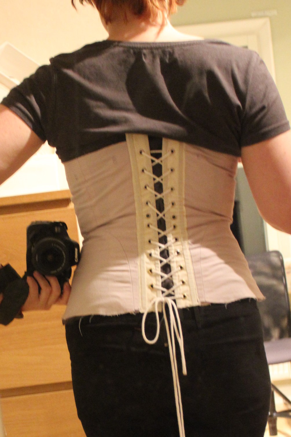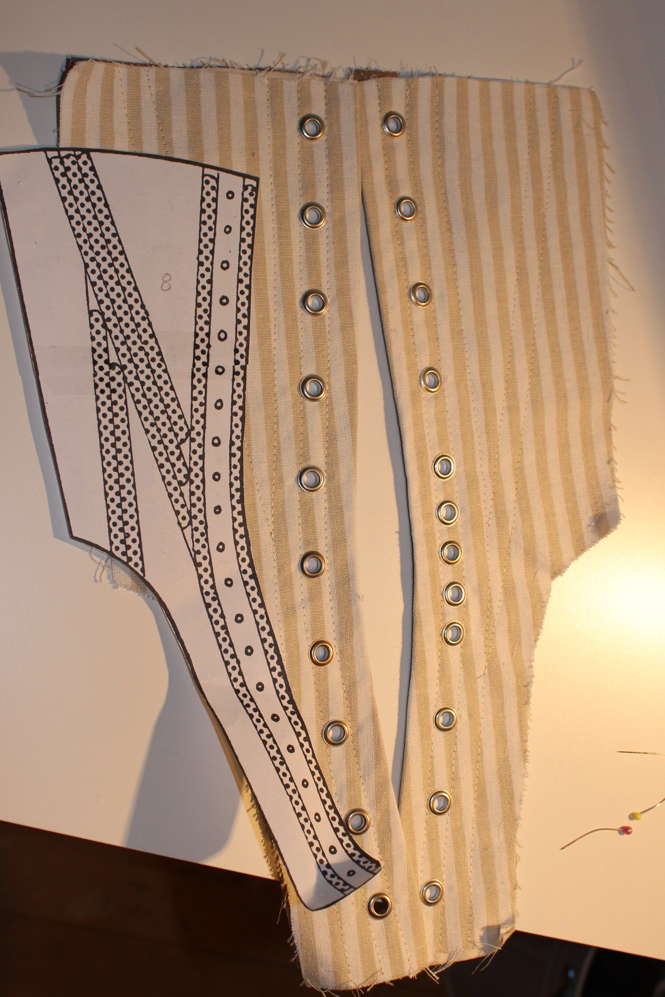 Notions: 2x hooks and eyes, thread, 20 cm black bias tape, 1m of boning, 1,5 m black cord and 12 gromets.