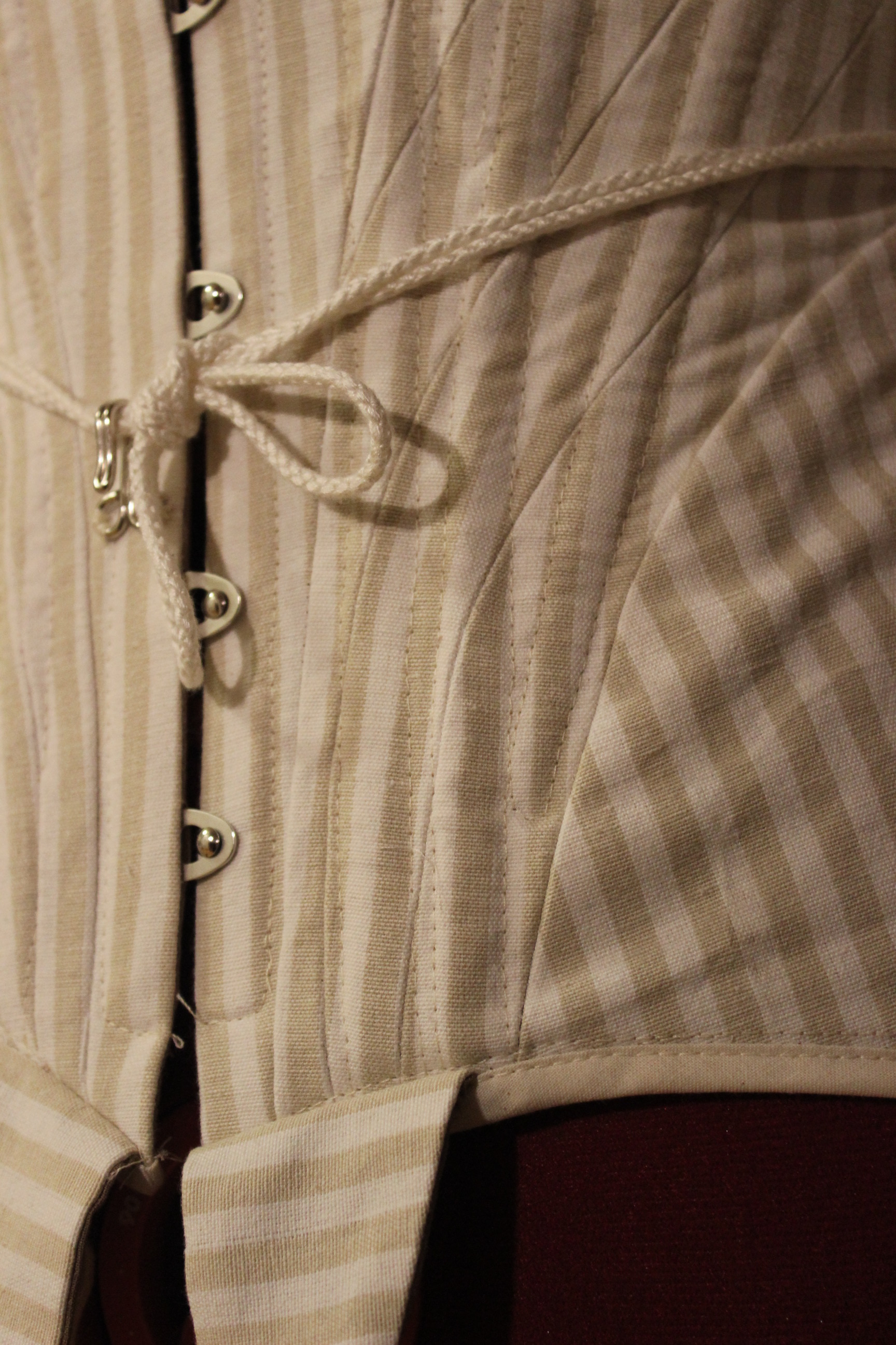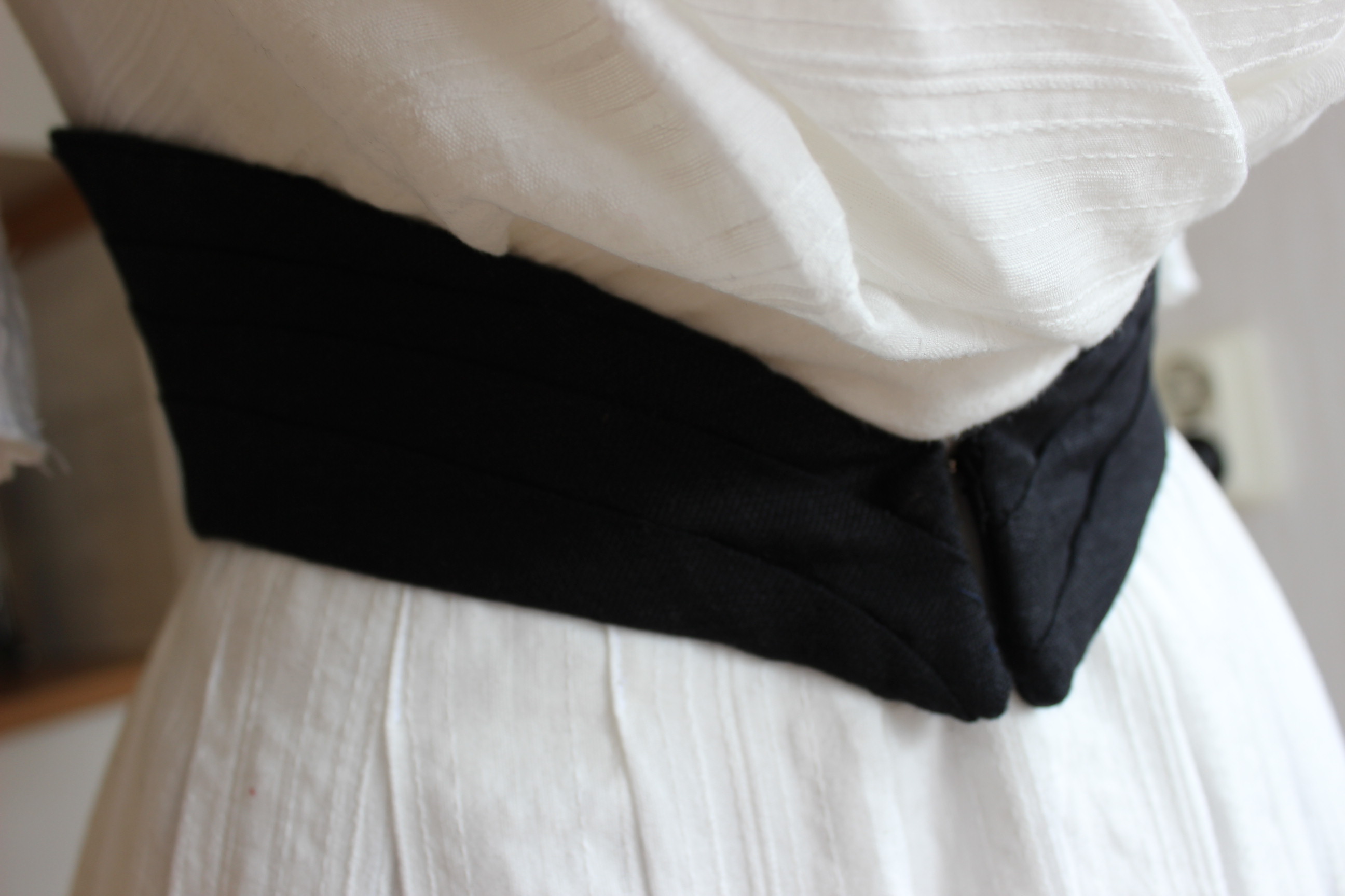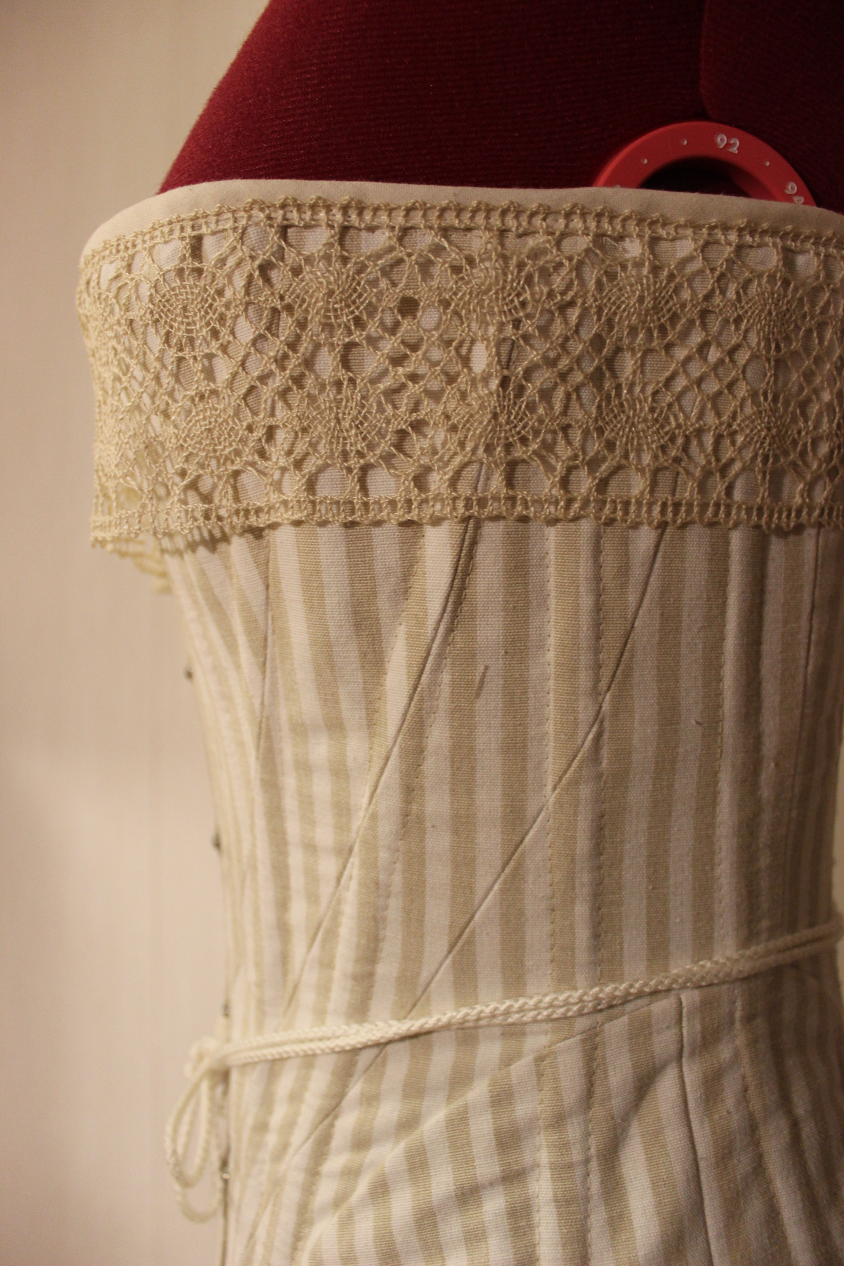 Notions: 2x hooks and eyes, thread, 20 cm black bias tape, 1m of boning, 1,5 m black cord and 12 gromets.