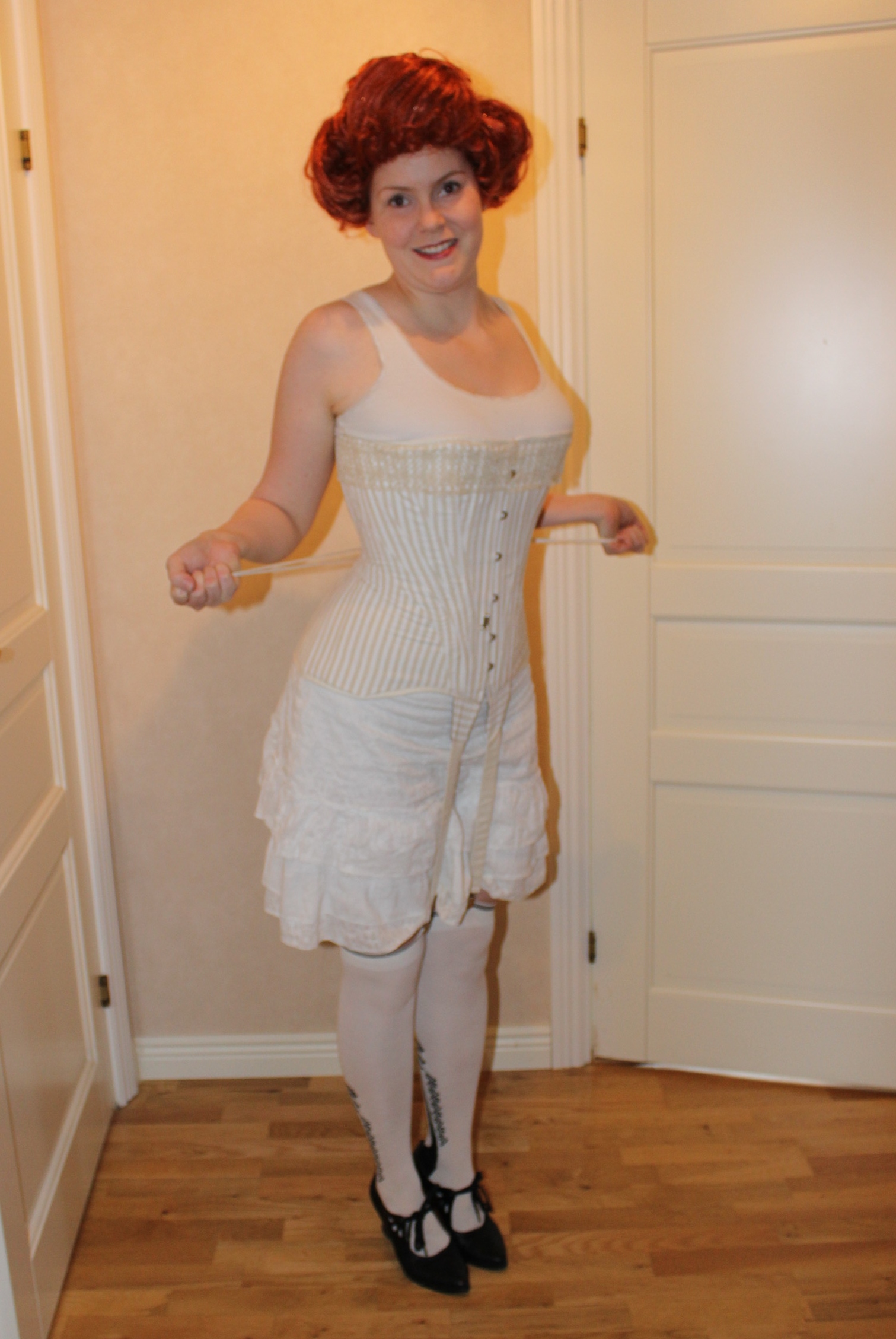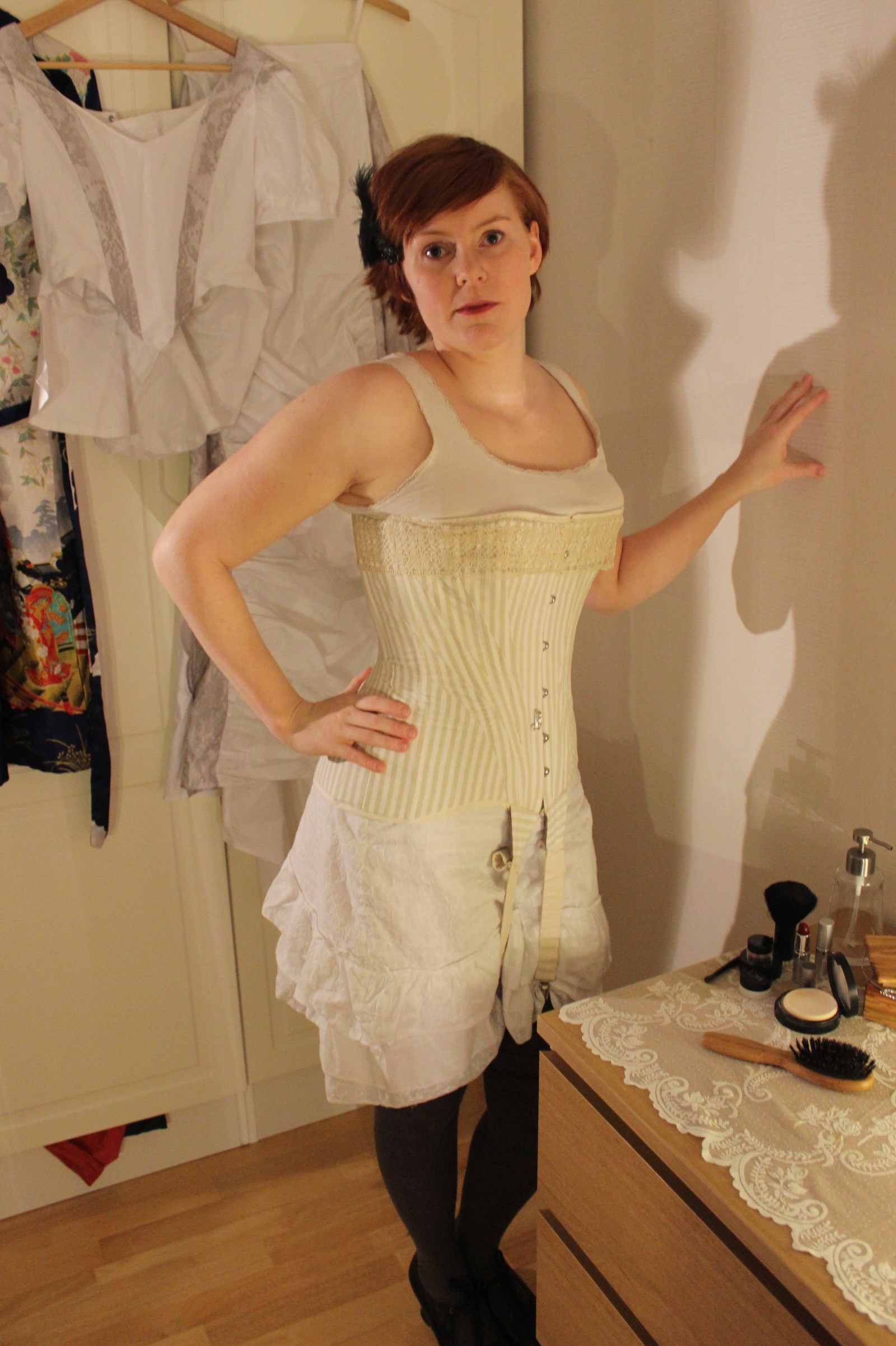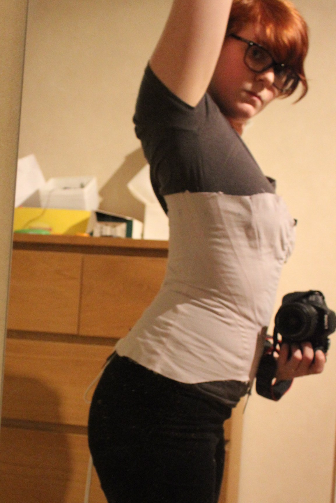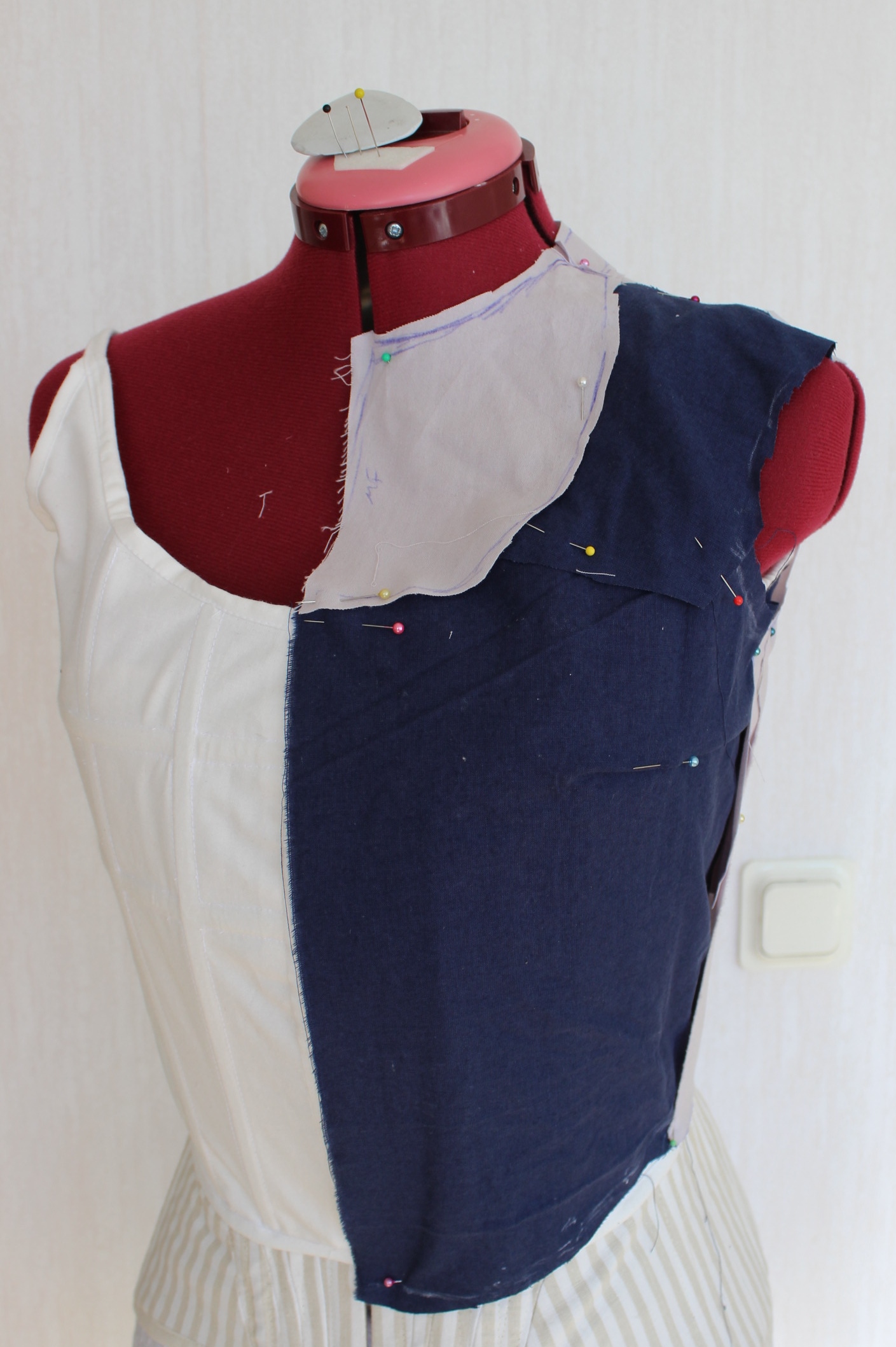 Notions: 2x hooks and eyes, thread, 20 cm black bias tape, 1m of boning, 1,5 m black cord and 12 gromets.