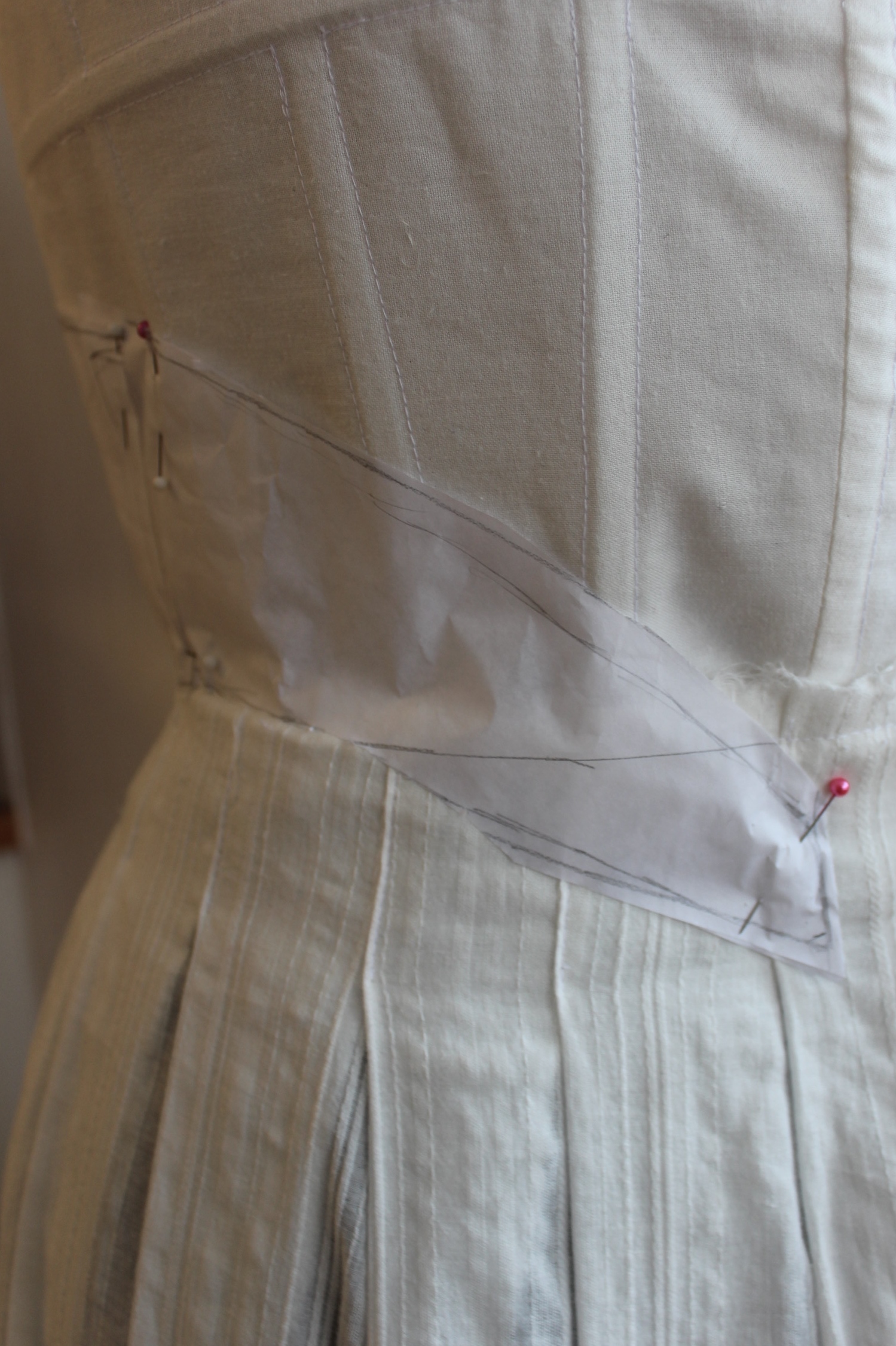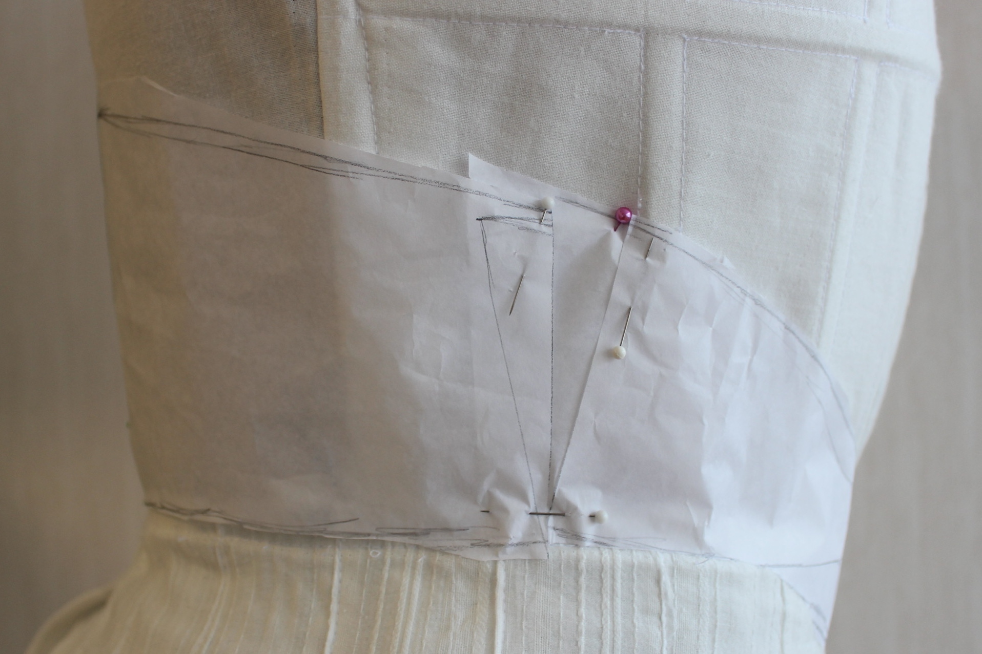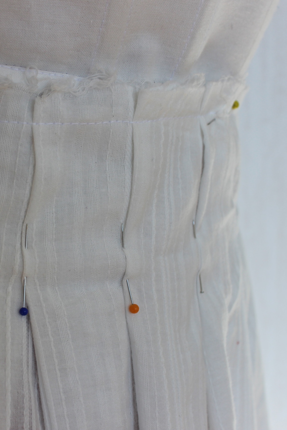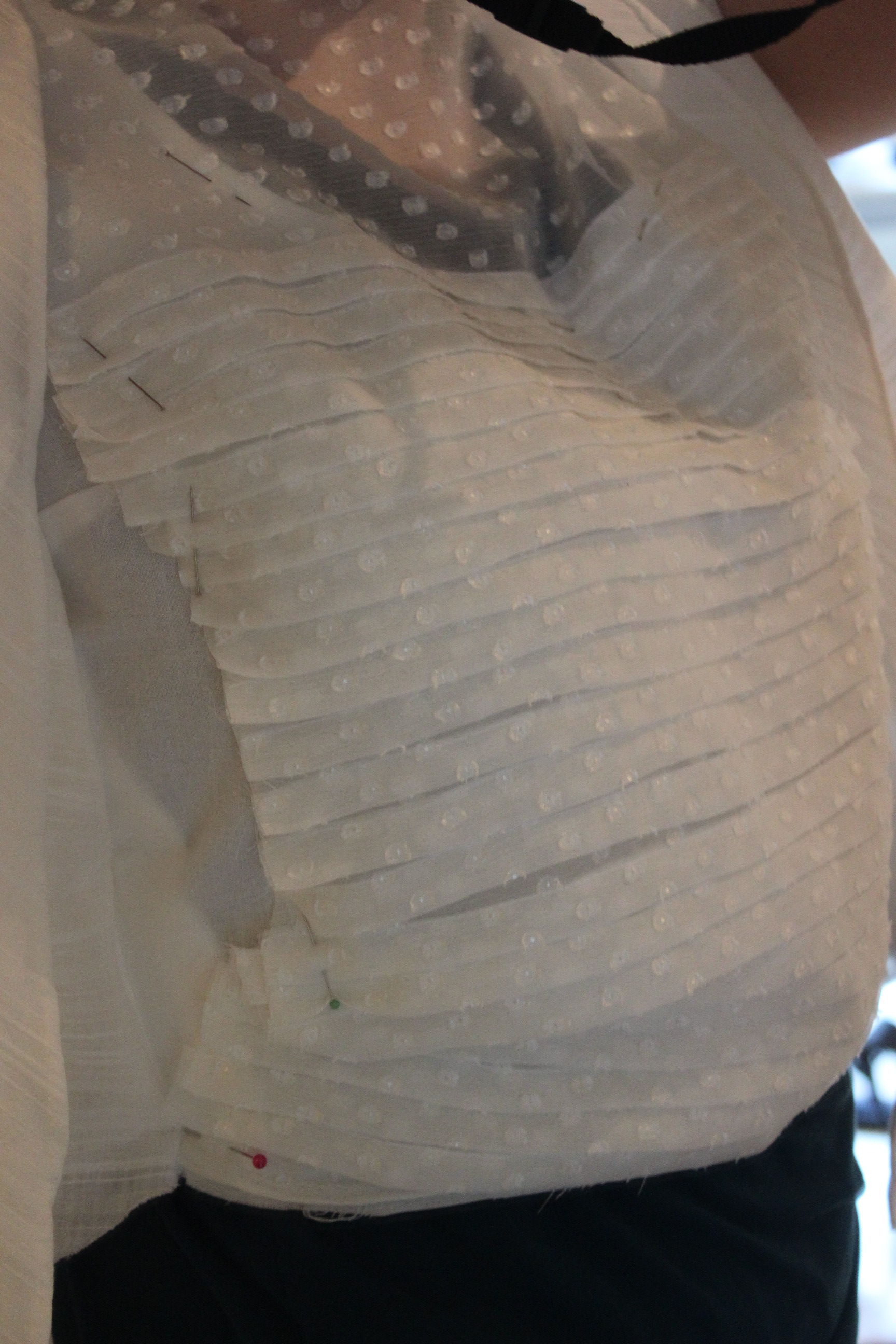 Pinnig the cotton voile on the bias to the foundation piece while attached to the dressform.