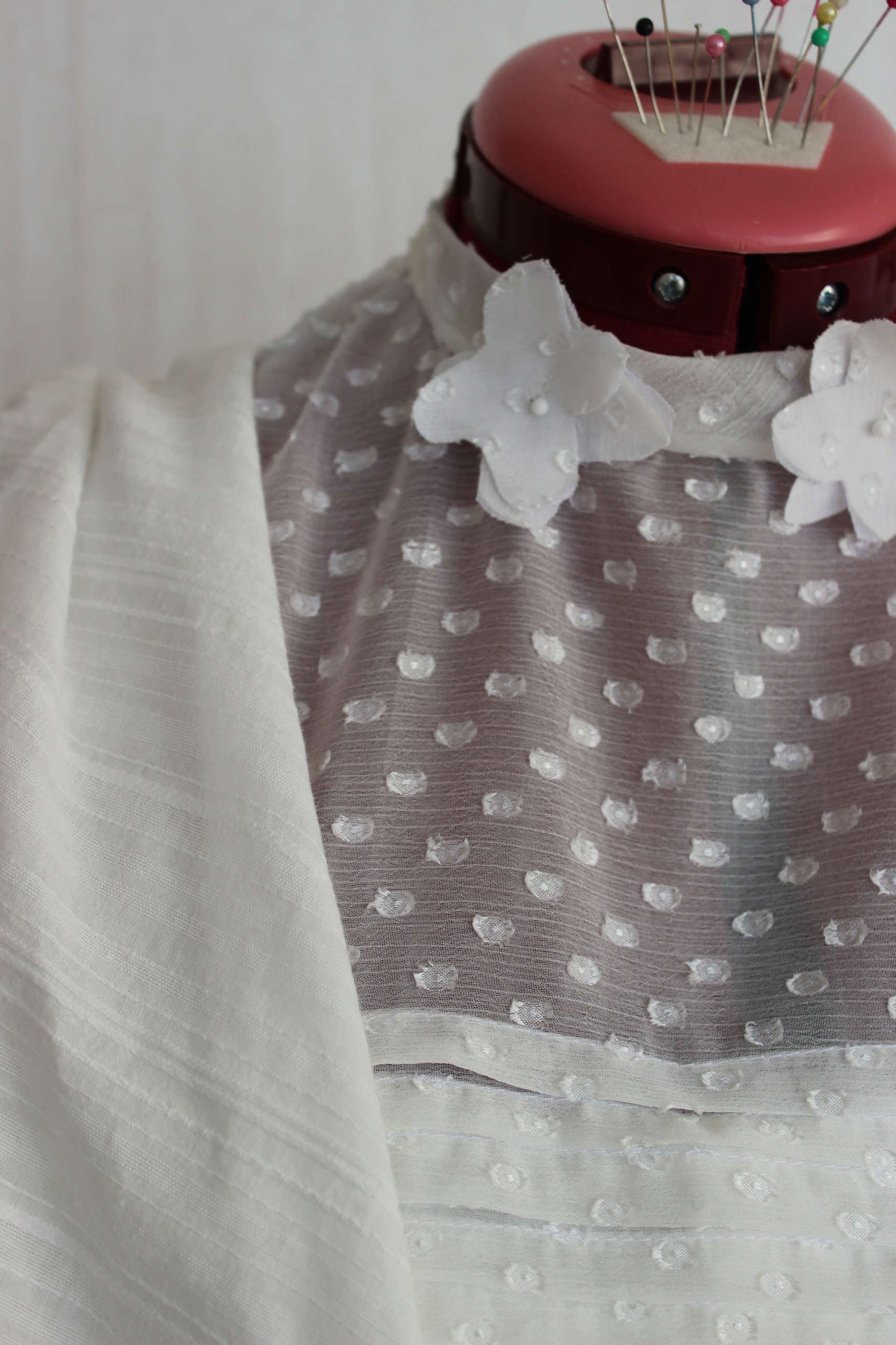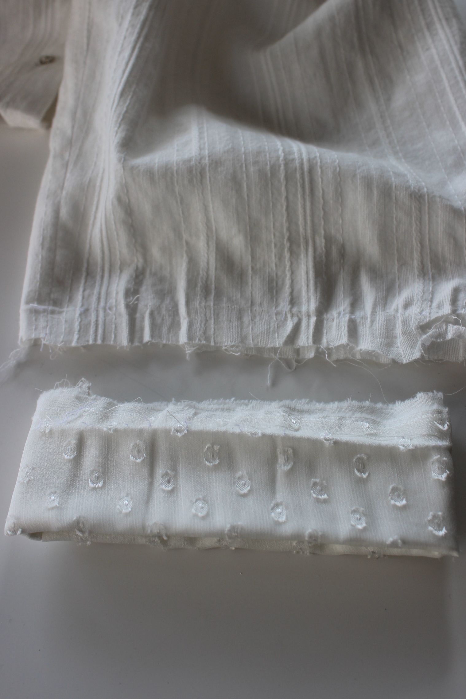 I decided on the plain cotton fabric (center top) for the foundation, and the cotton voile/cheese-cloth (top left) for the draping.