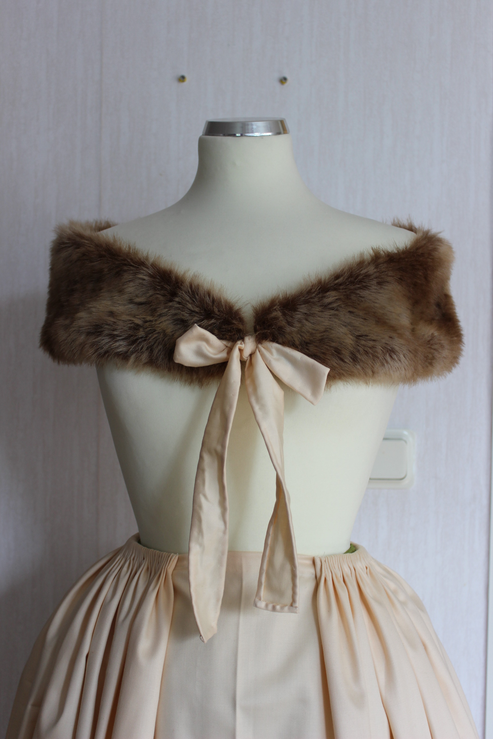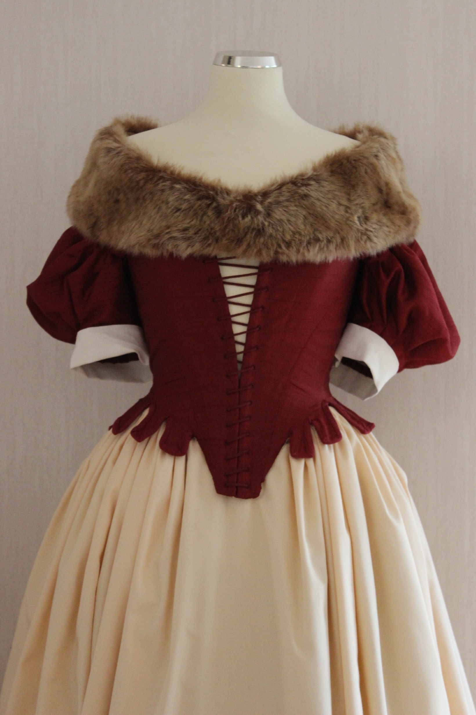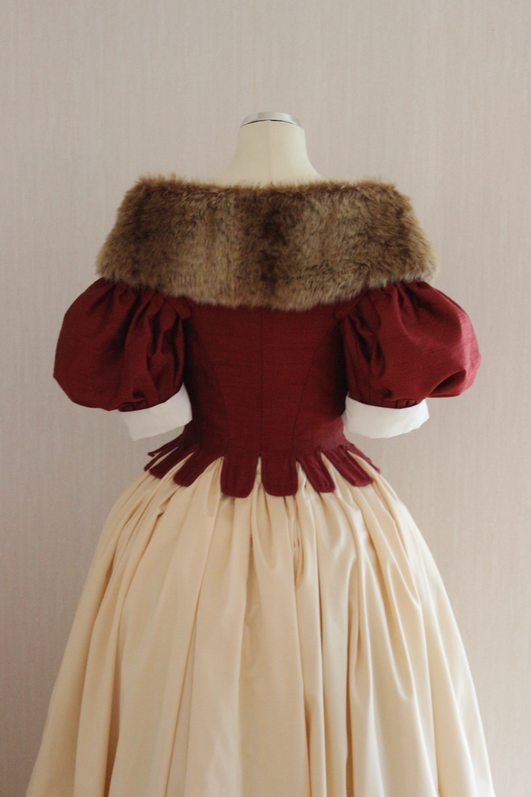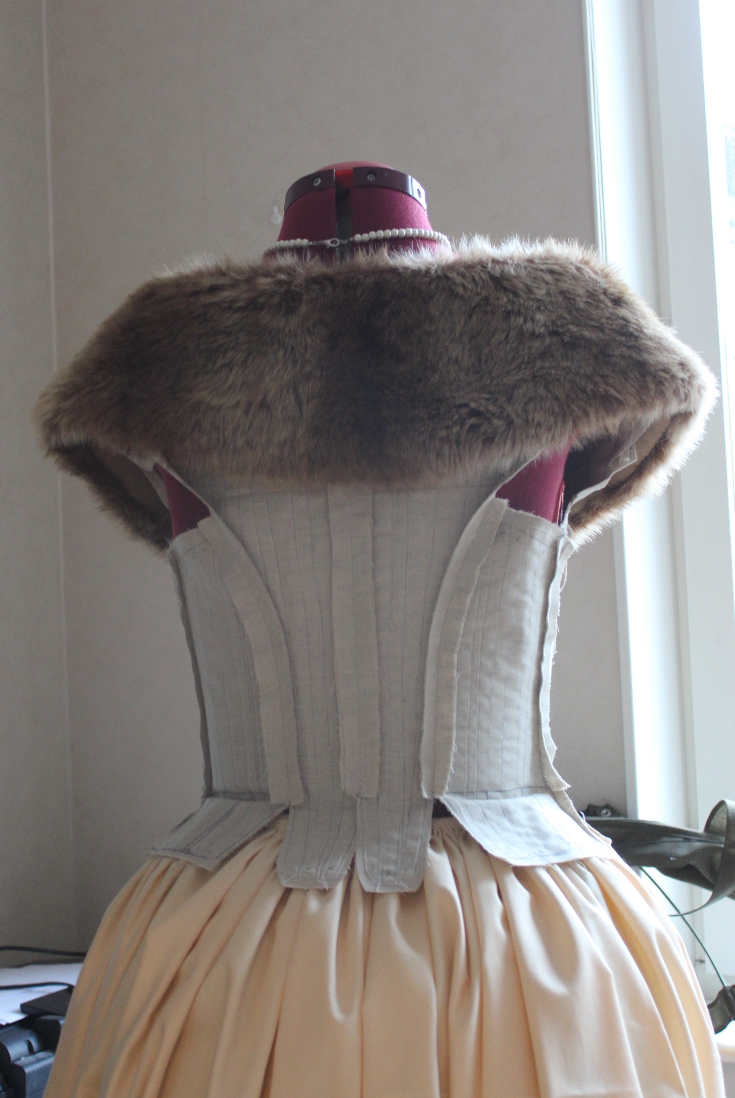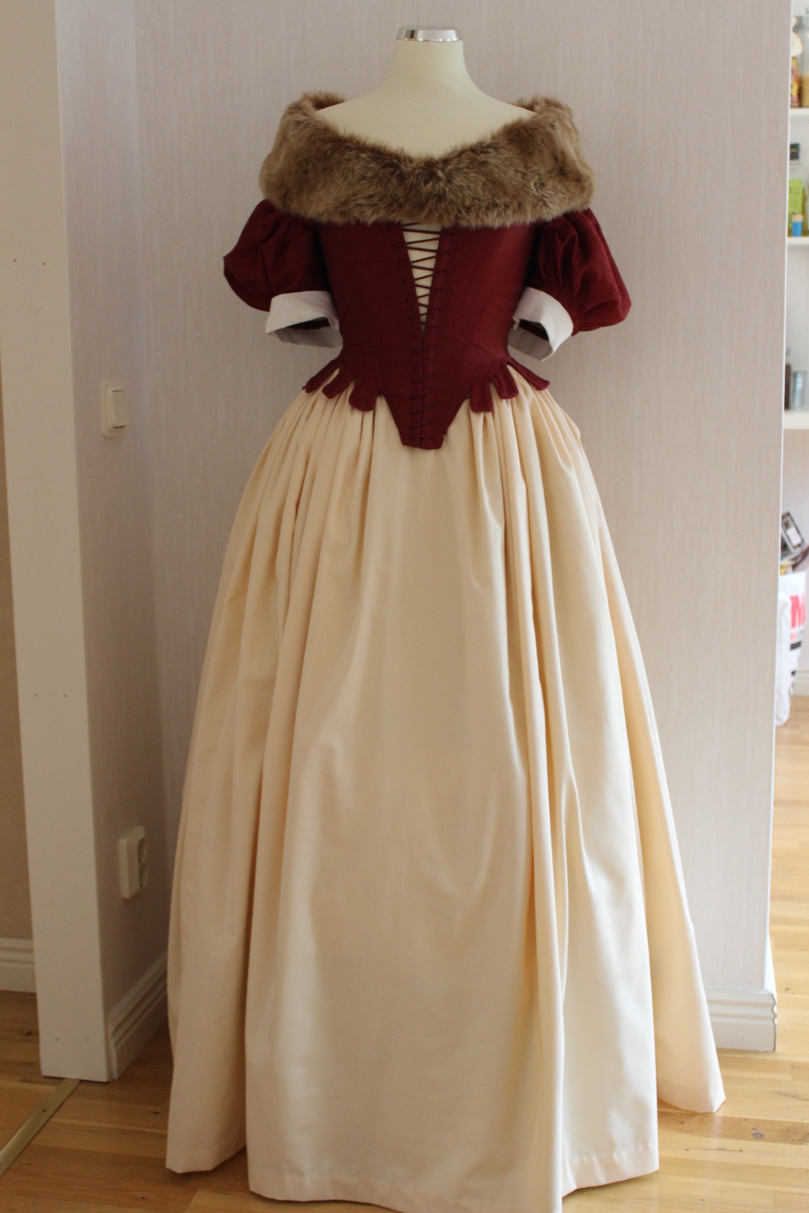 After some searching, both for inspirational pictures and in the fabric stores, I decided on a dark brown faux “wolf” fur, that would work nice with the red and browns in the gown.