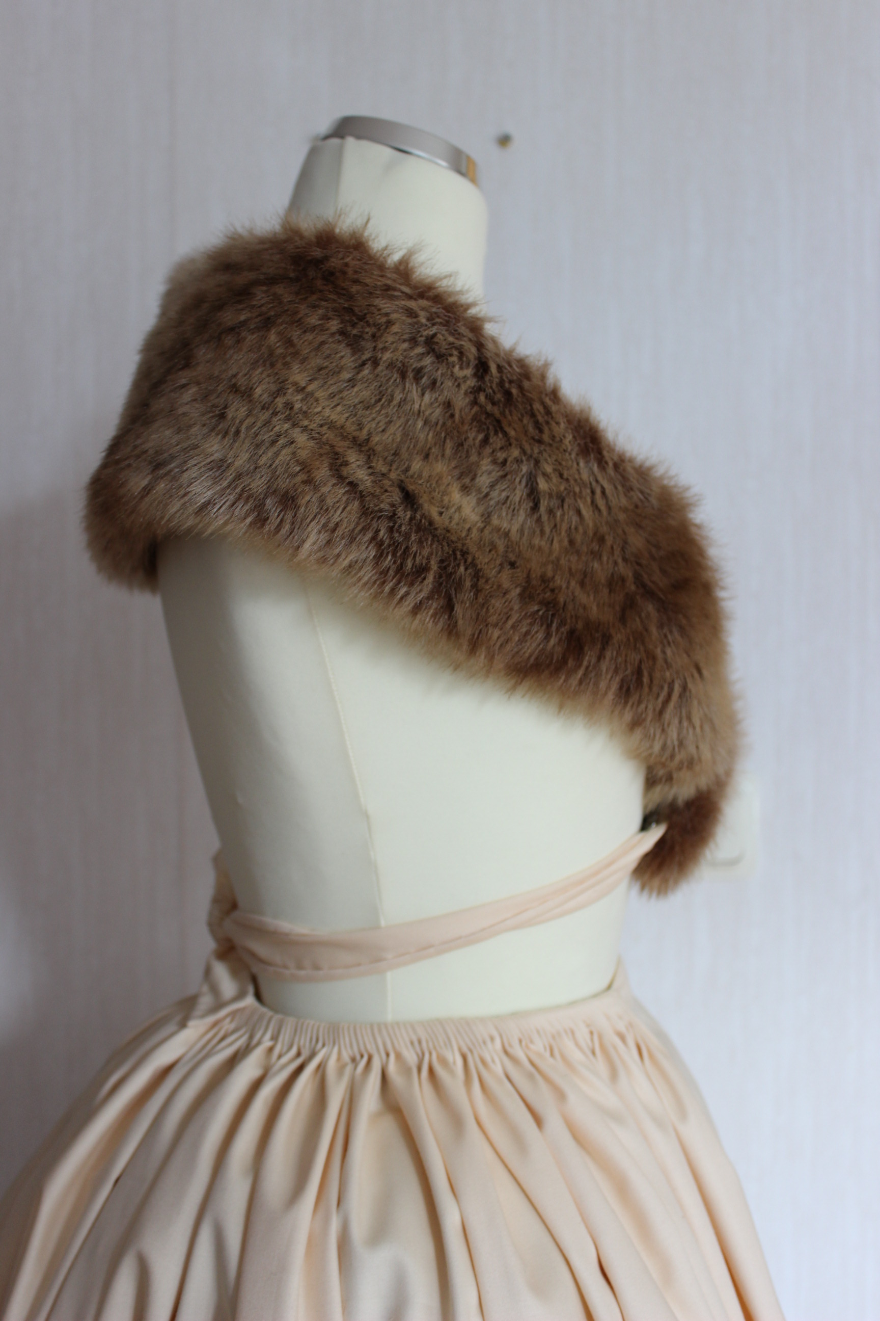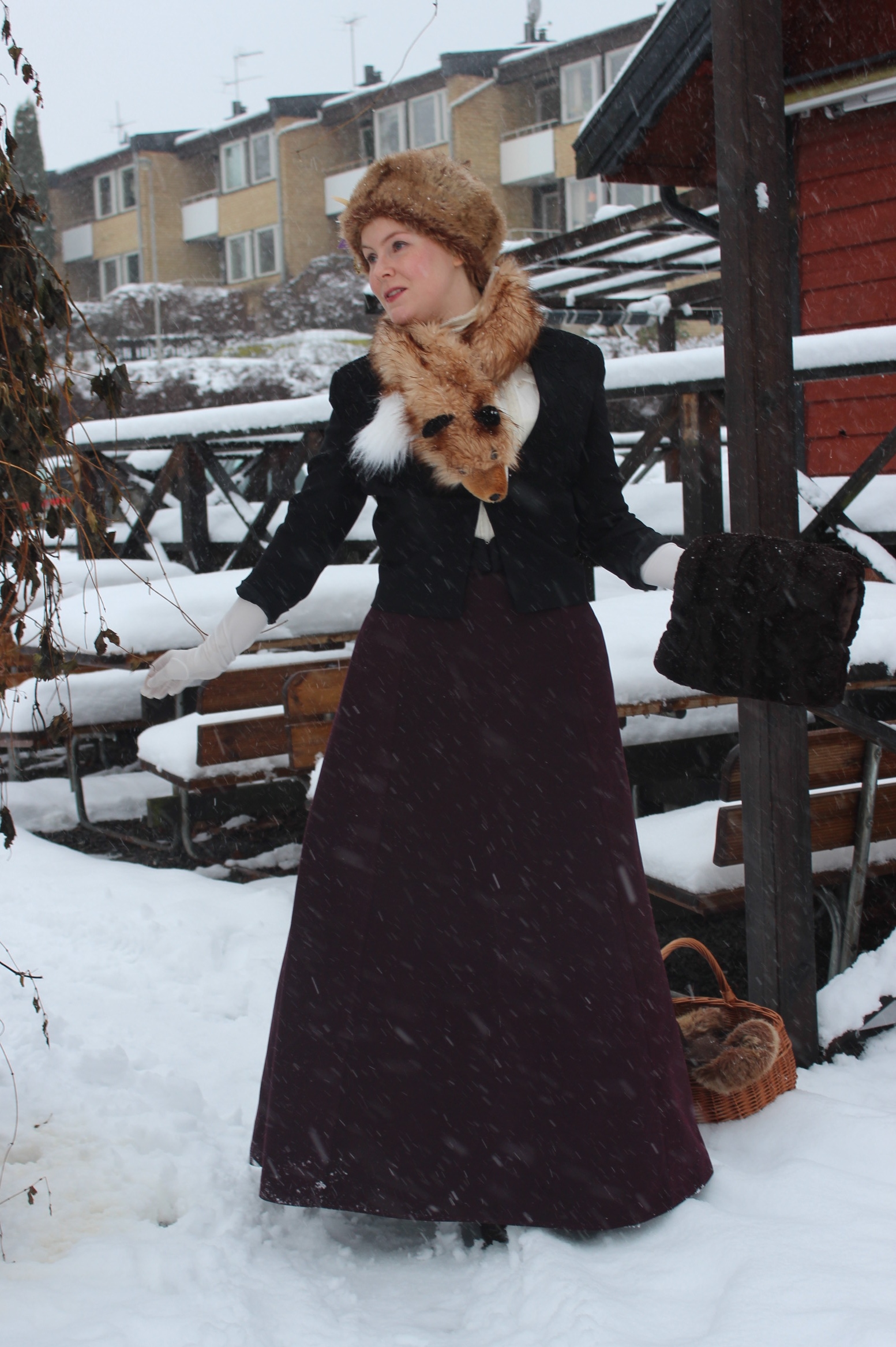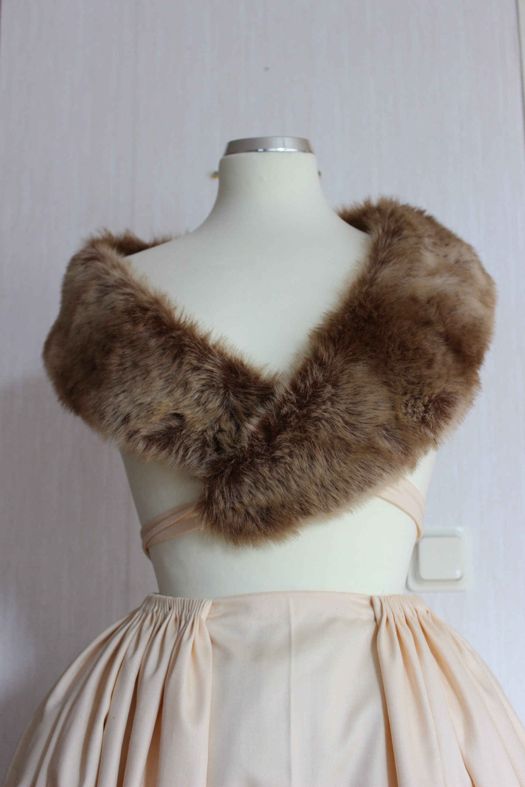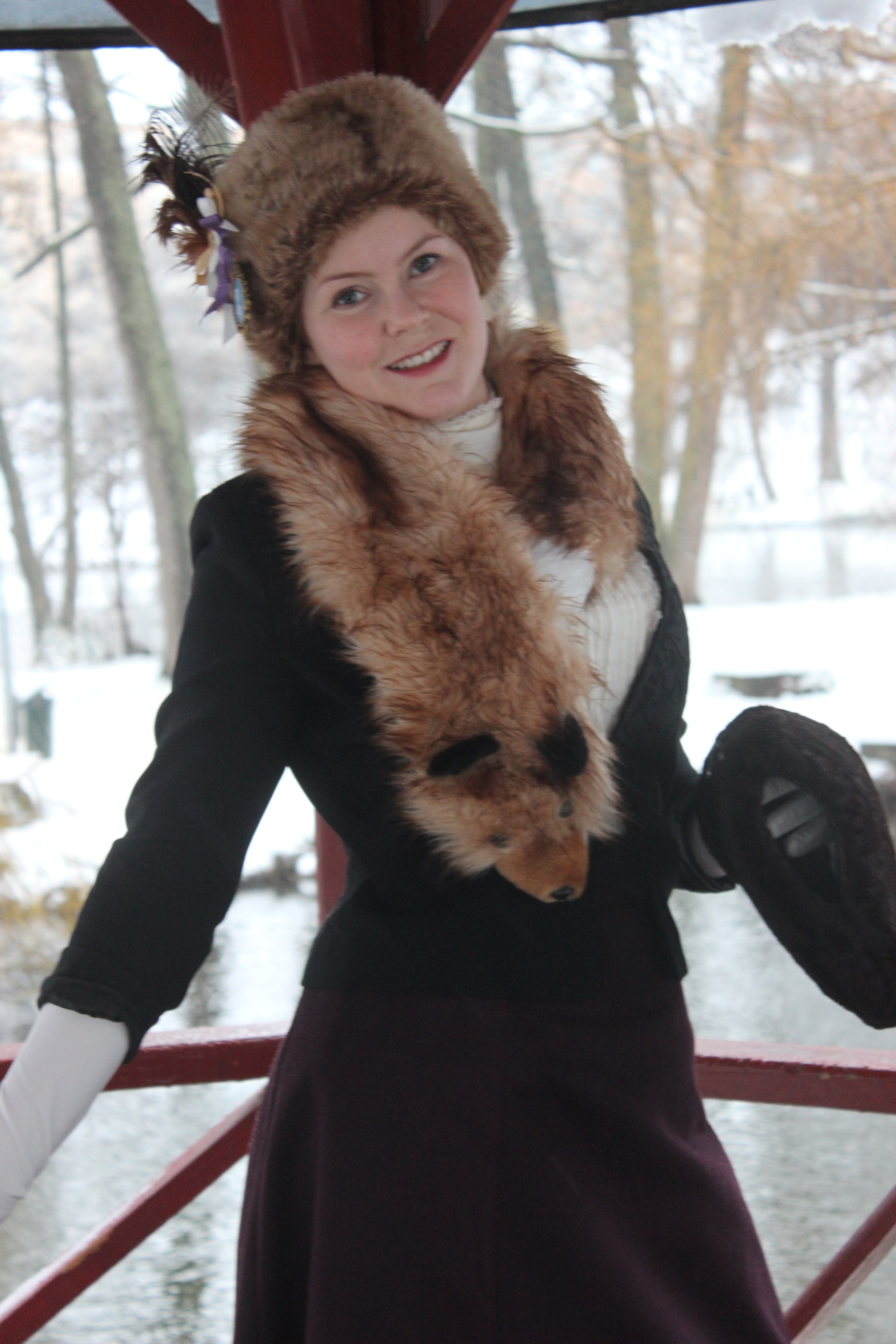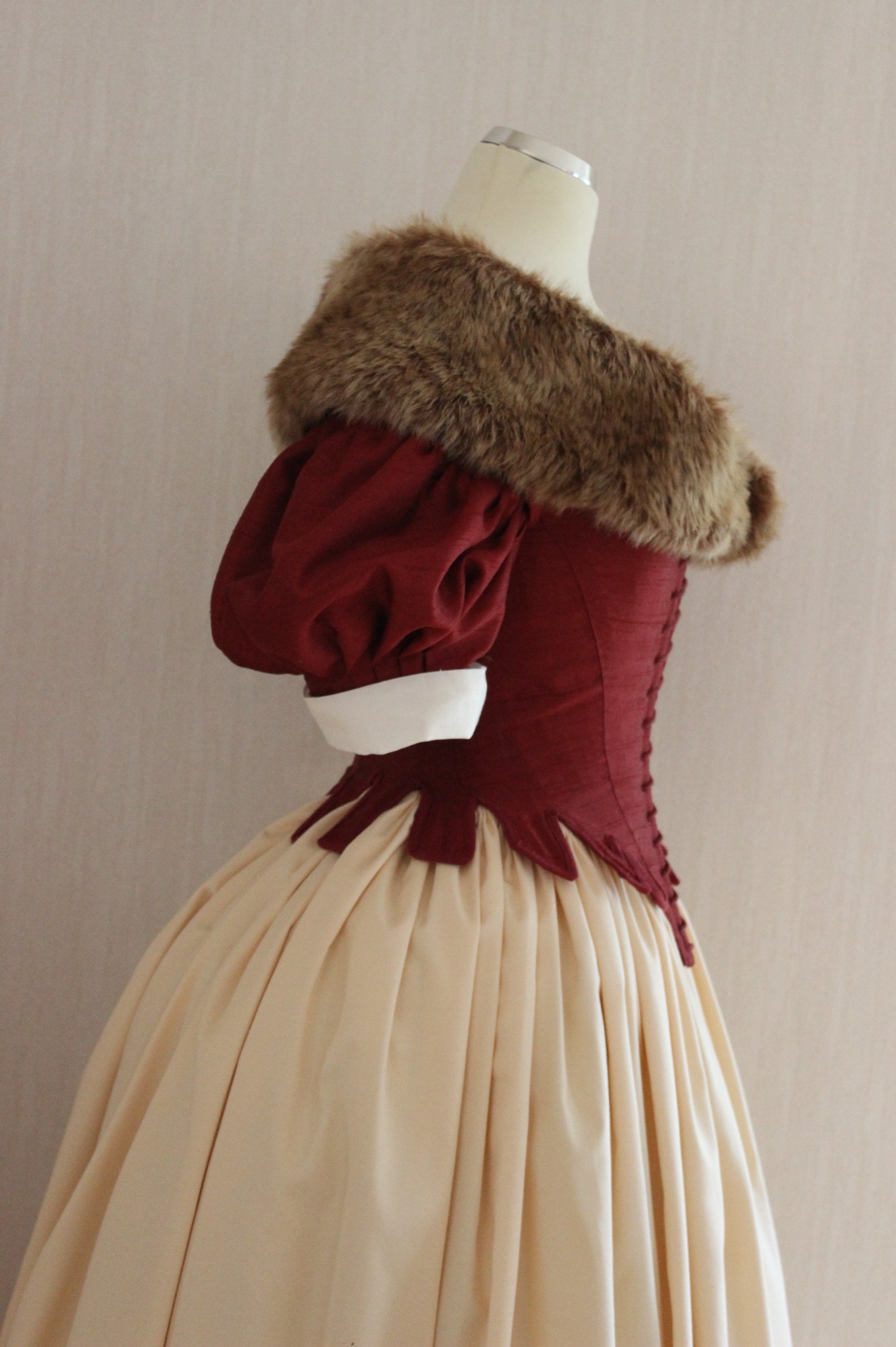After some searching, both for inspirational pictures and in the fabric stores, I decided on a dark brown faux “wolf” fur, that would work nice with the red and browns in the gown.