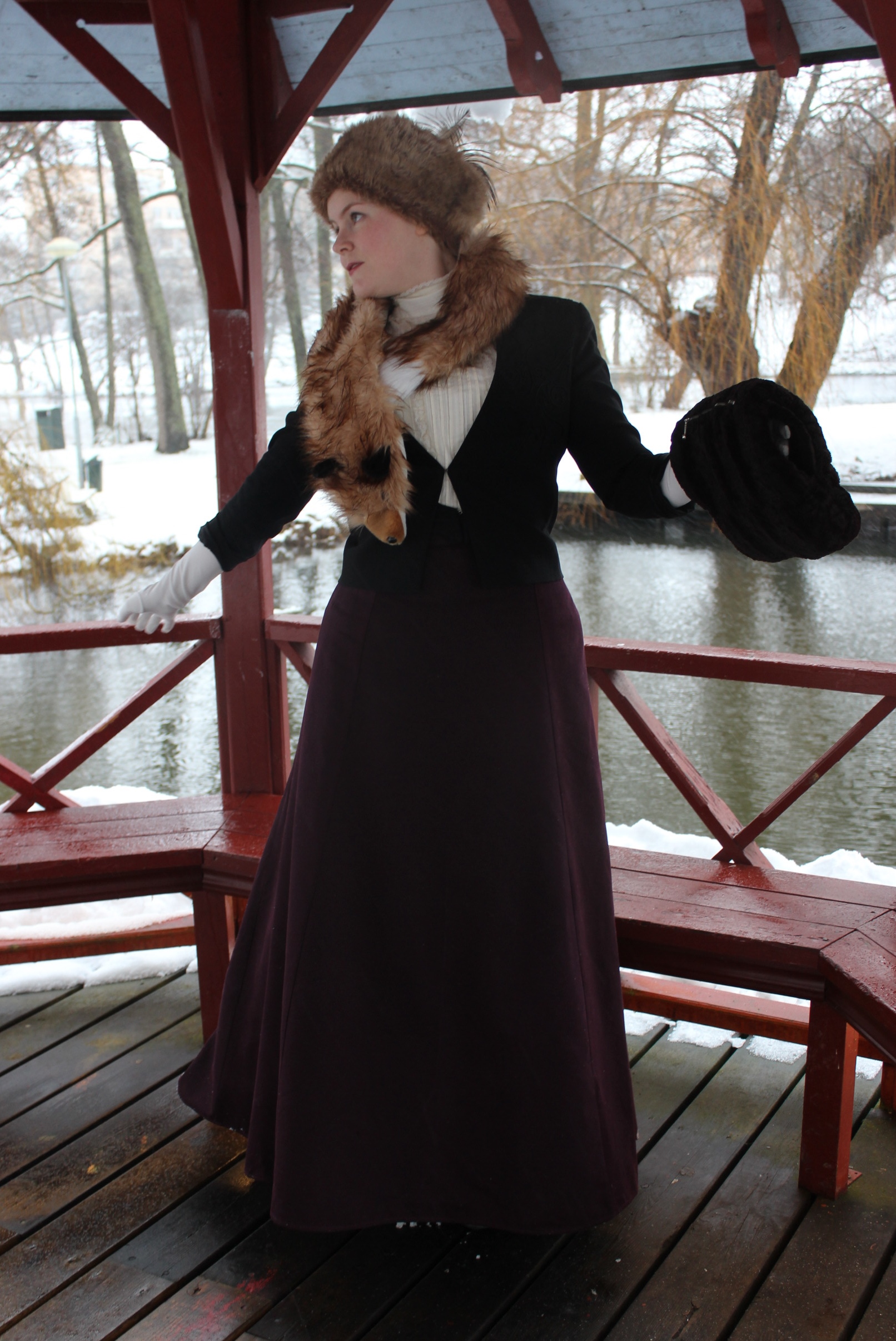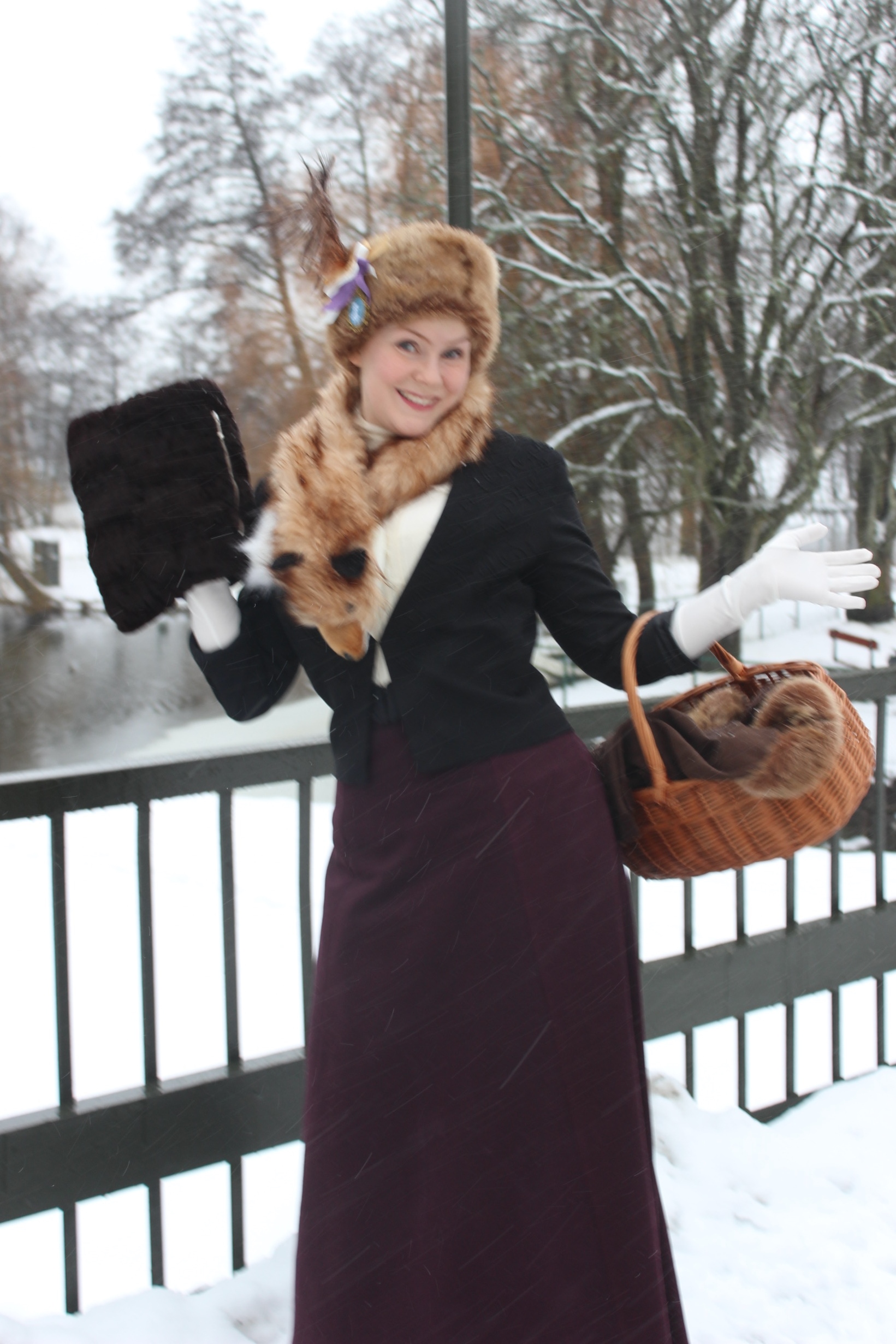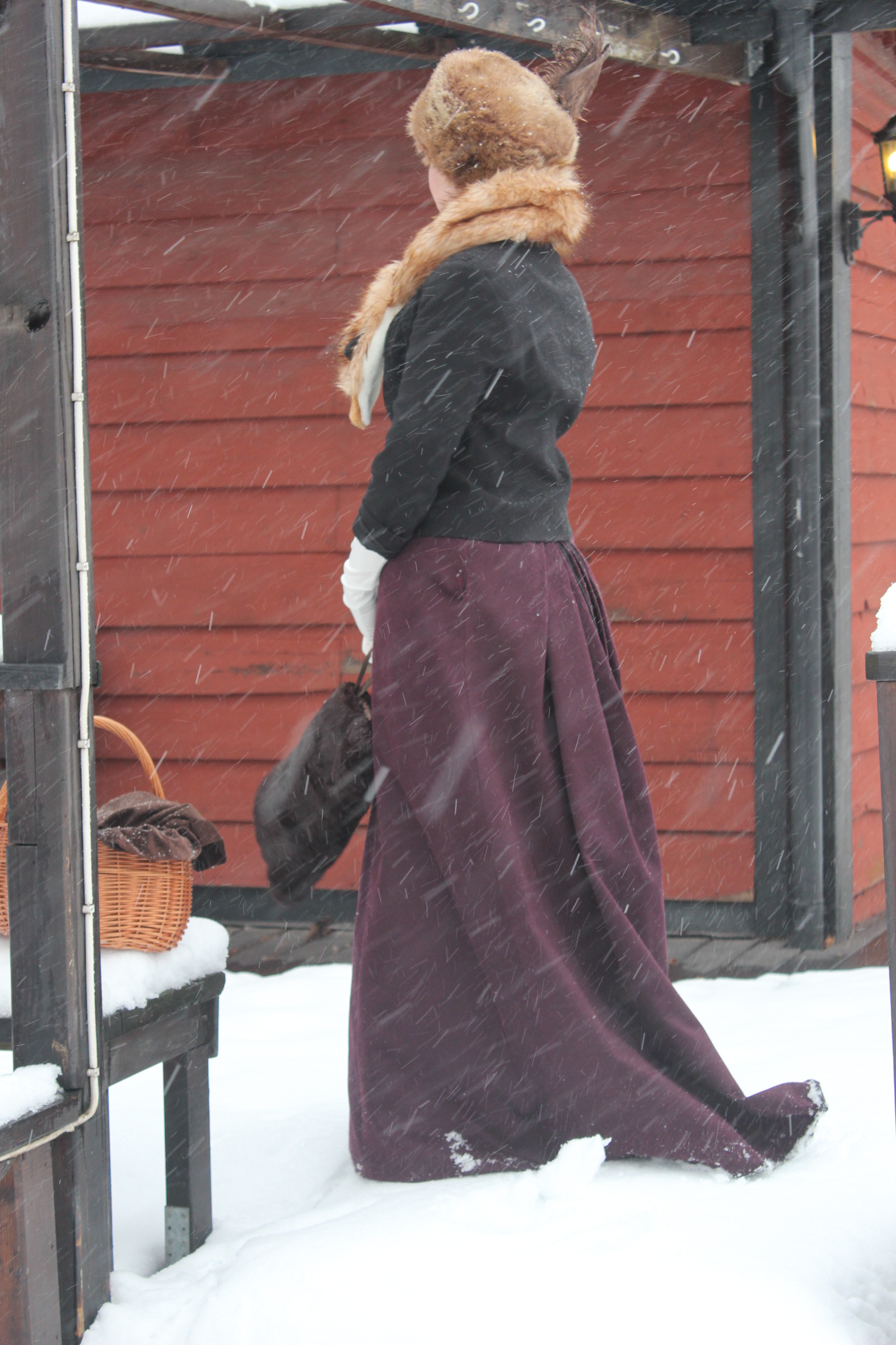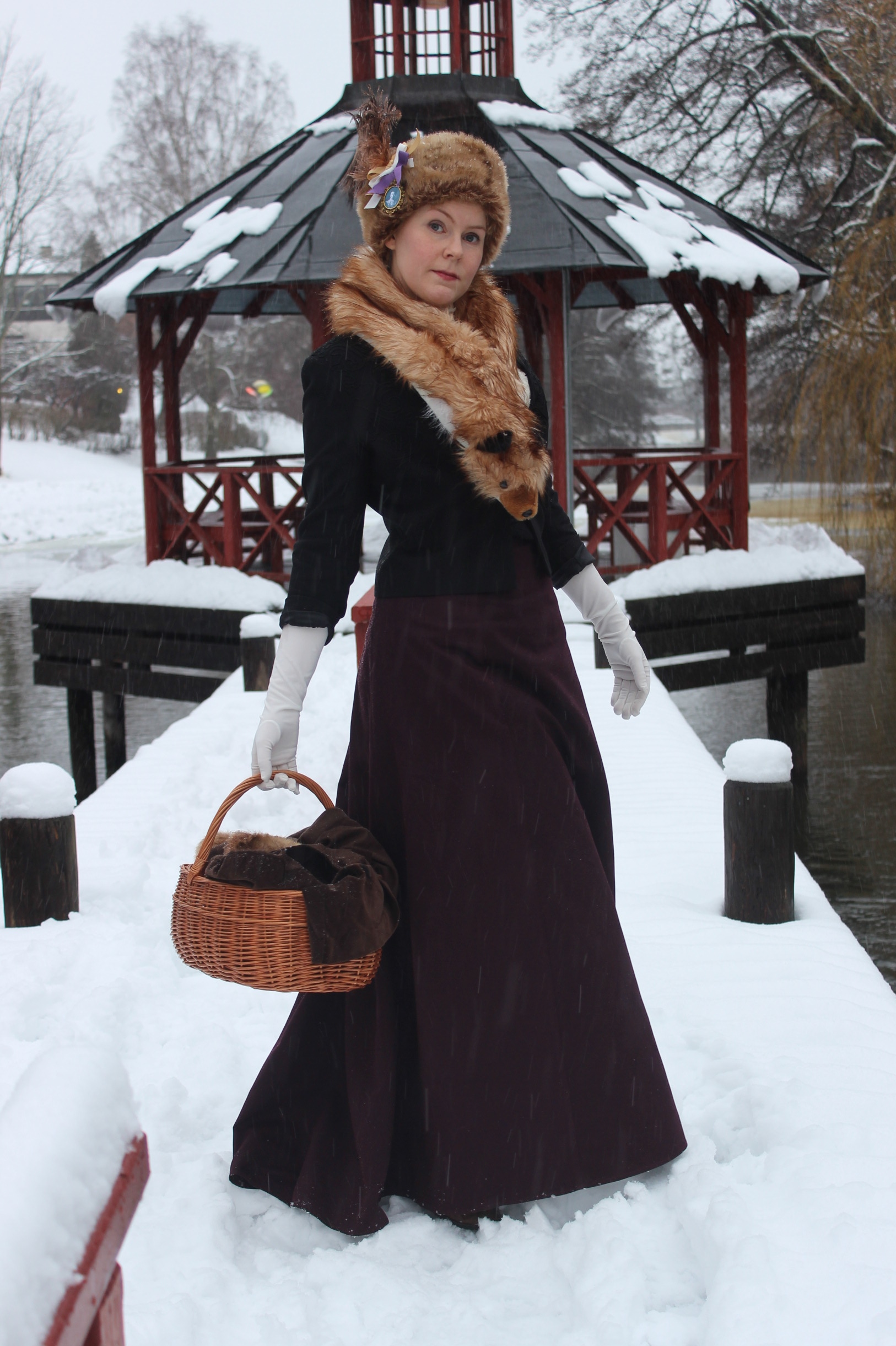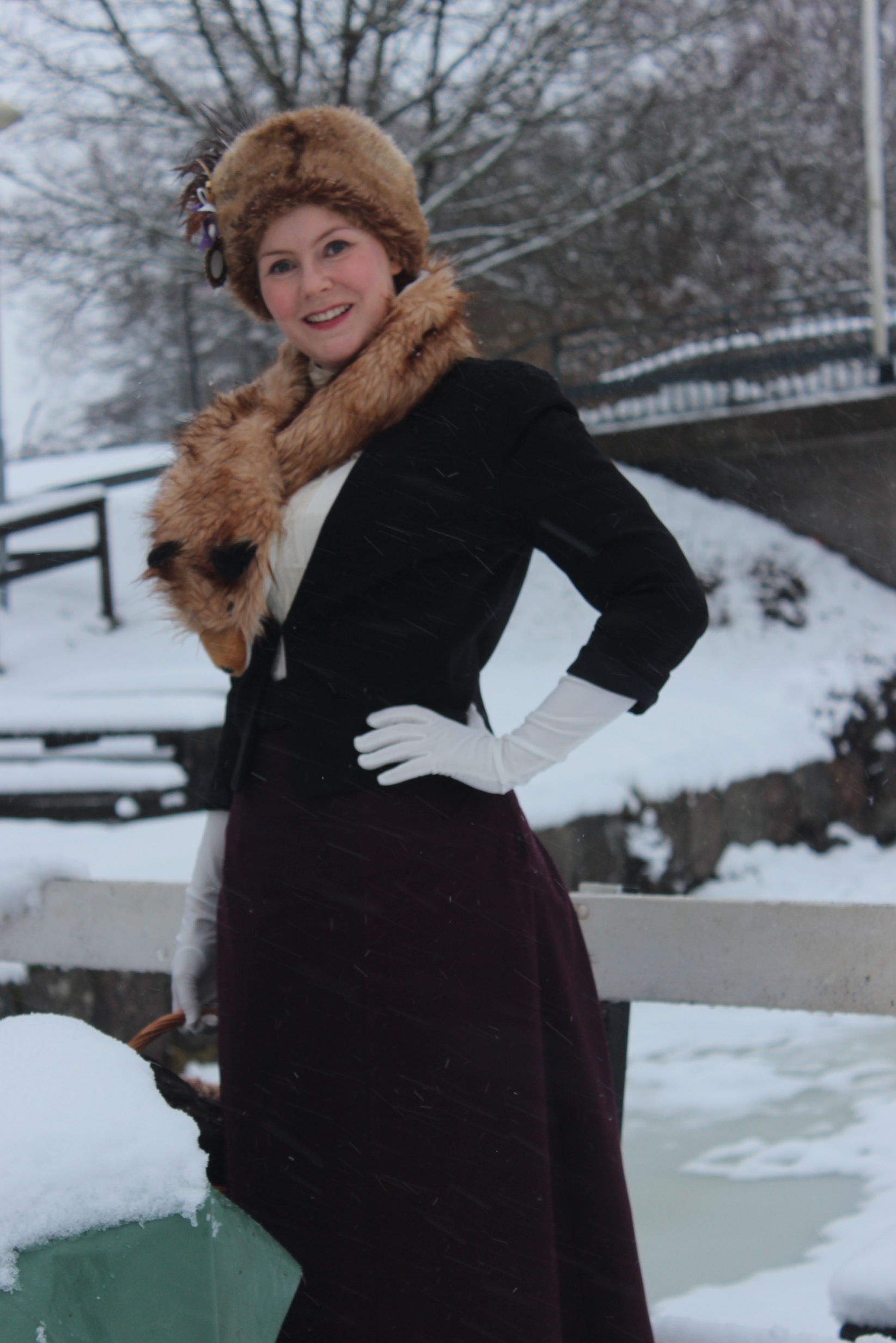 After some searching, both for inspirational pictures and in the fabric stores, I decided on a dark brown faux “wolf” fur, that would work nice with the red and browns in the gown.