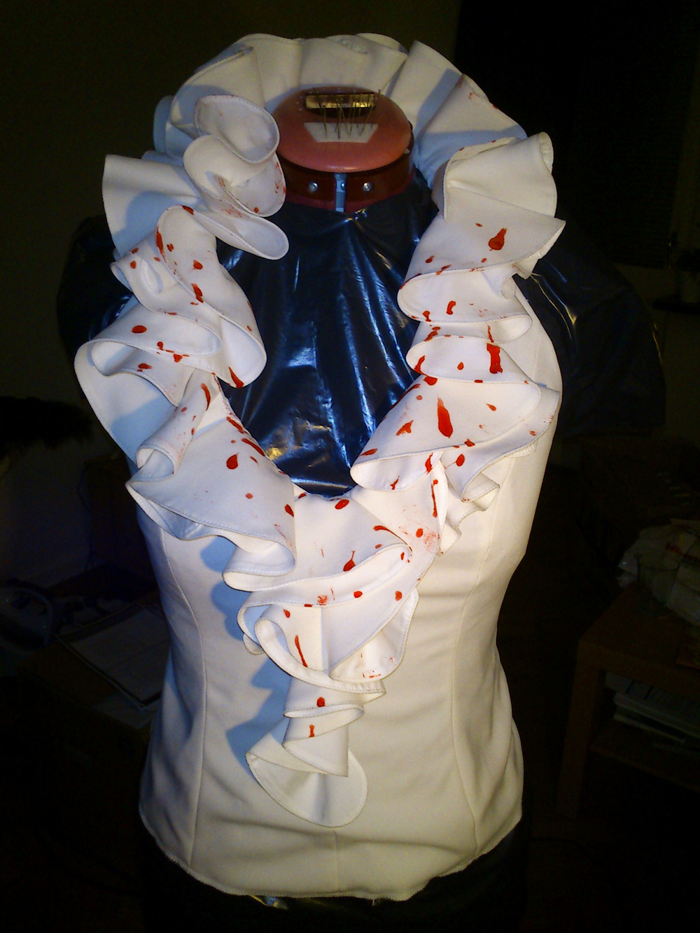 I made a simple halter top and sewed the ruffles on to it. Then I dripped and painted faux blood on it.