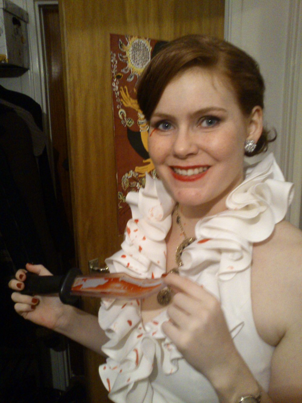 Then I grabed the scissors and the faux blood and got to work. Ripping, cutting and dripping blood on both the dress and the apron.