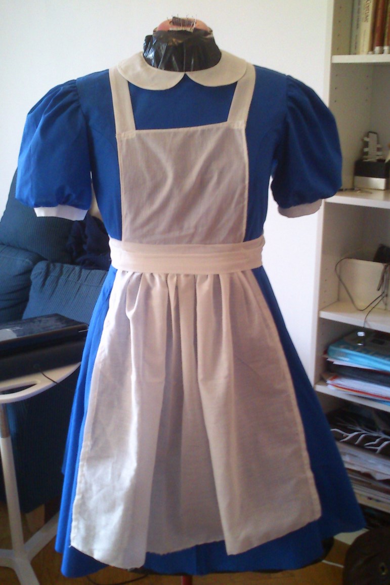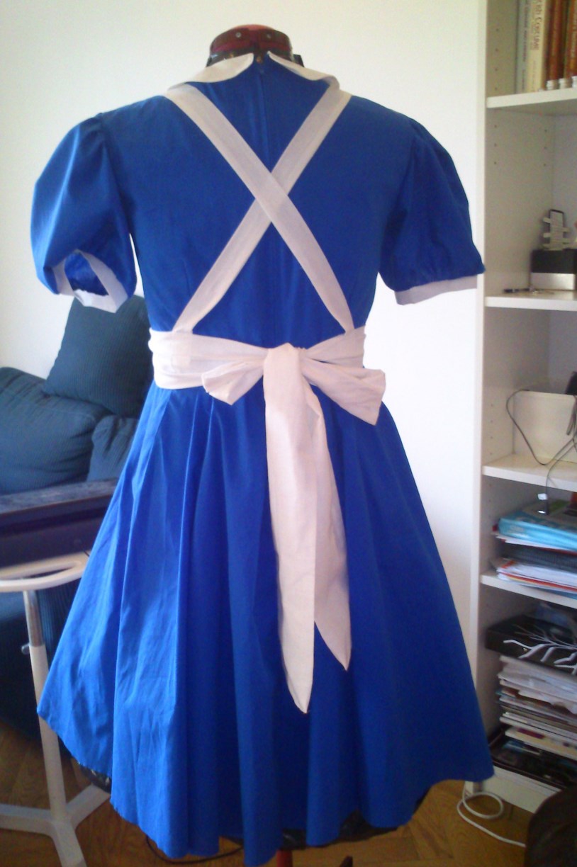 I bought 2 m blue cotton and found some white cotton in my stash. I draw a simple pattern and cut and sewed the dress and apron in one day. I also made a bow headband and bought some white stockings.