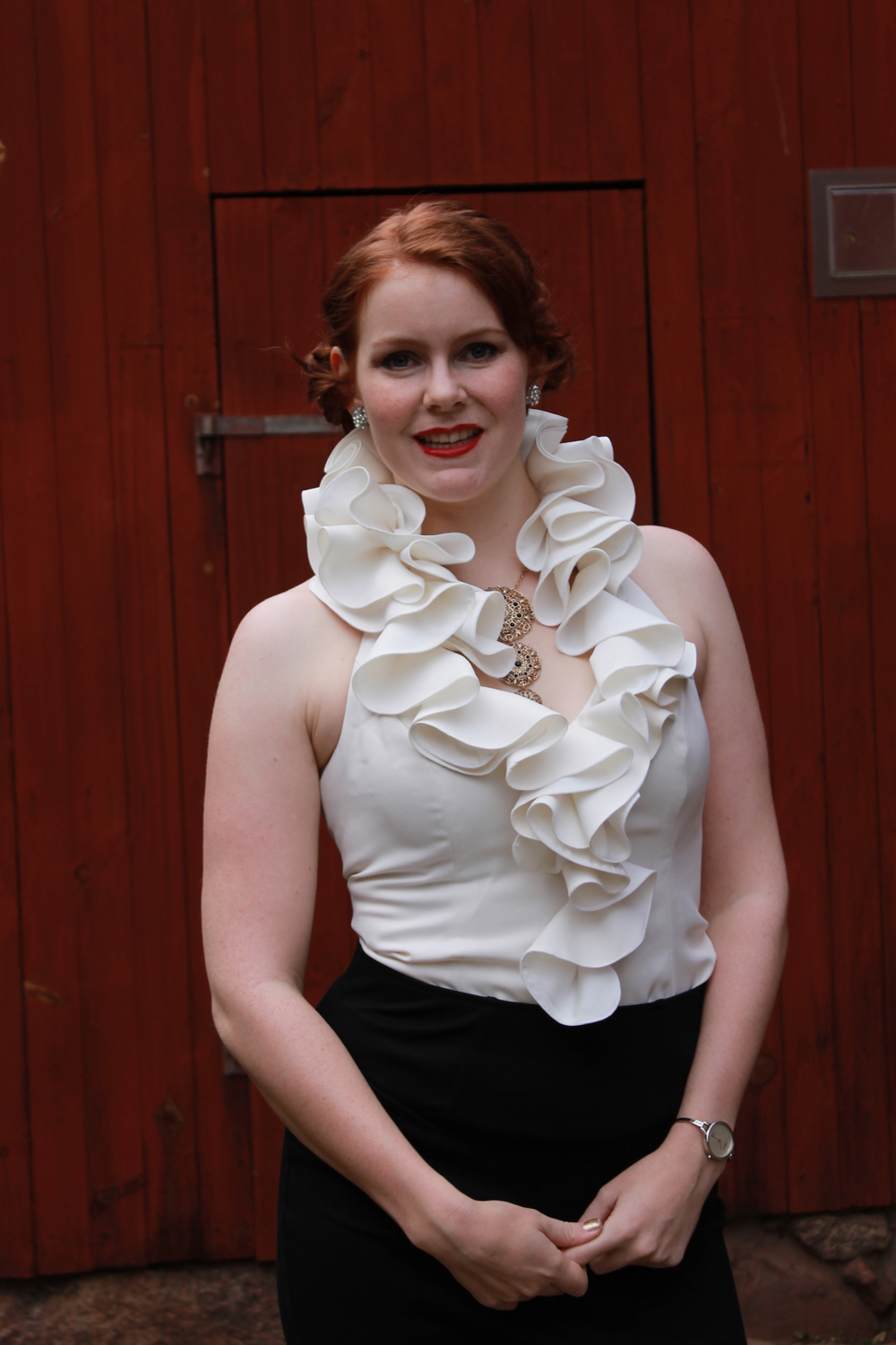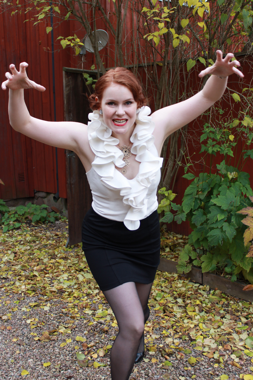 I always loved her outfits and style, and decided to make the white ruffled blouse and little black skirt she wears when being staked to death in the series.