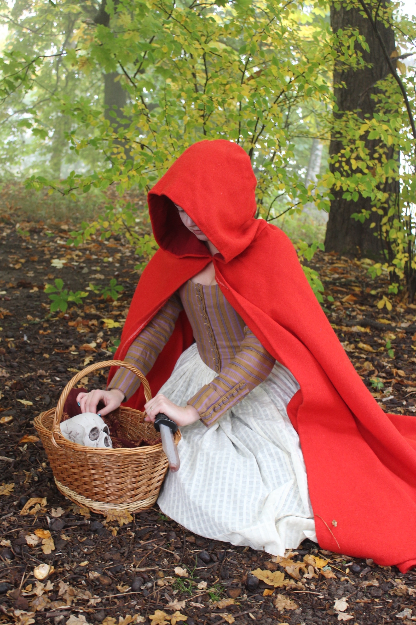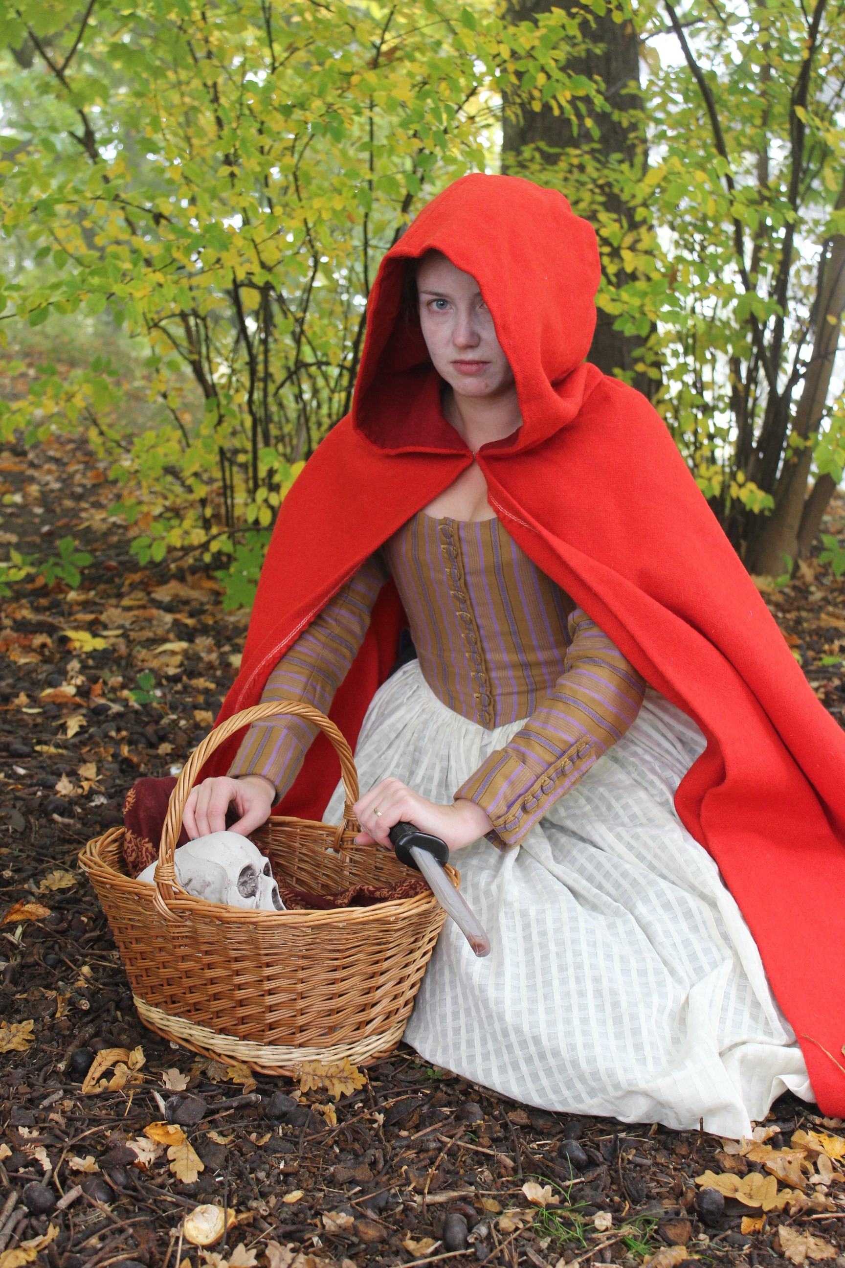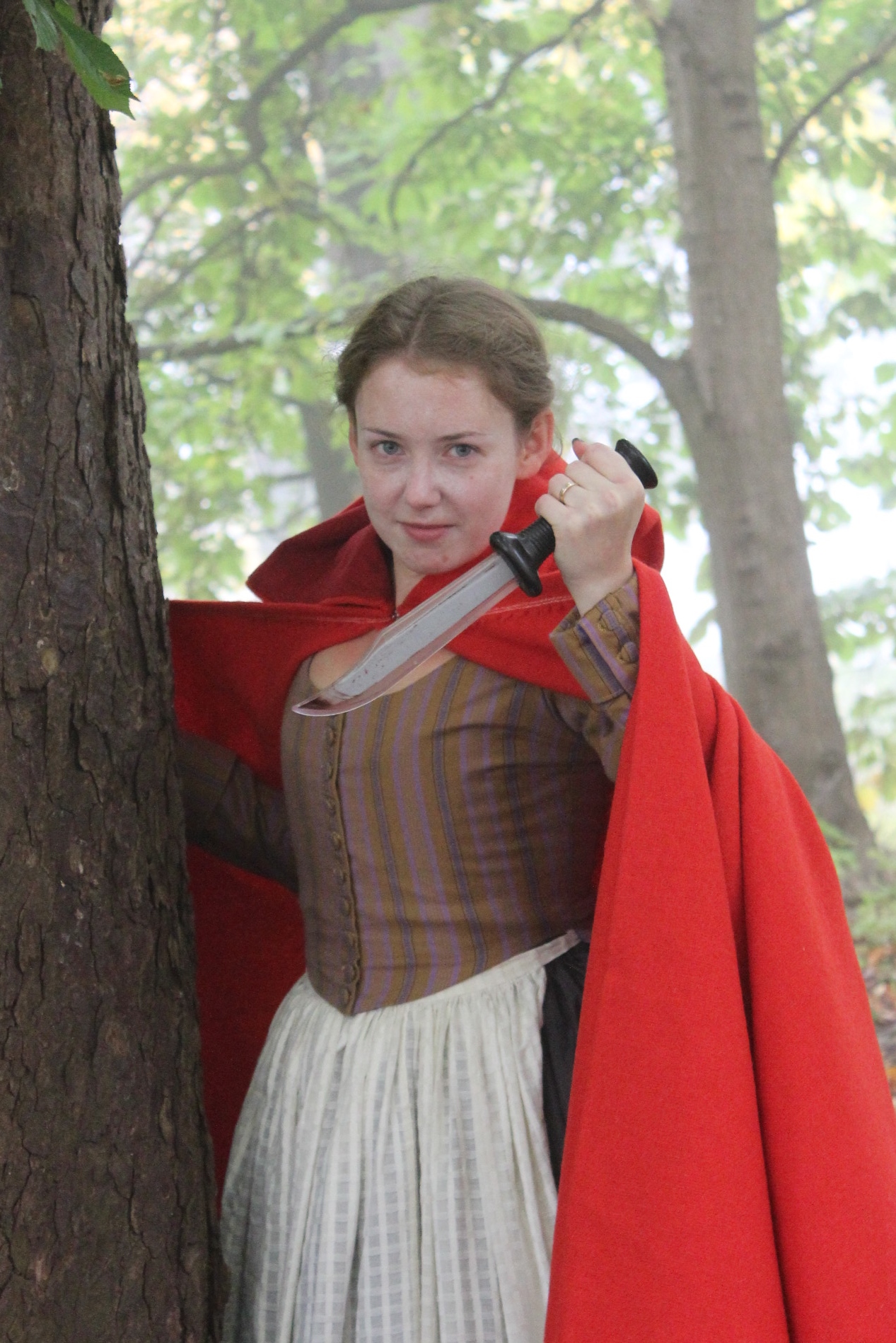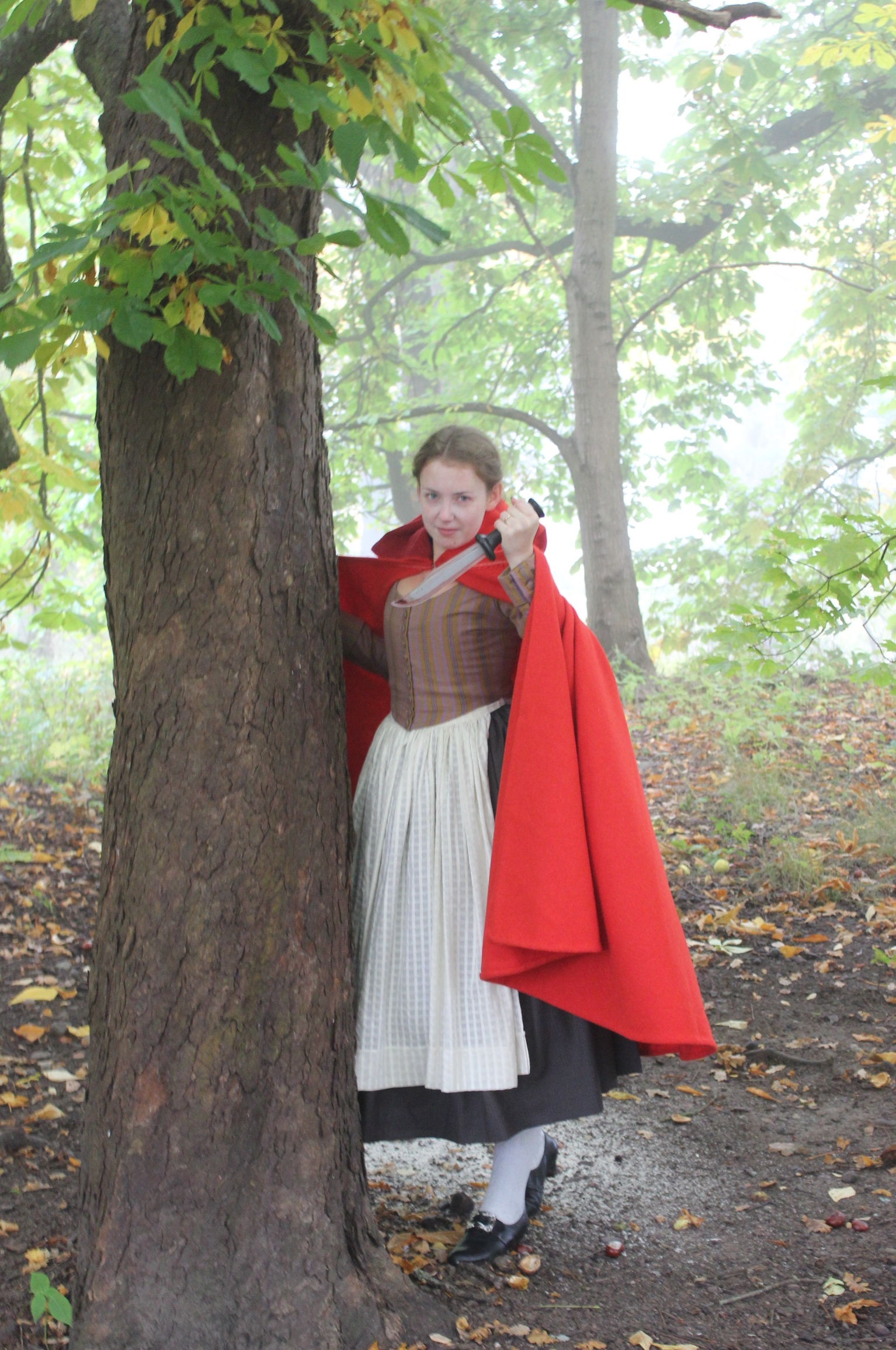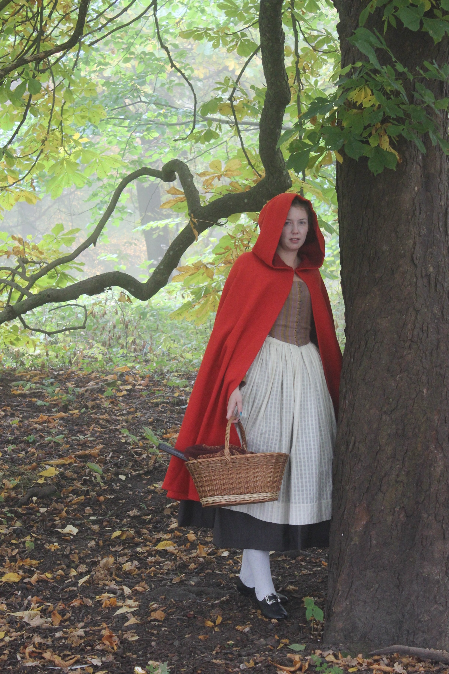 (Dressed in my 18th century Maids outfit paired with the riding hood cape, worn over stays, petticoats, stockings and reproduction shoes.)