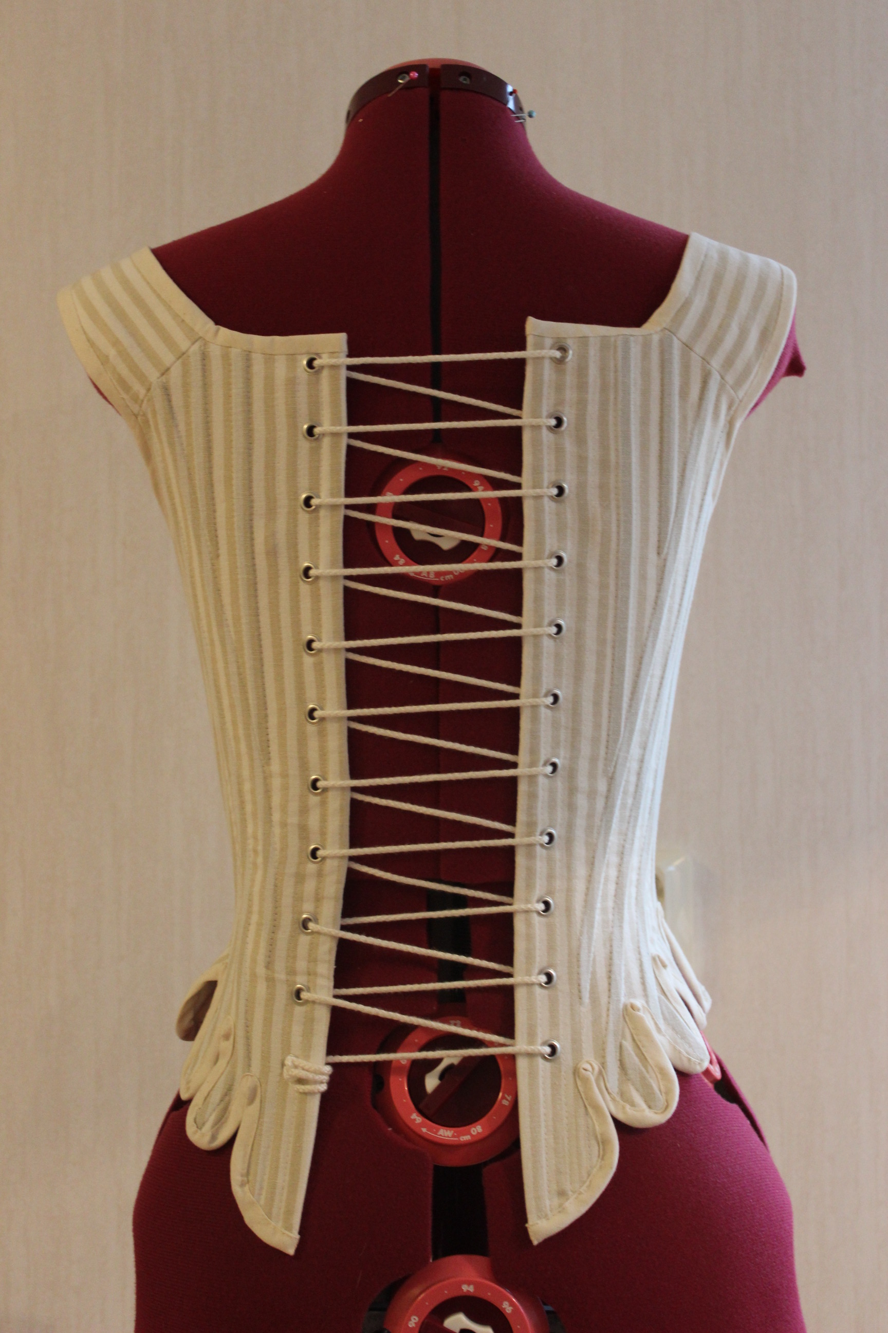 A 1880s corset made with busk, spiral steel and grommet.