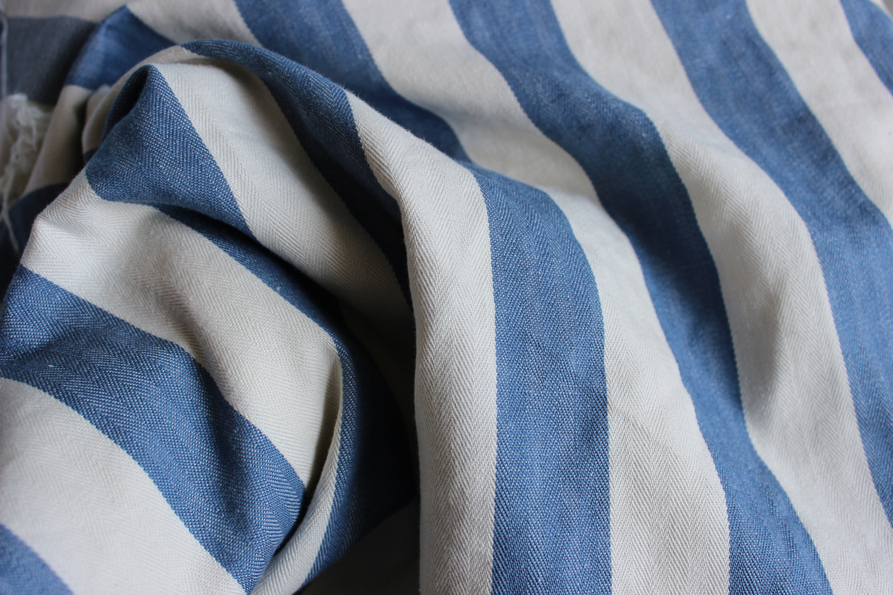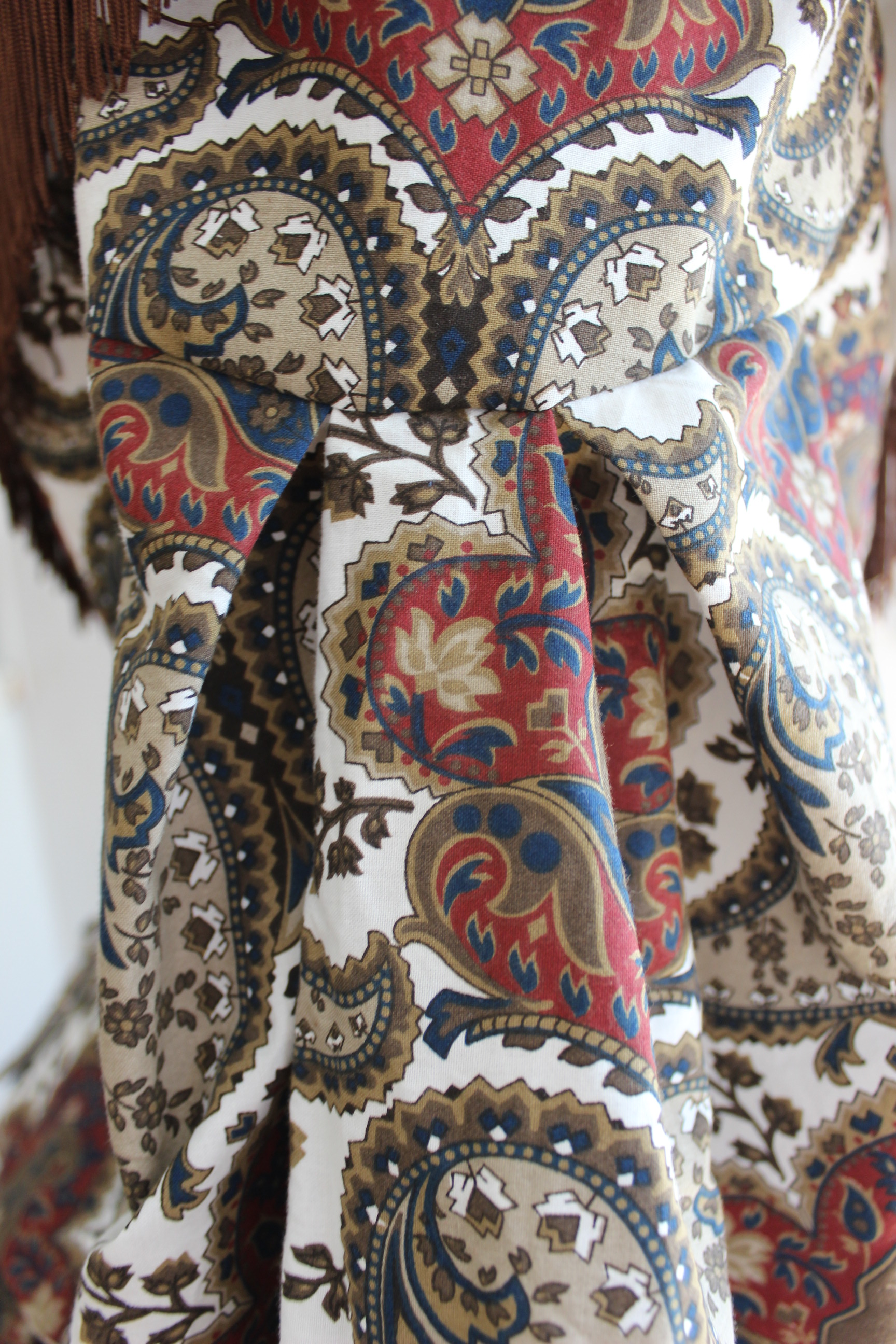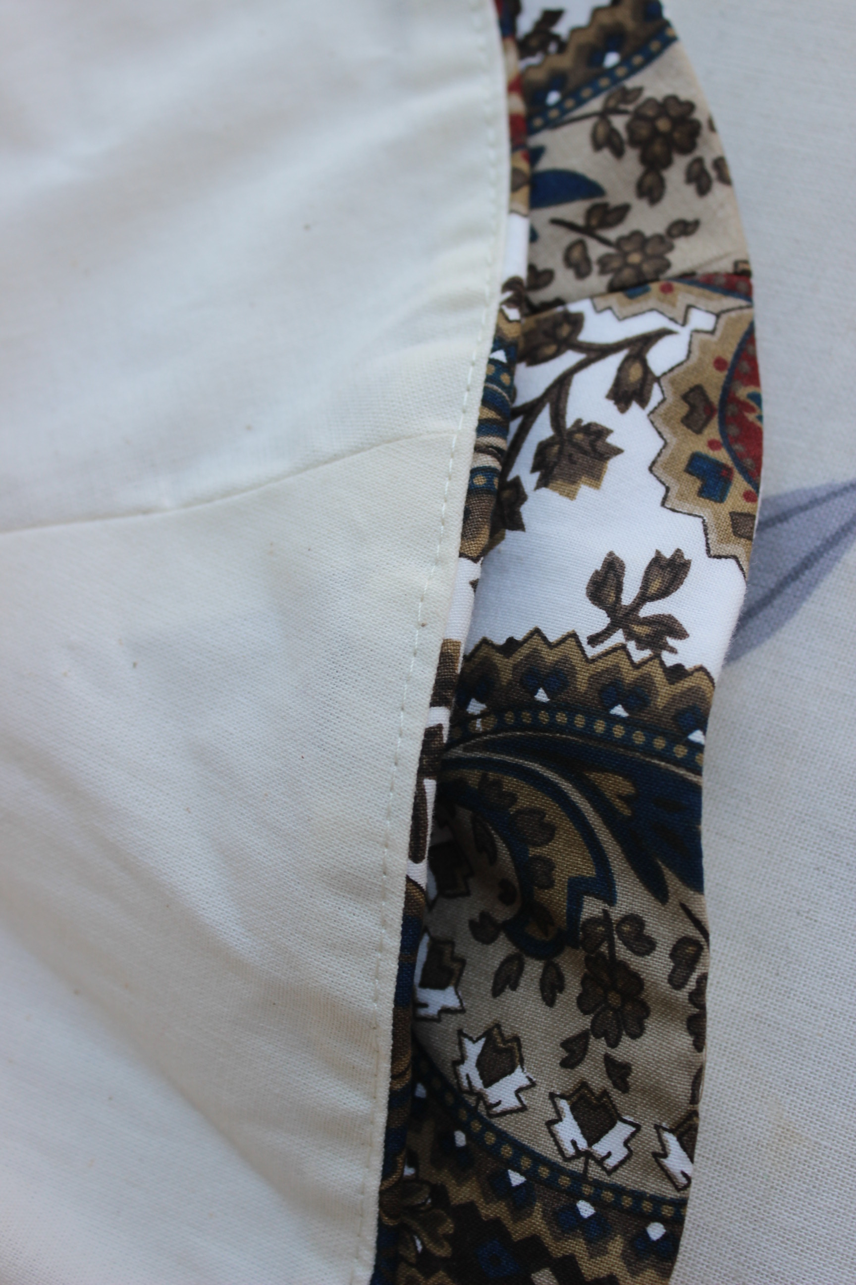 Fabric & Notions: 2 beige cotton sheets (150 x 200cm/each), thread, hook and eye for skirt closure, 6 m of tapestry braid and 2 m of pom-pom trim.