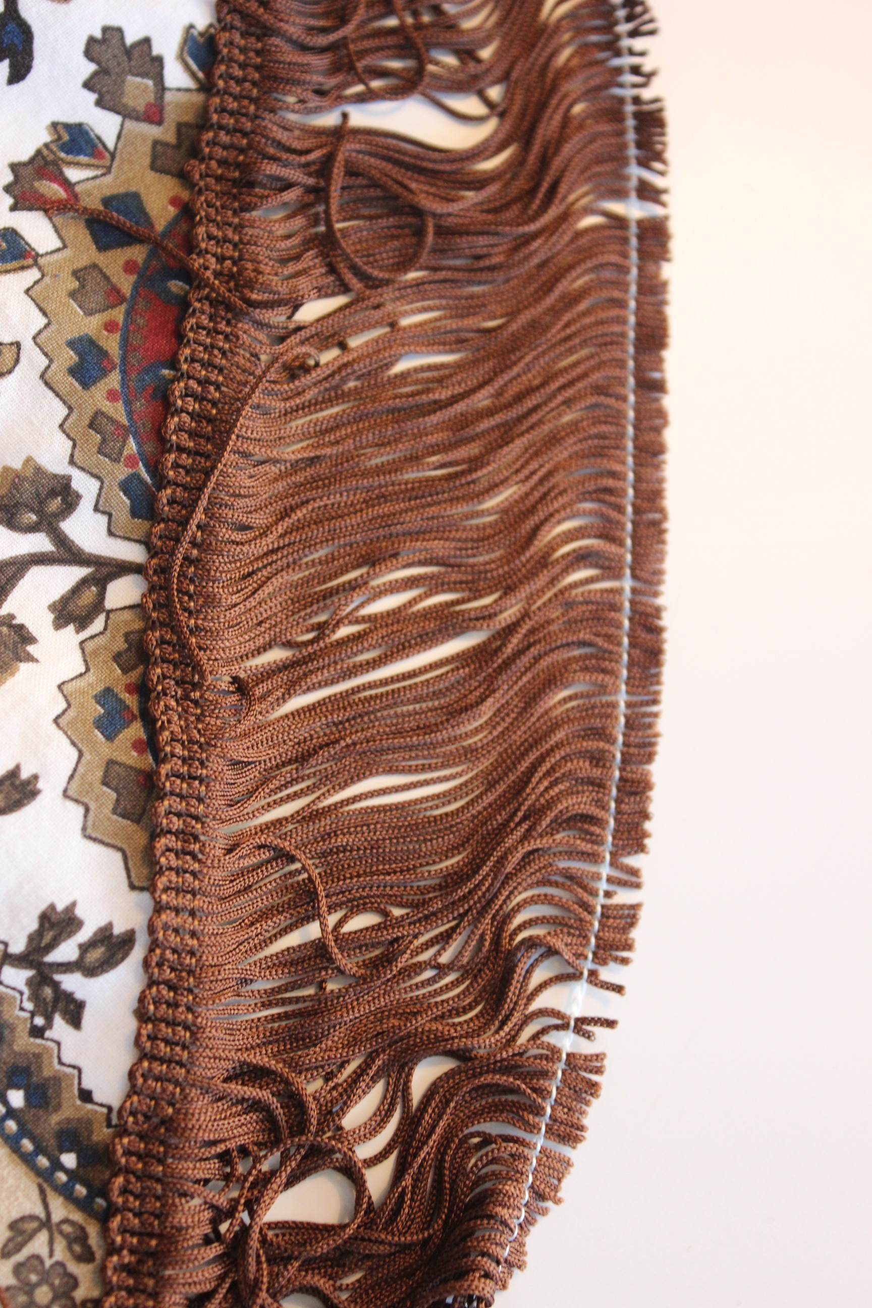 I used the same furniture braid as on the skirt combined with a brown pom-pom trim also from my stash.