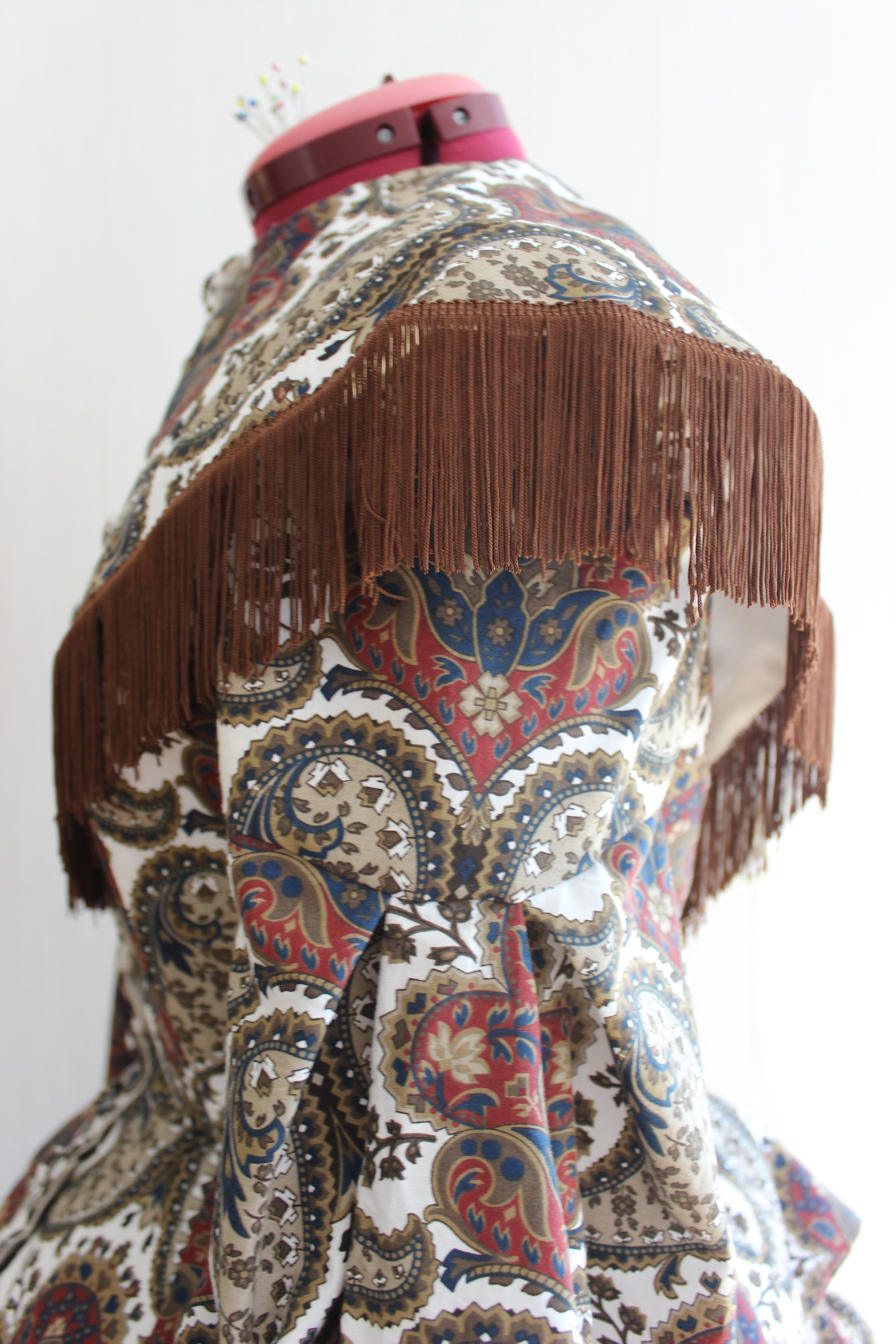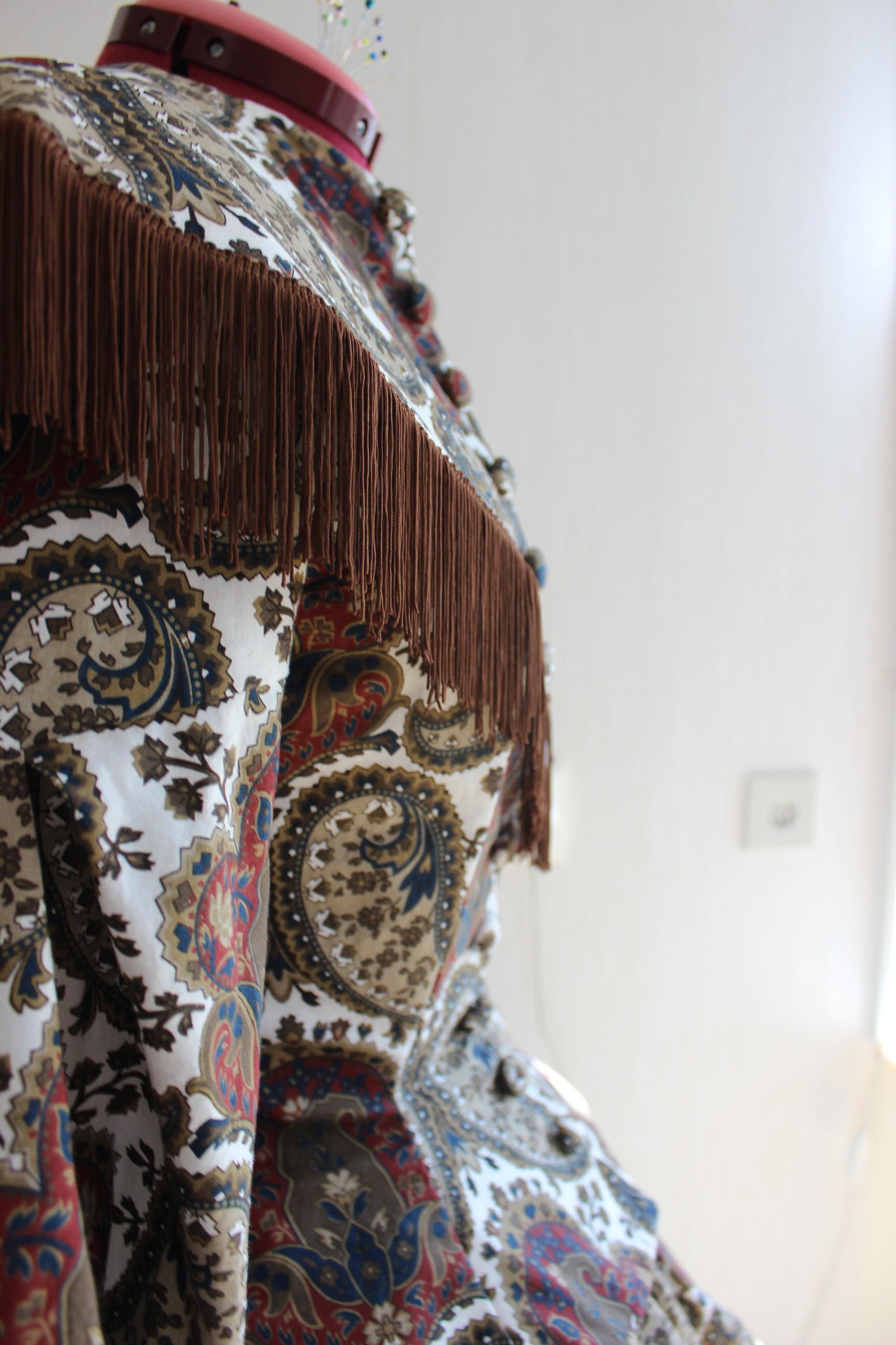 Once it was stitched and hemmed (after quick fitting) I added a singel row of braid around the bottom. Even though my insoiration din’t have one, I really liked the way t looked, and how it connected with the decoration to be made on the jacket.