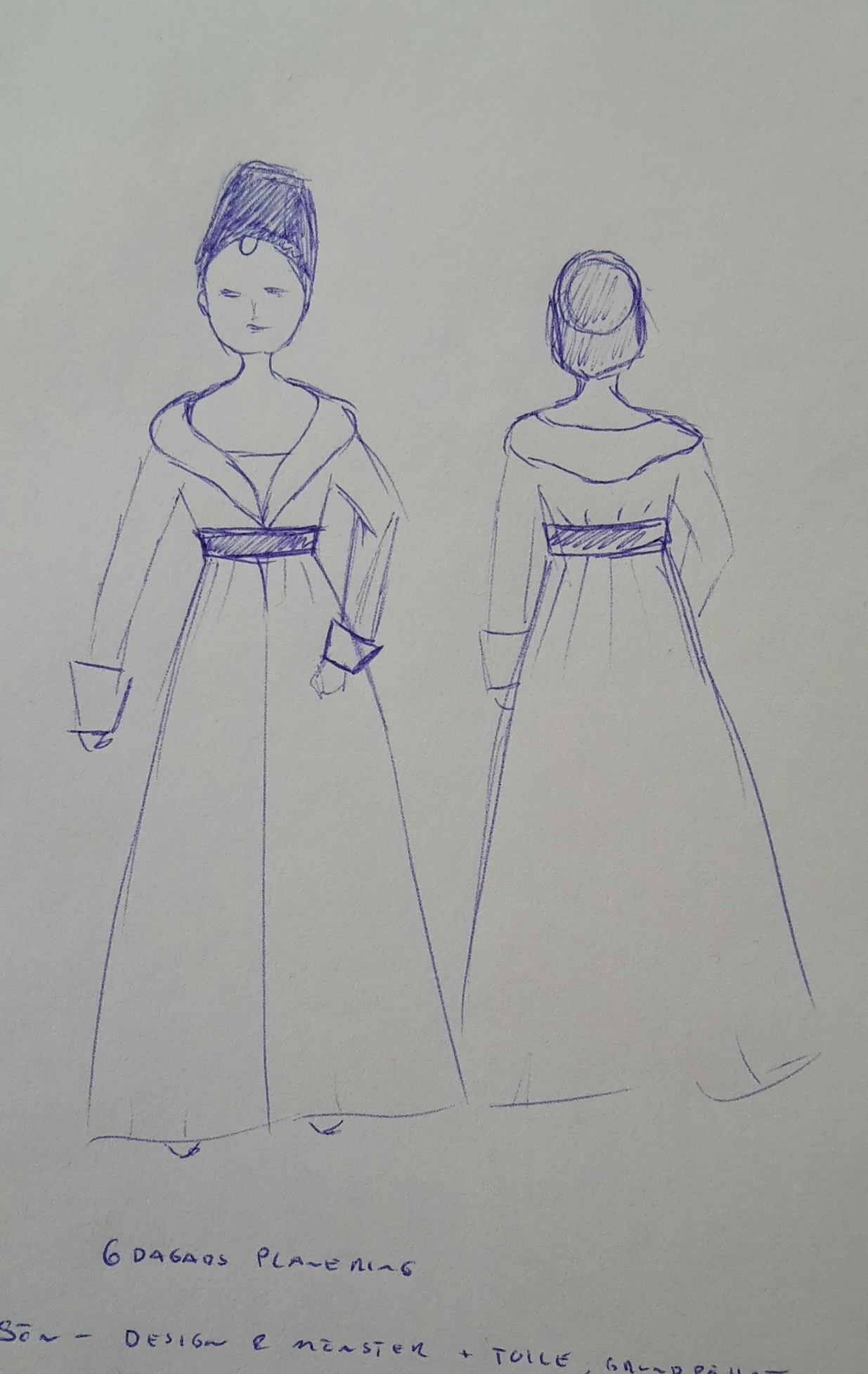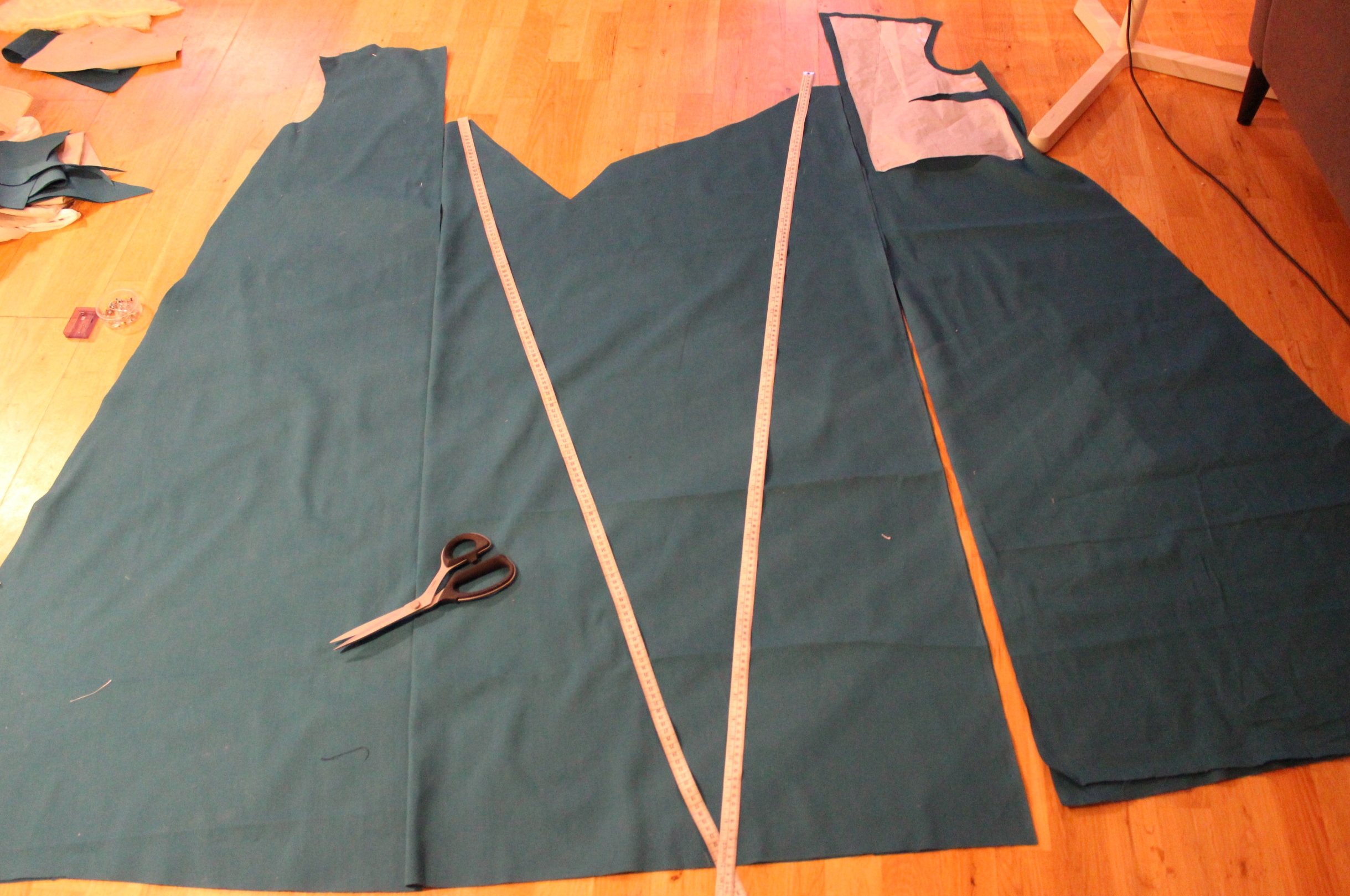 The dress should probably be made in lovely thin wool or heavy silk brocade to look it’s very best, but I’m convinced no one will notice our small budget, and if it men the dress is done in time and looks nice I think it’s the best choice to make.