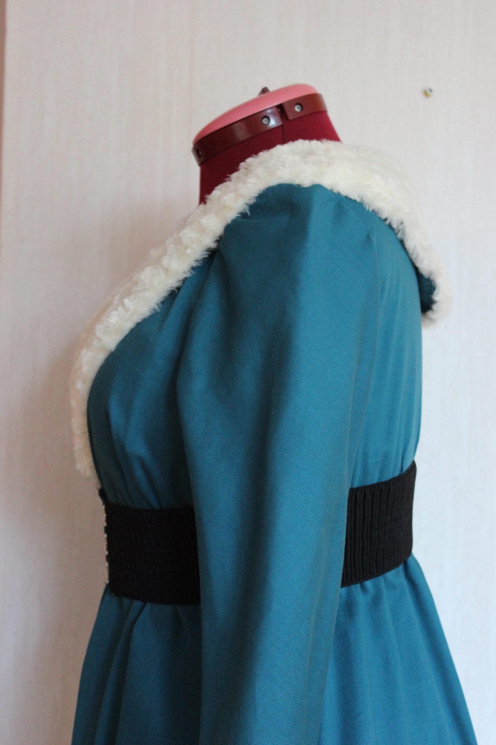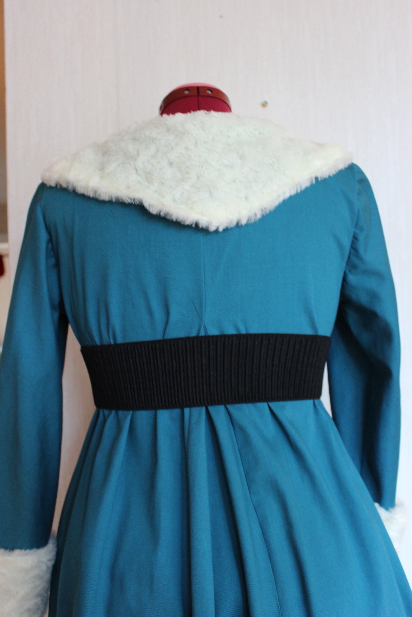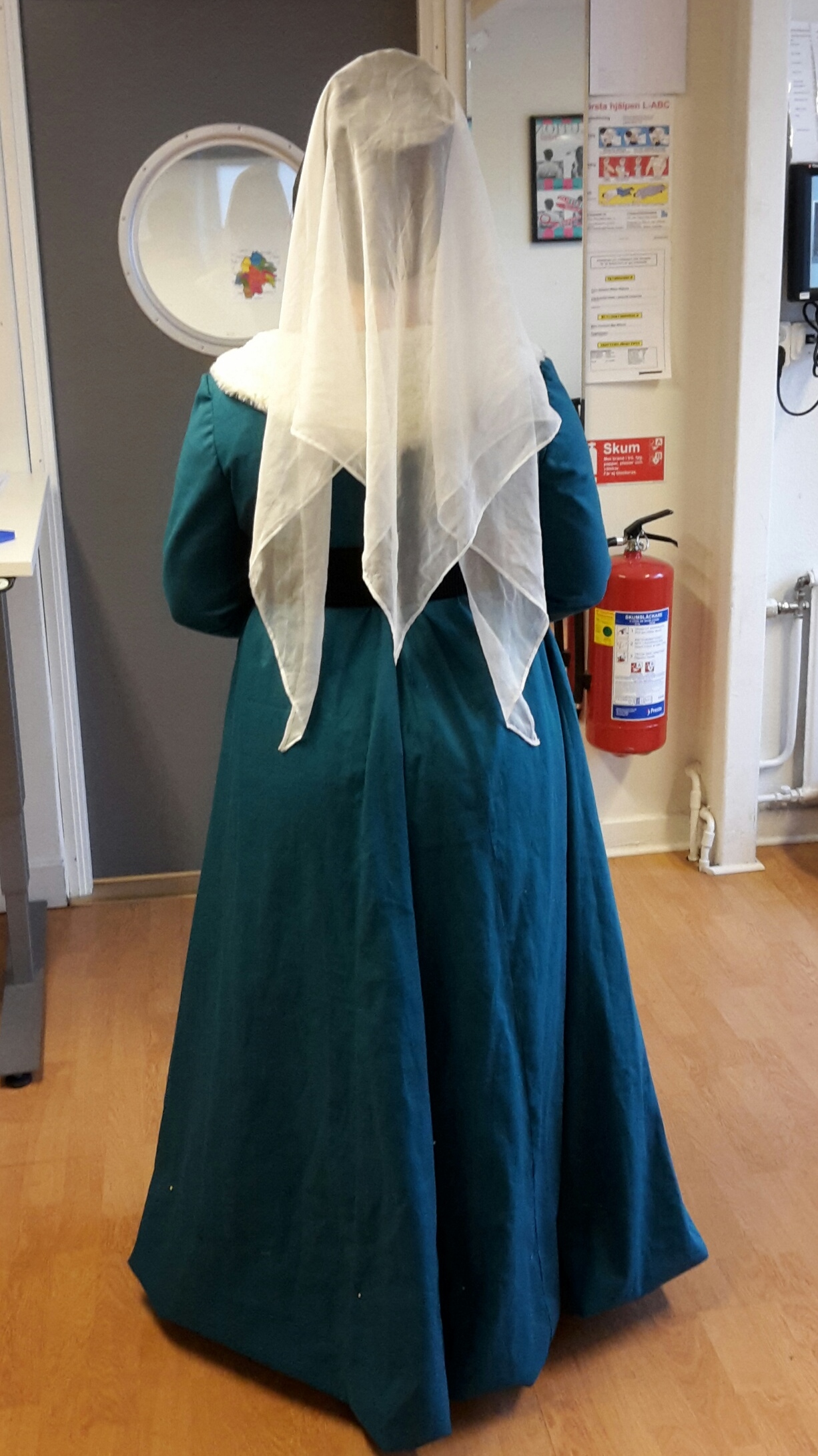Fabric & Notions: 4 m of teal cotton twill, 0,3m purple cotton twill for the stomacher, 0,3m white fake fur, and thread.