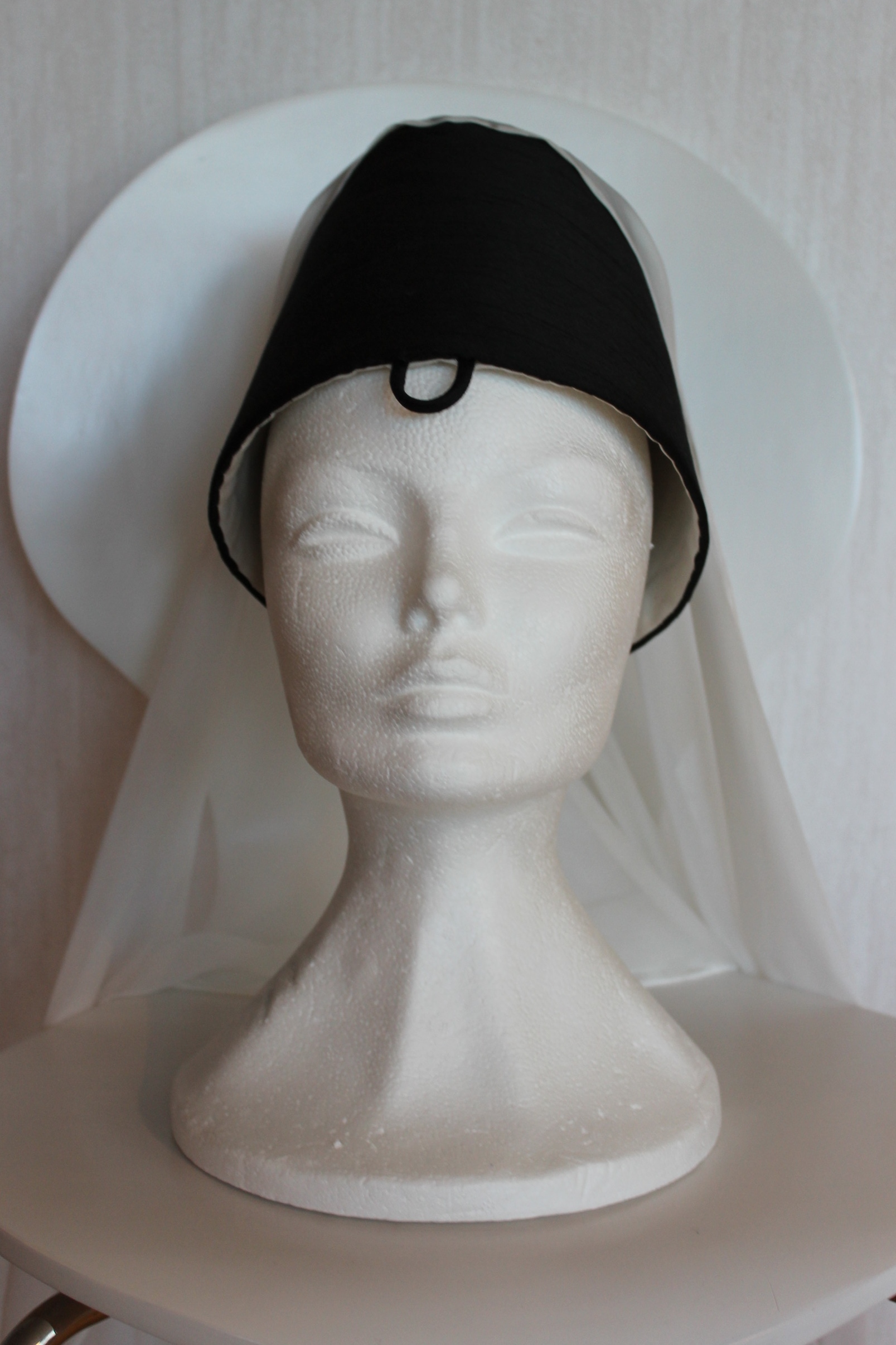 For the hat I used 0,3m black fake silk, 0,3m buckram, pieces of batting, cotton scraps for lining, 0,5m polyester chiffon for the veil (I used my 18th century fichu), 1m of millinery wire and thread.