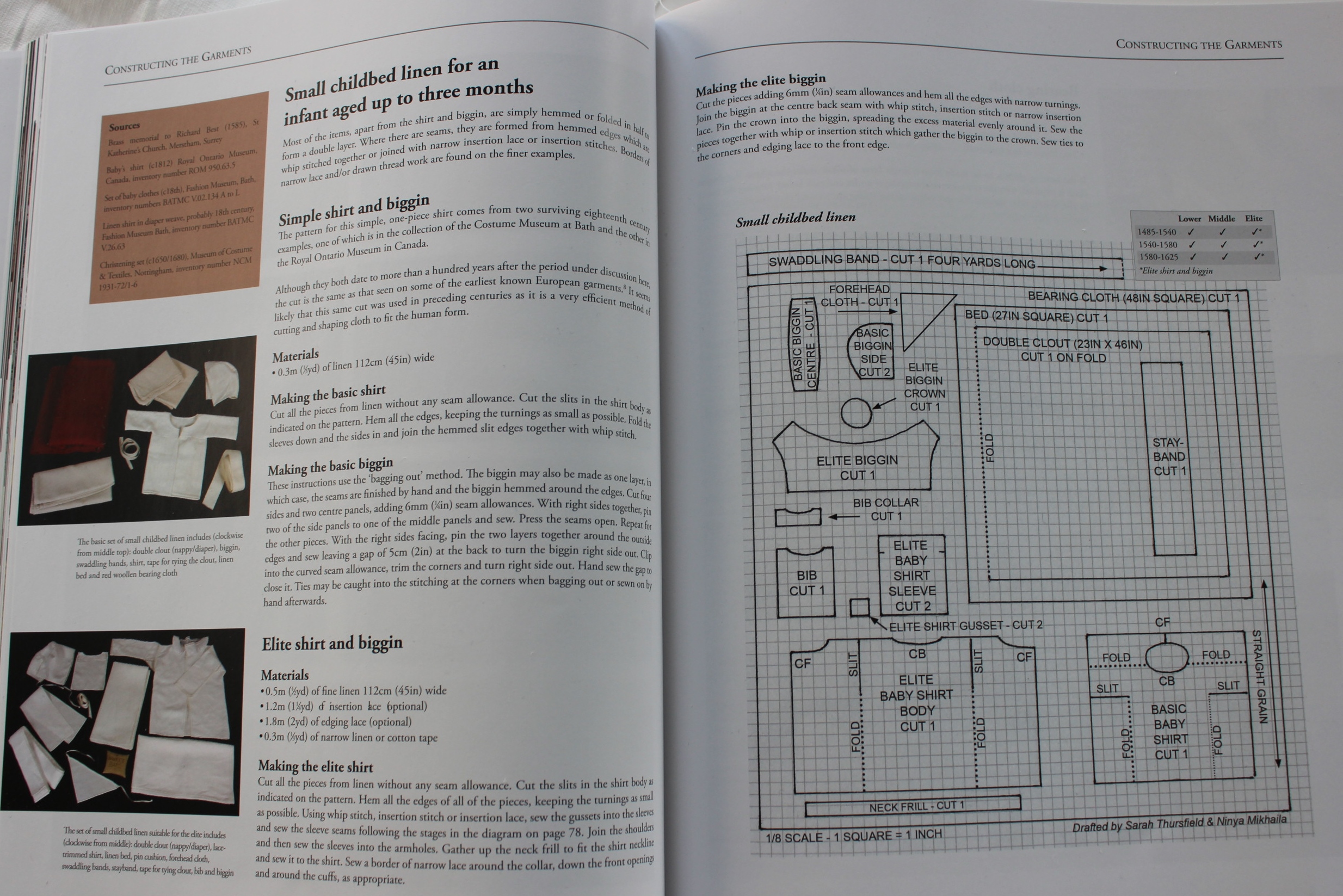 The book is about 230 pages, and contains several different costume pieces for both men and women like: Underwear, outerwear, gowns, dubblets, hoses, headwear, childrens clothes and accessories.