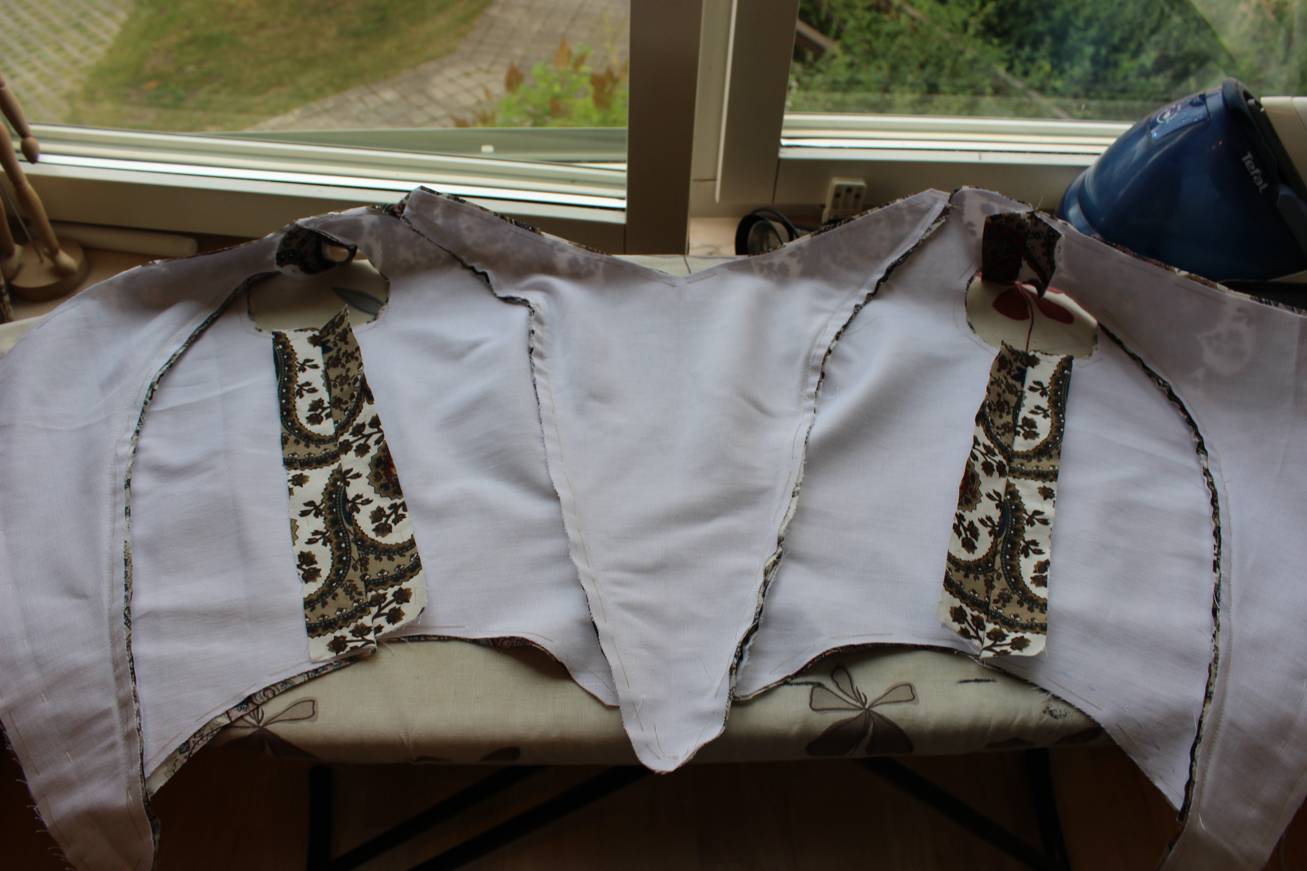 The piping serves to give the garmnent a more finished and historical look, and at the same time makes the eye accept the breaks in the print better. So apart from the extra work making and putting them in, it’s a win win situation.