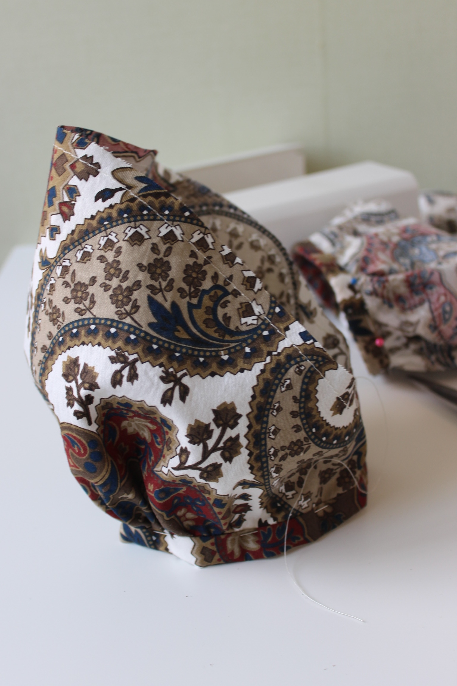 After cutting all the layers out, I basted the twill to the paisley, and started to sew the pieces togeter.