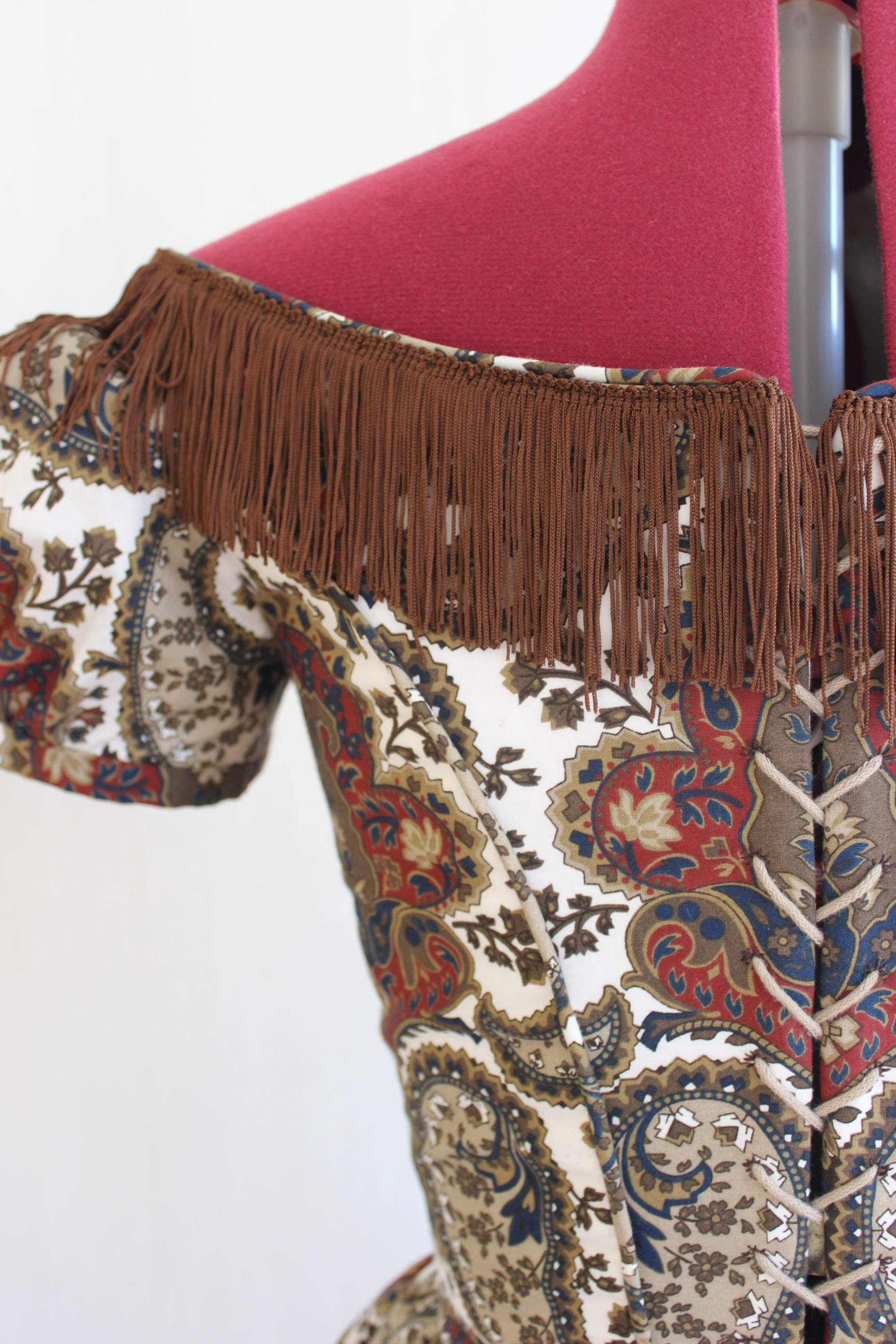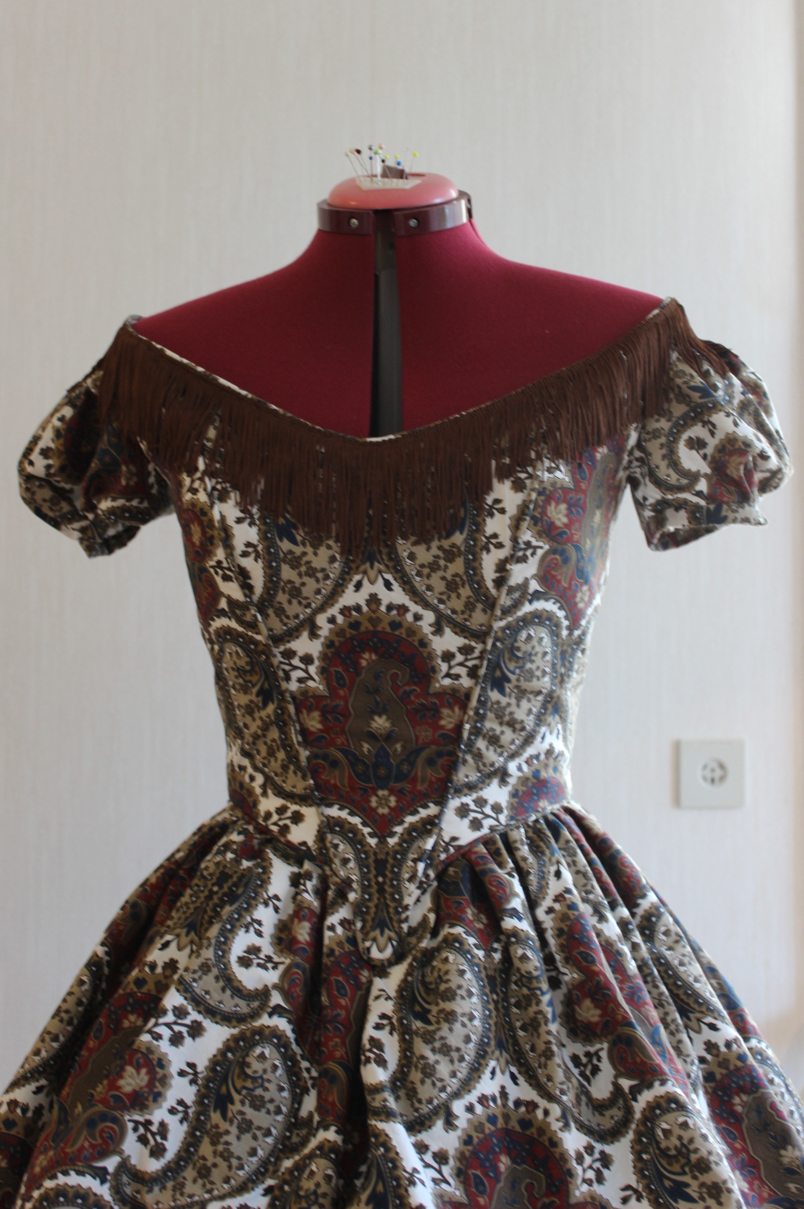 Notions: Jacket – Thread, 3 m of plastic boning, 3 m of self mde bisatape, 12 buttons, 14 pair of hooks adn eyes, 1,5 m of brown fringe. and only thread and hook and eye for the skirt.