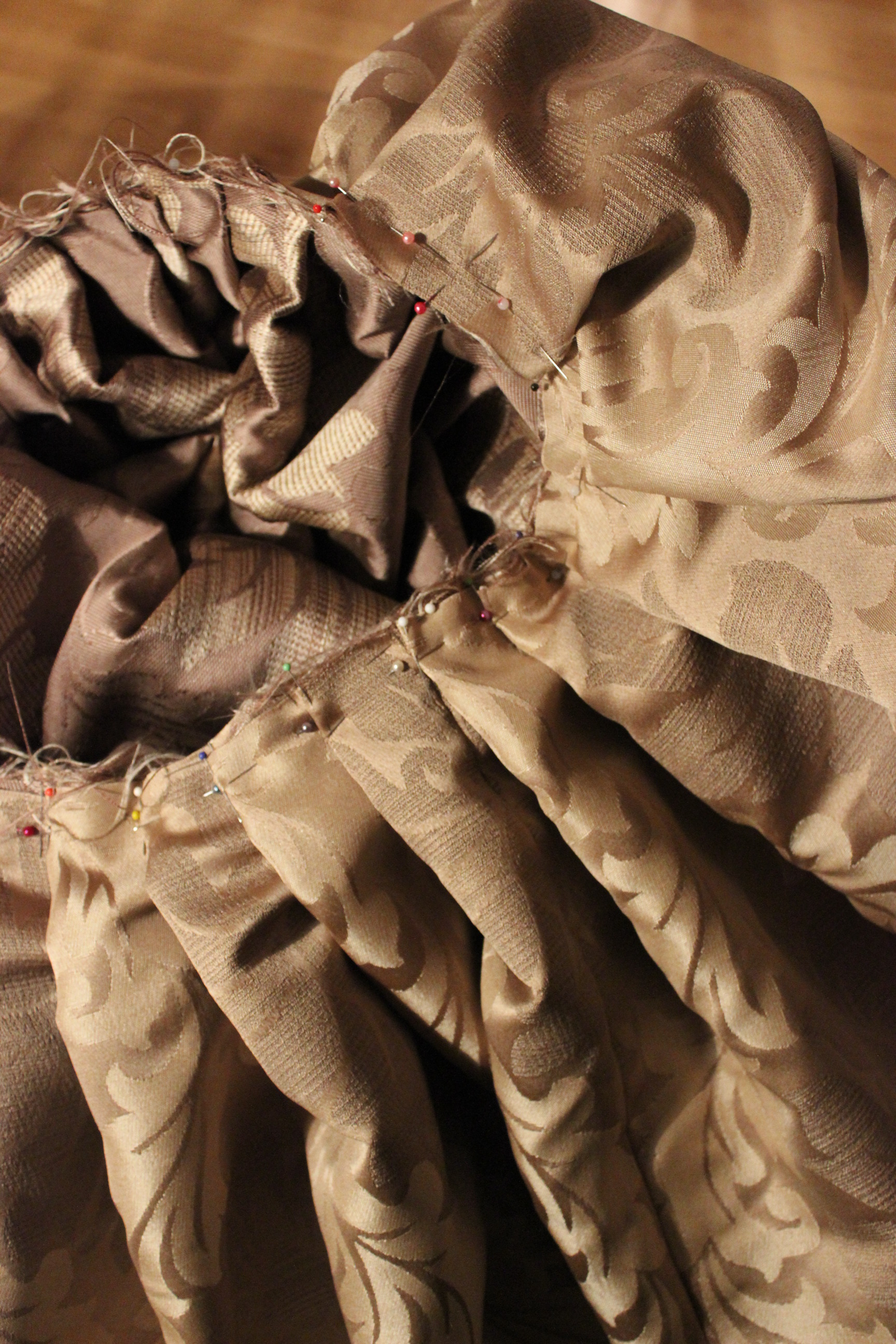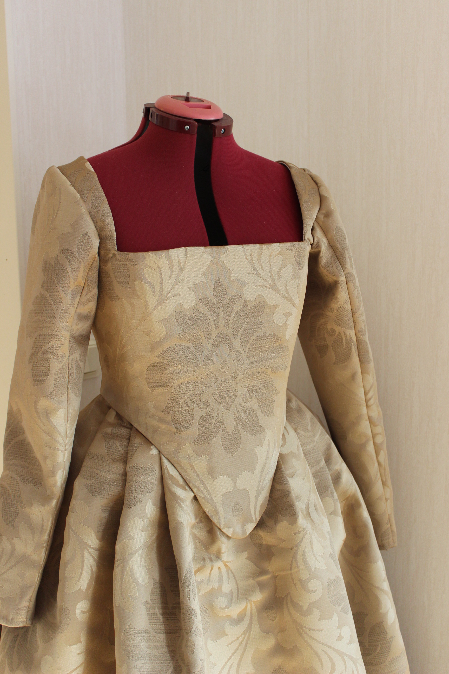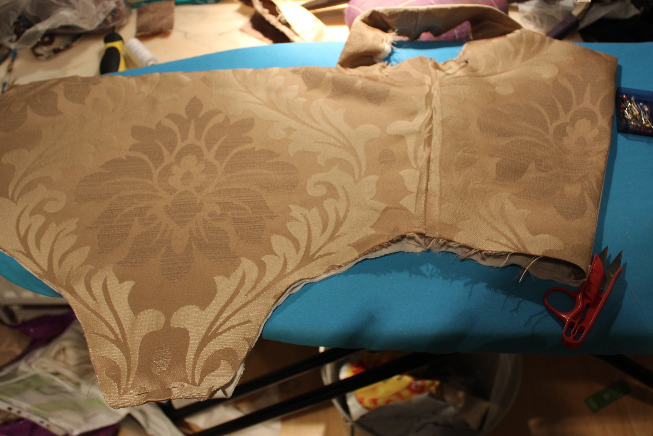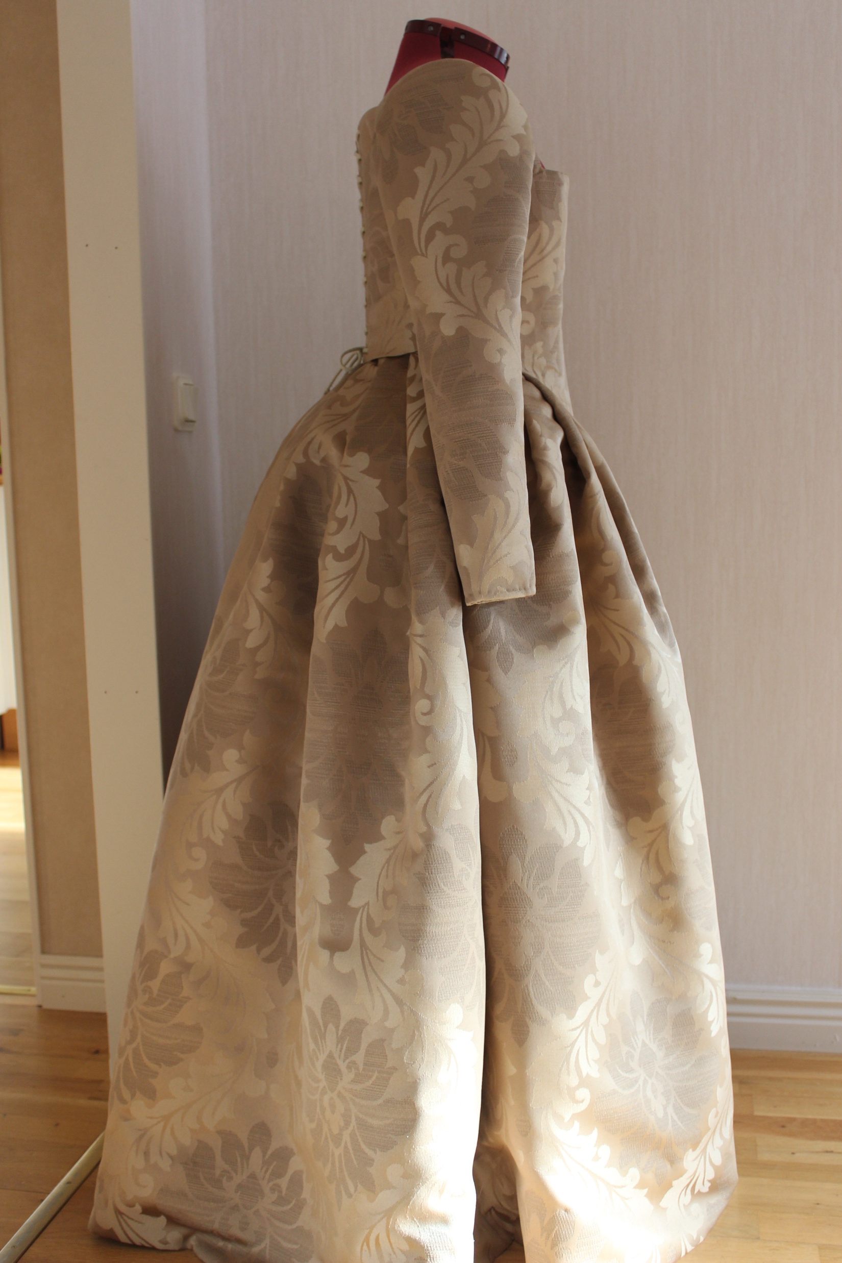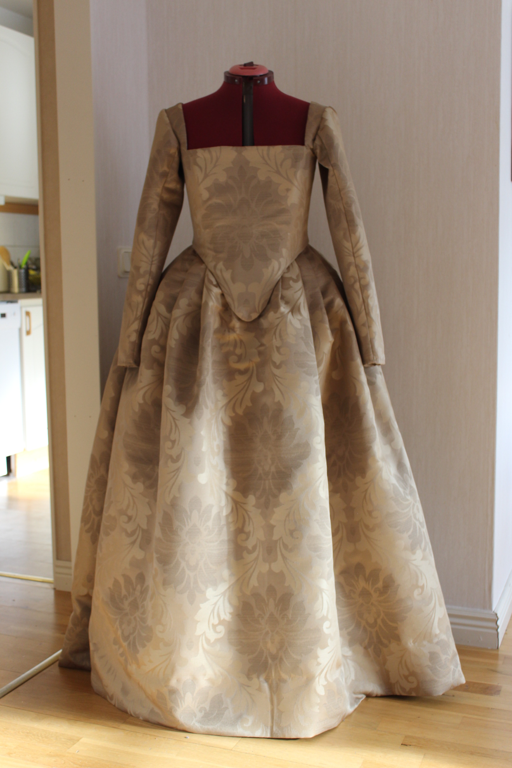Fabric: 4,5 m of golden polyester furniture brocade/damast, 1 m white cotton for lining and interning the bodice.