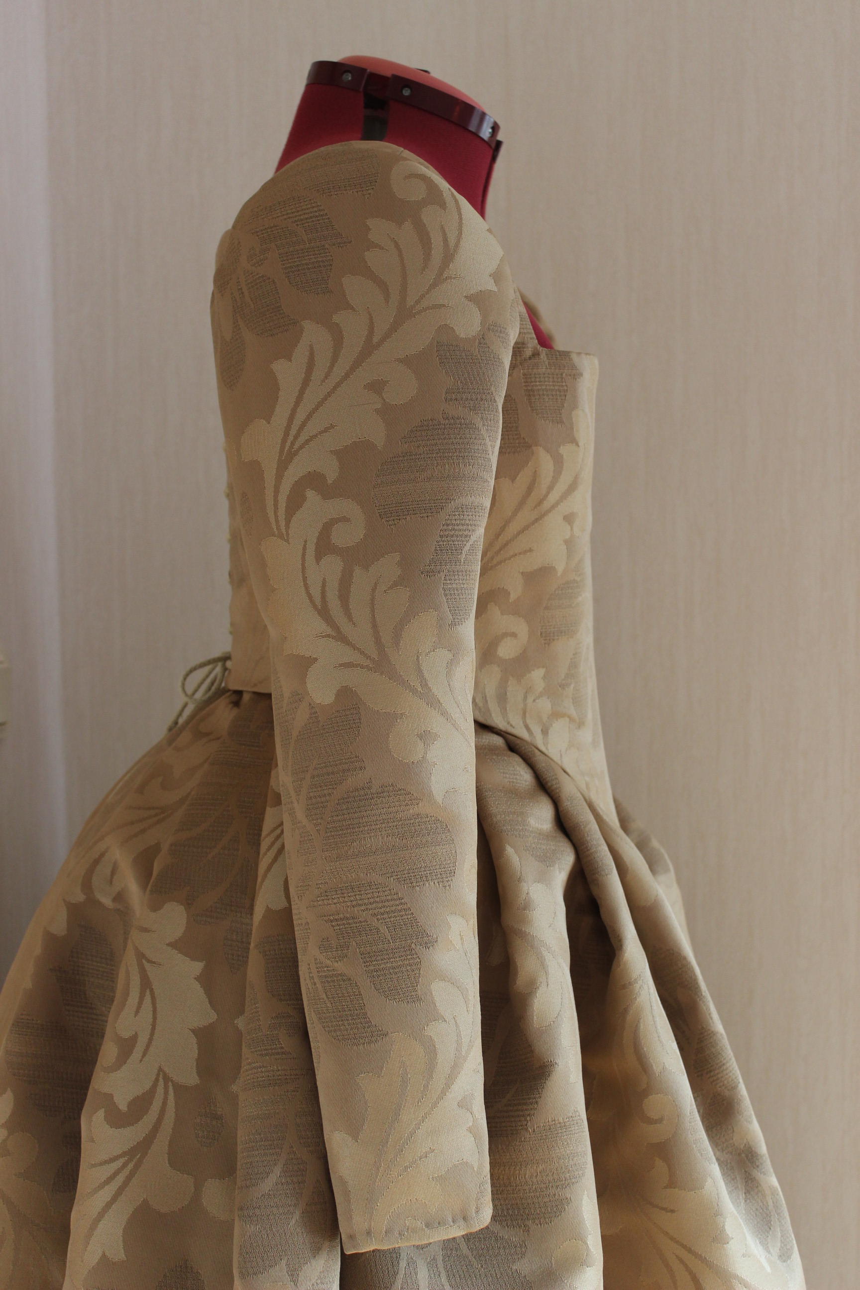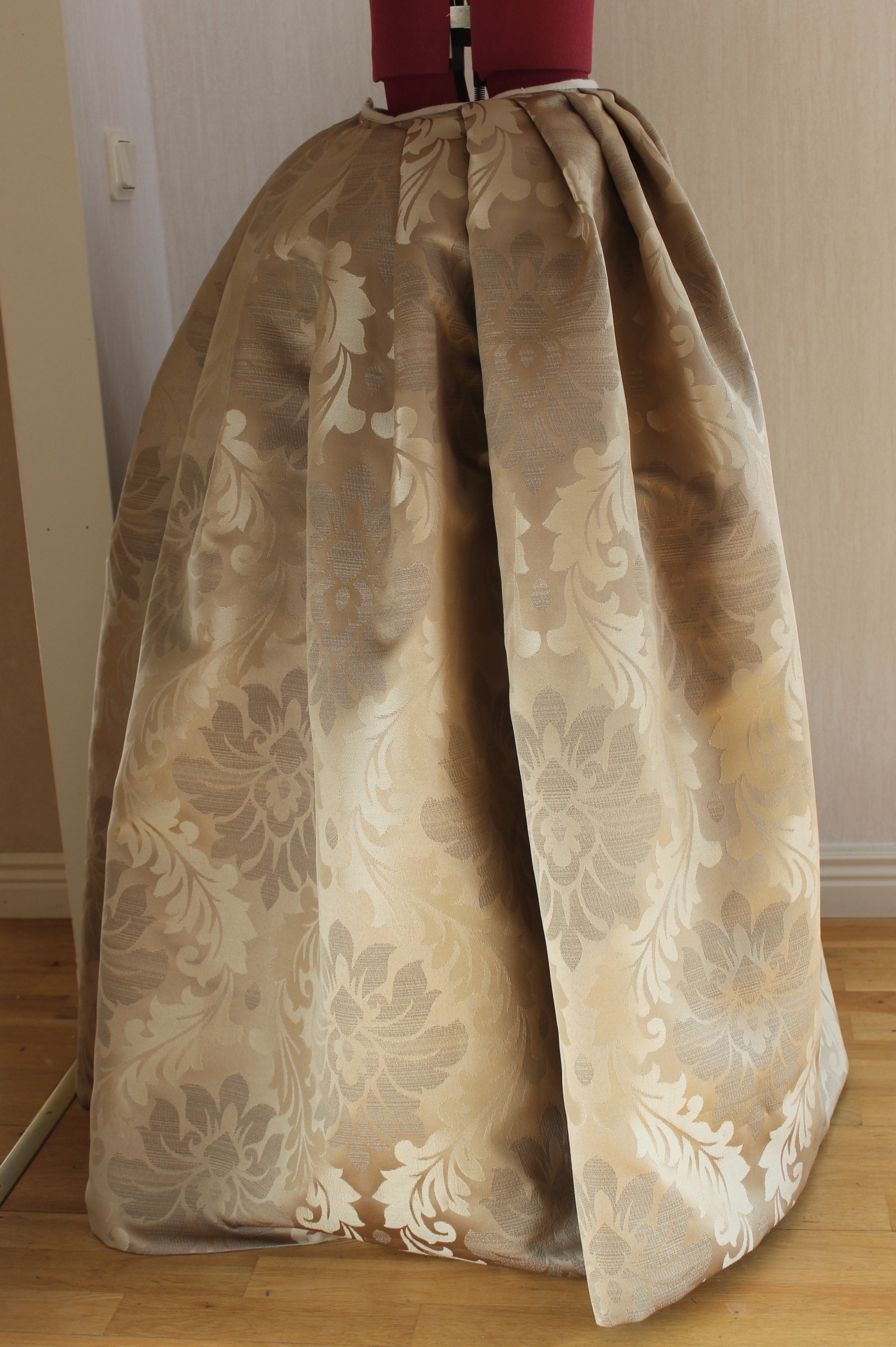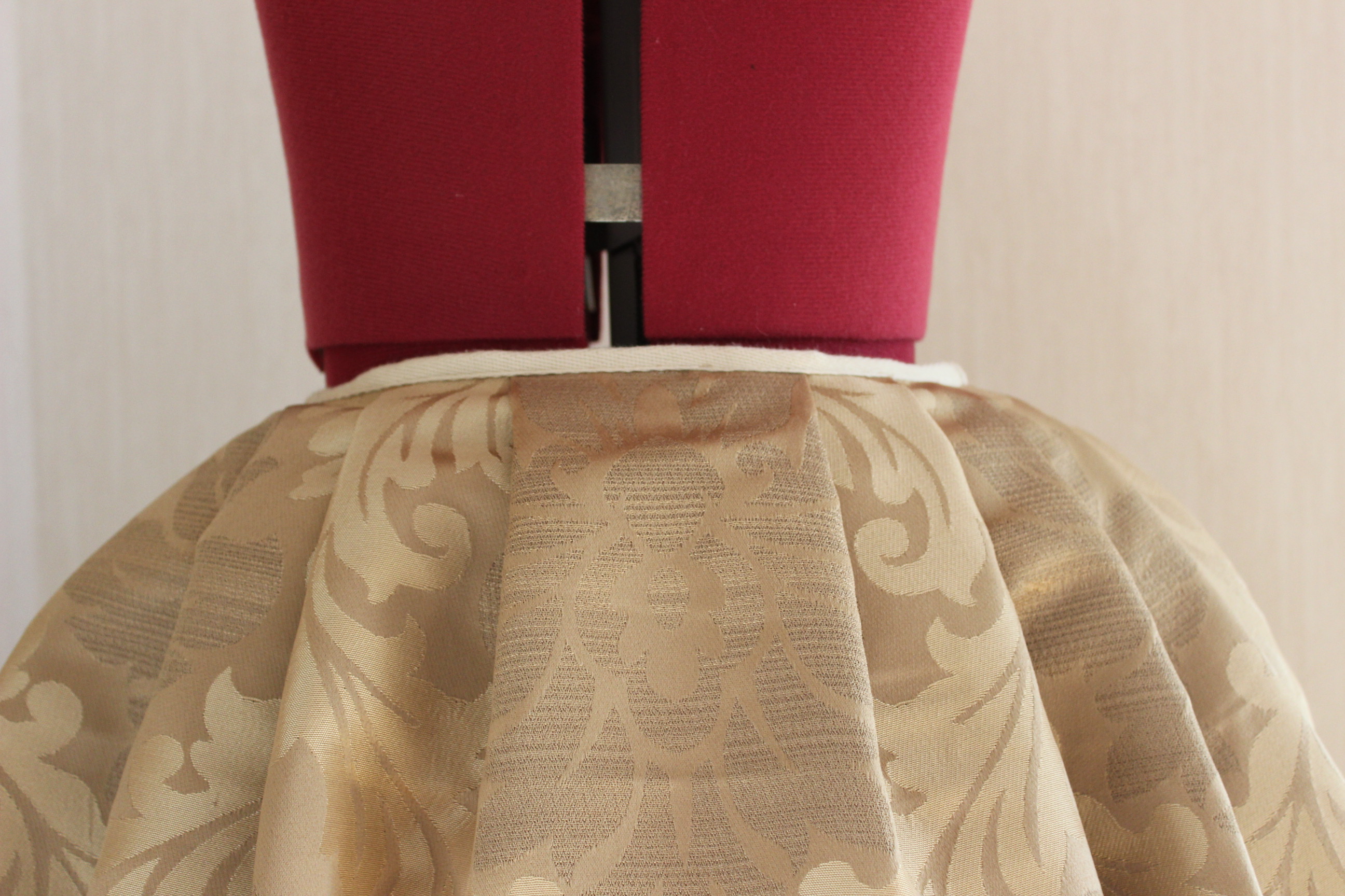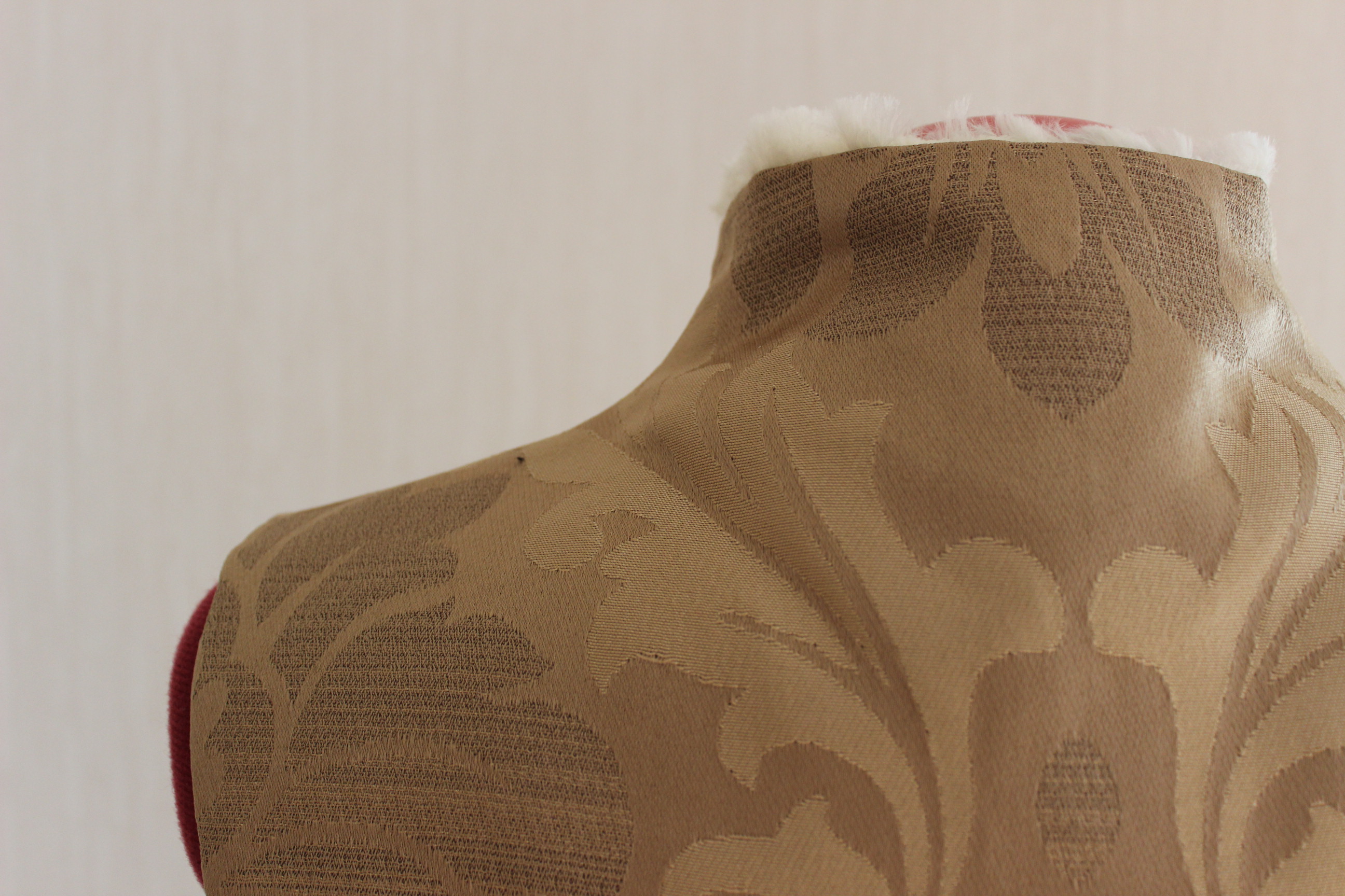 Fabric: 4,5 m of golden polyester furniture brocade/damast, 1 m white cotton for lining and interning the bodice.