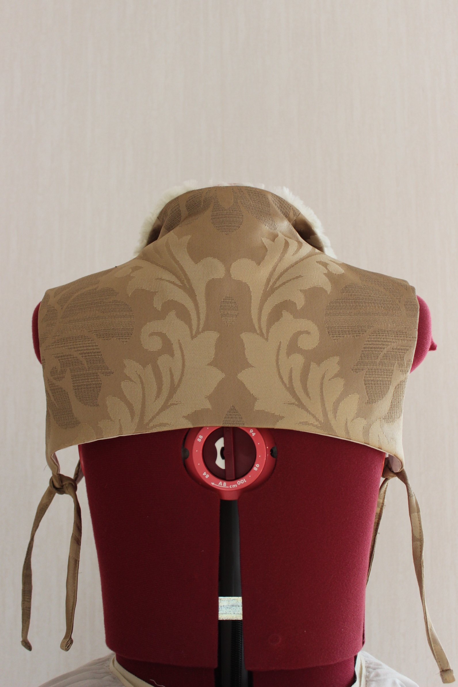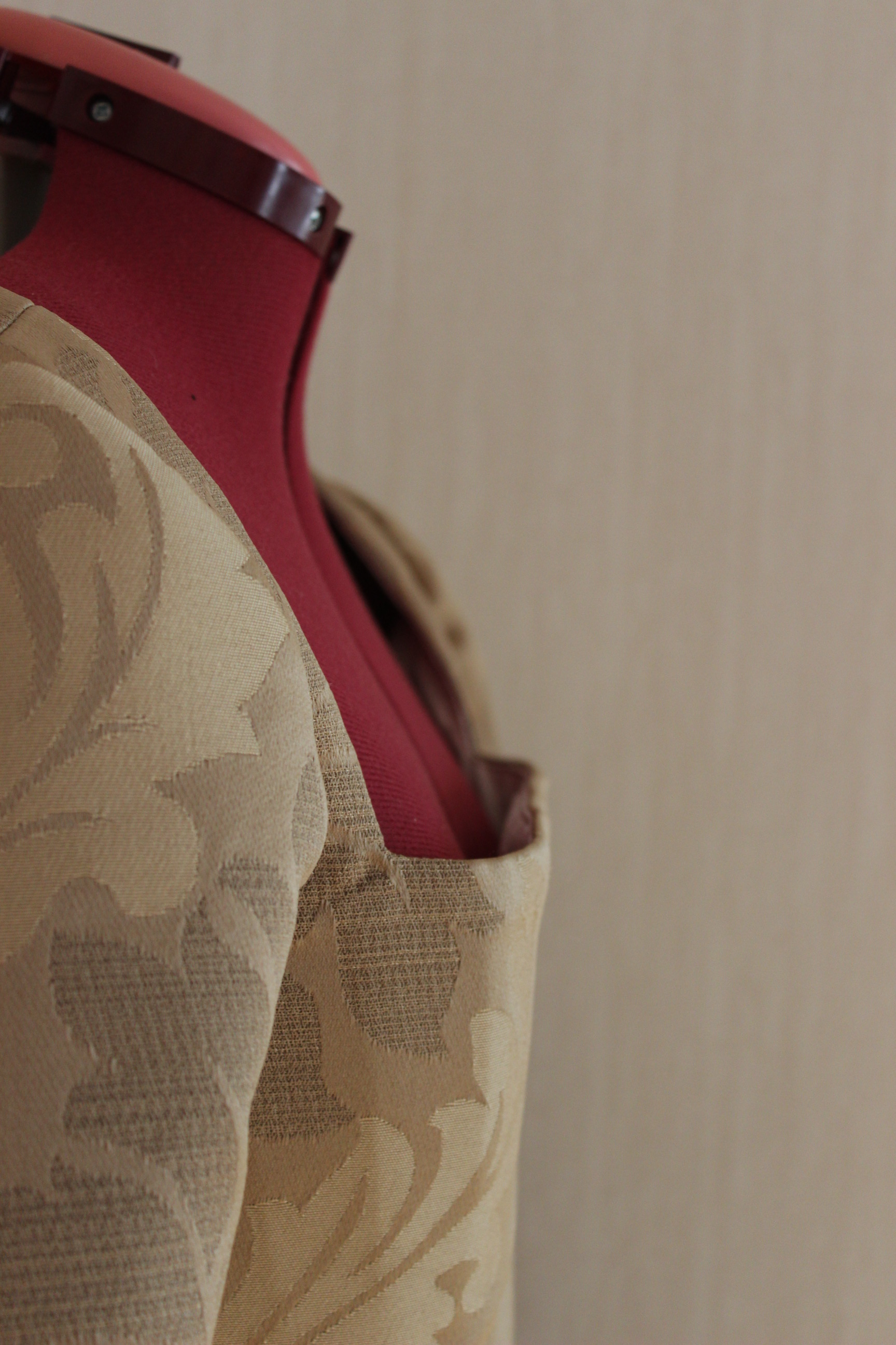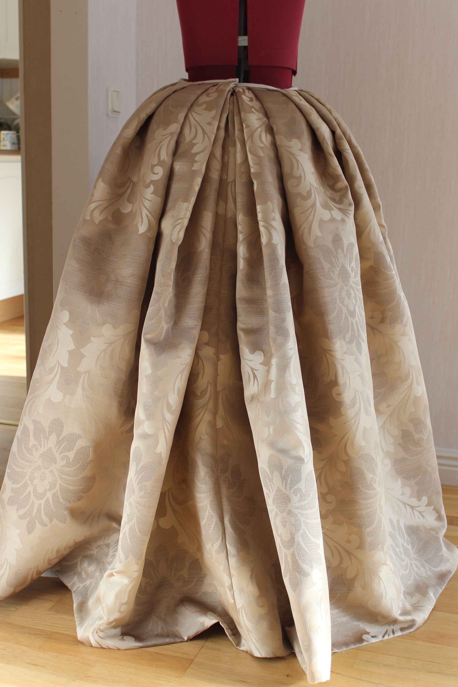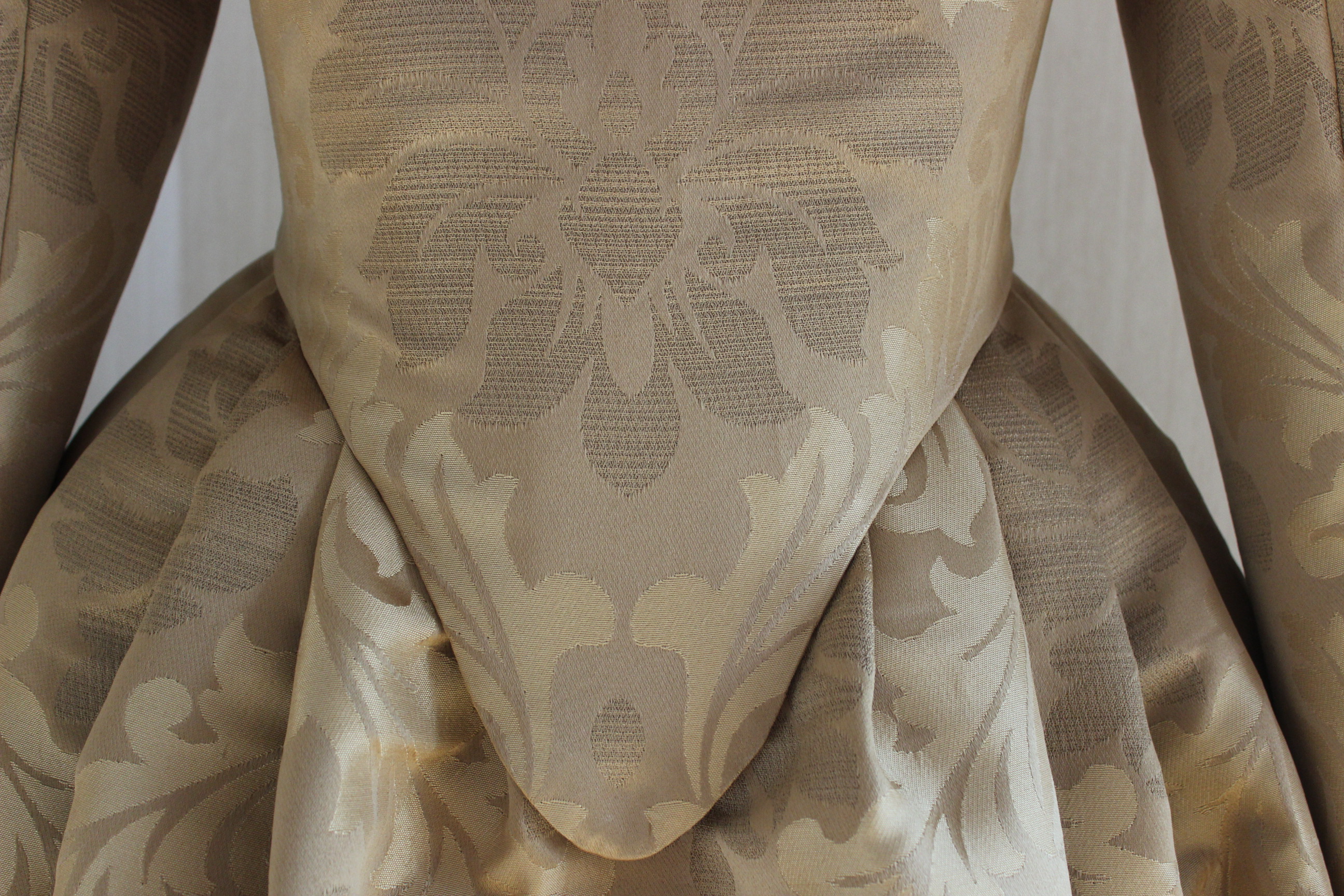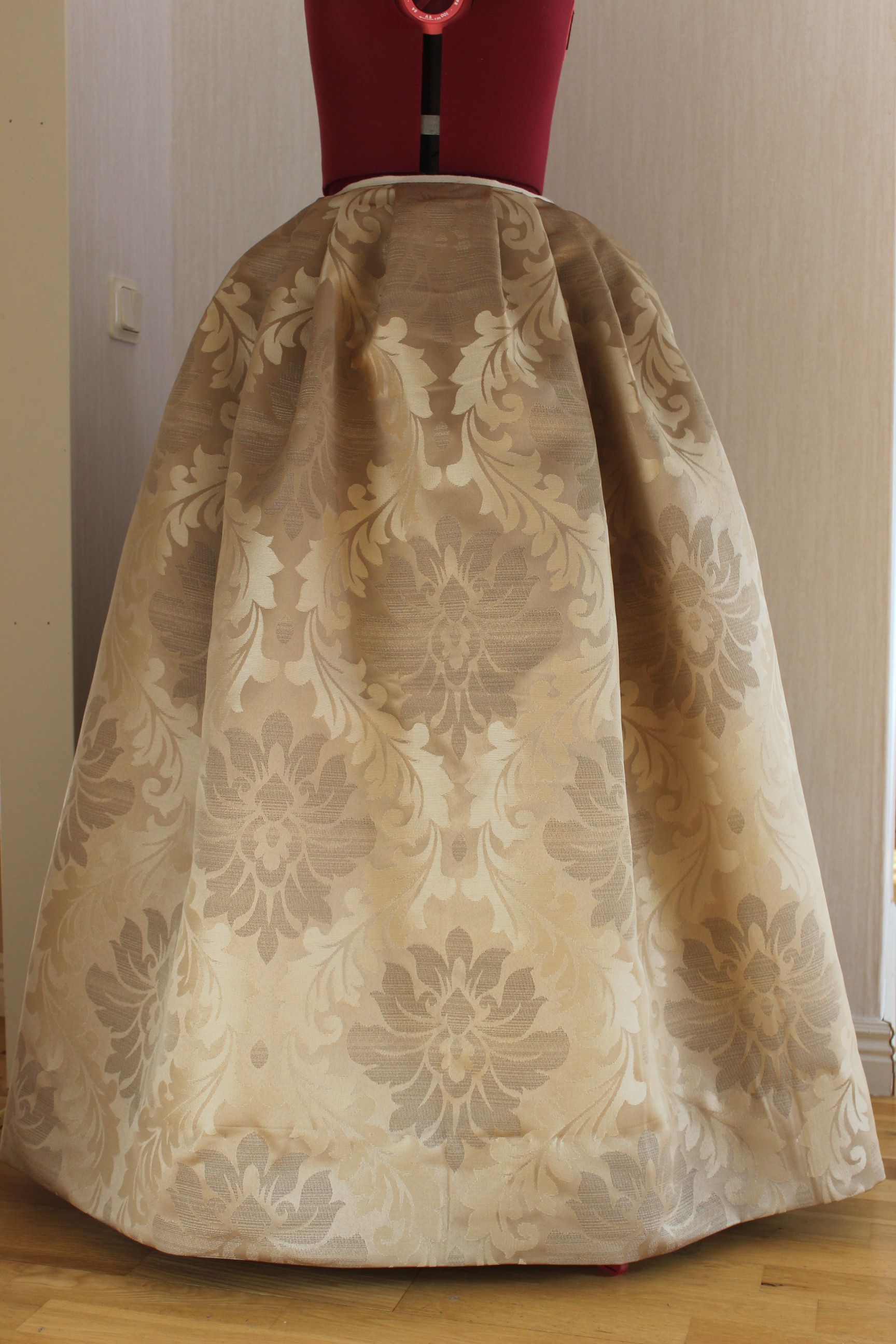Fabric: 4,5 m of golden polyester furniture brocade/damast, 1 m white cotton for lining and interning the bodice.