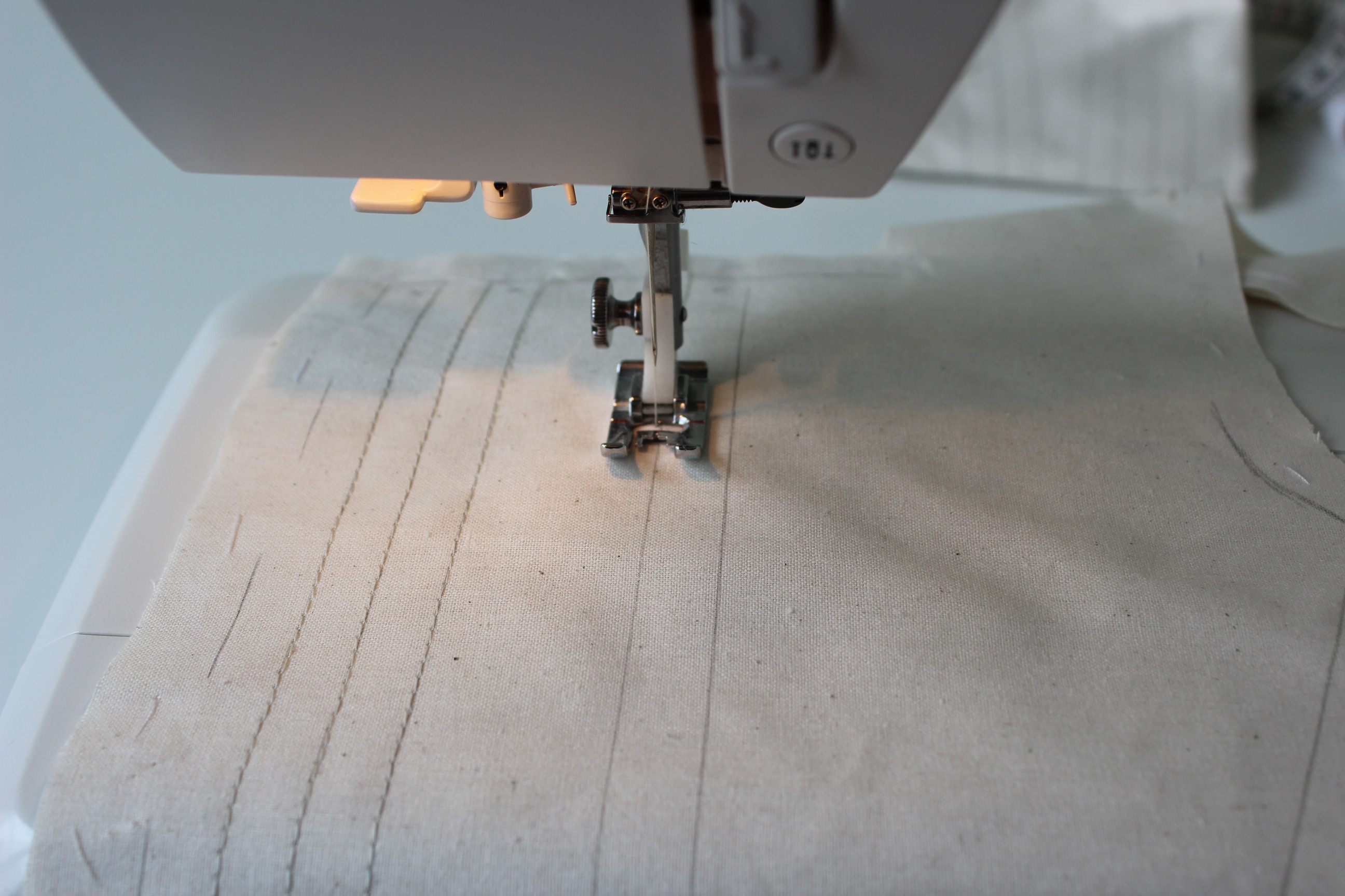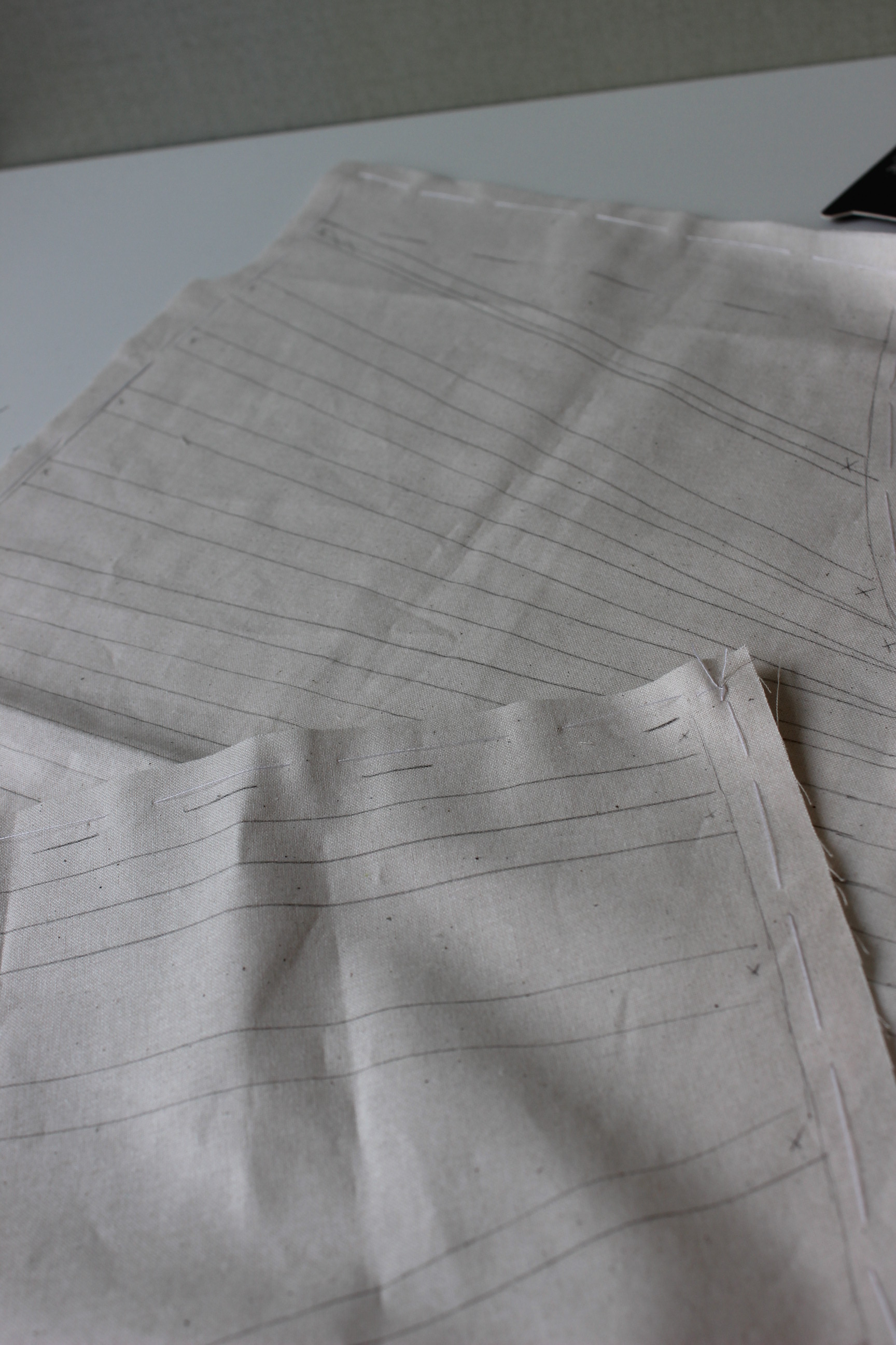 I started by marking and stitching the boning channels to the interlining and lining, after basting hem together.img_0400